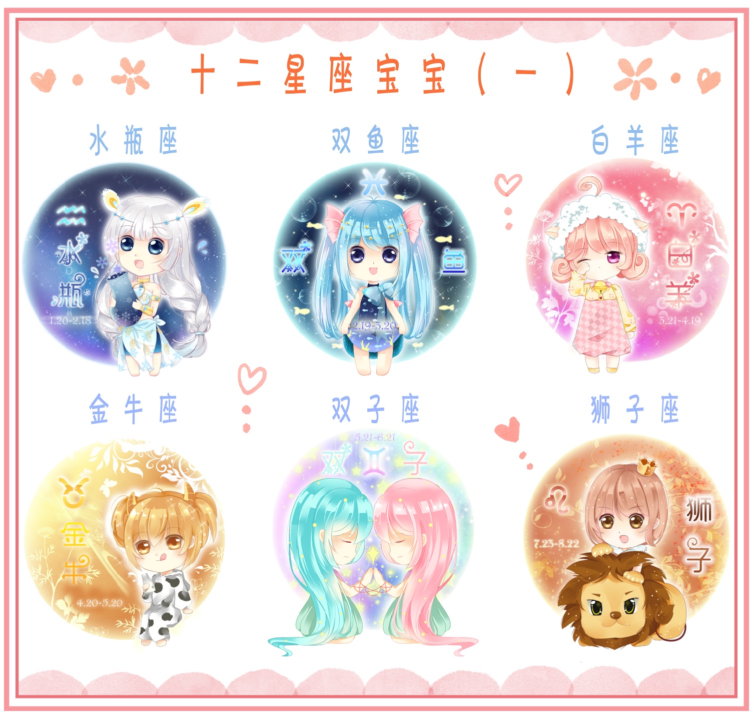 这次有六位星座宝宝—水瓶,双鱼,白羊,金牛,双子,狮子~不知道这里面有没有你的星座呀(。・ω・。)ノ♡余下的六位星座宝宝明天会发上来╰(*´︶`*)╯
