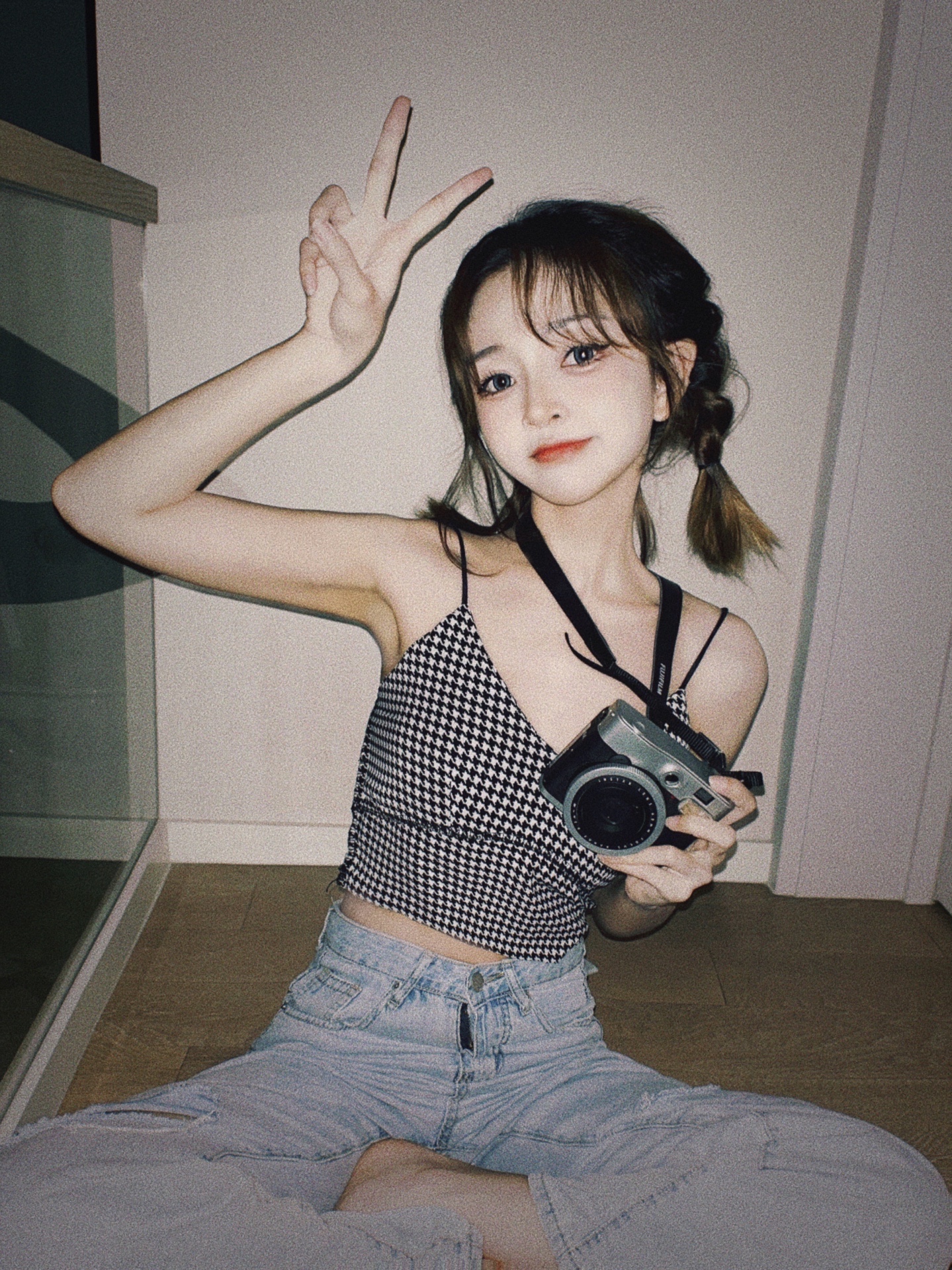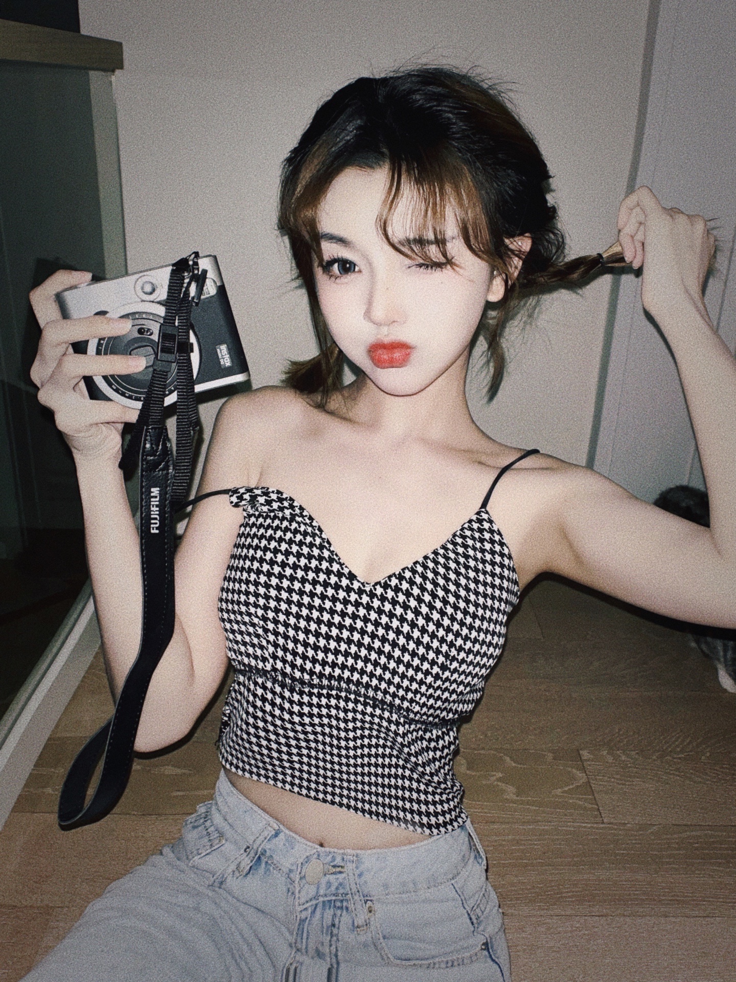 首先穿个小吊带,像我一样扎个港风小麻花辫~