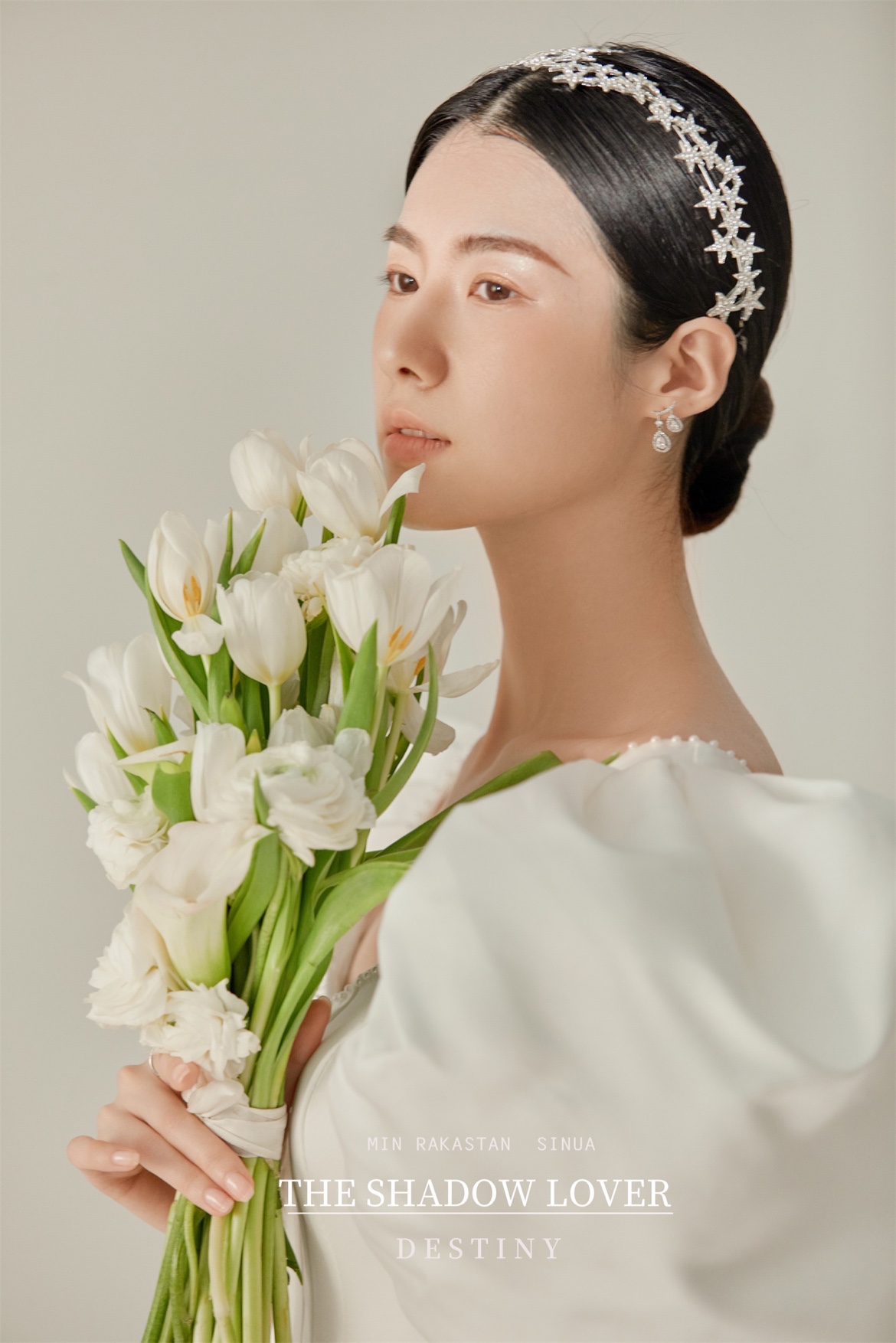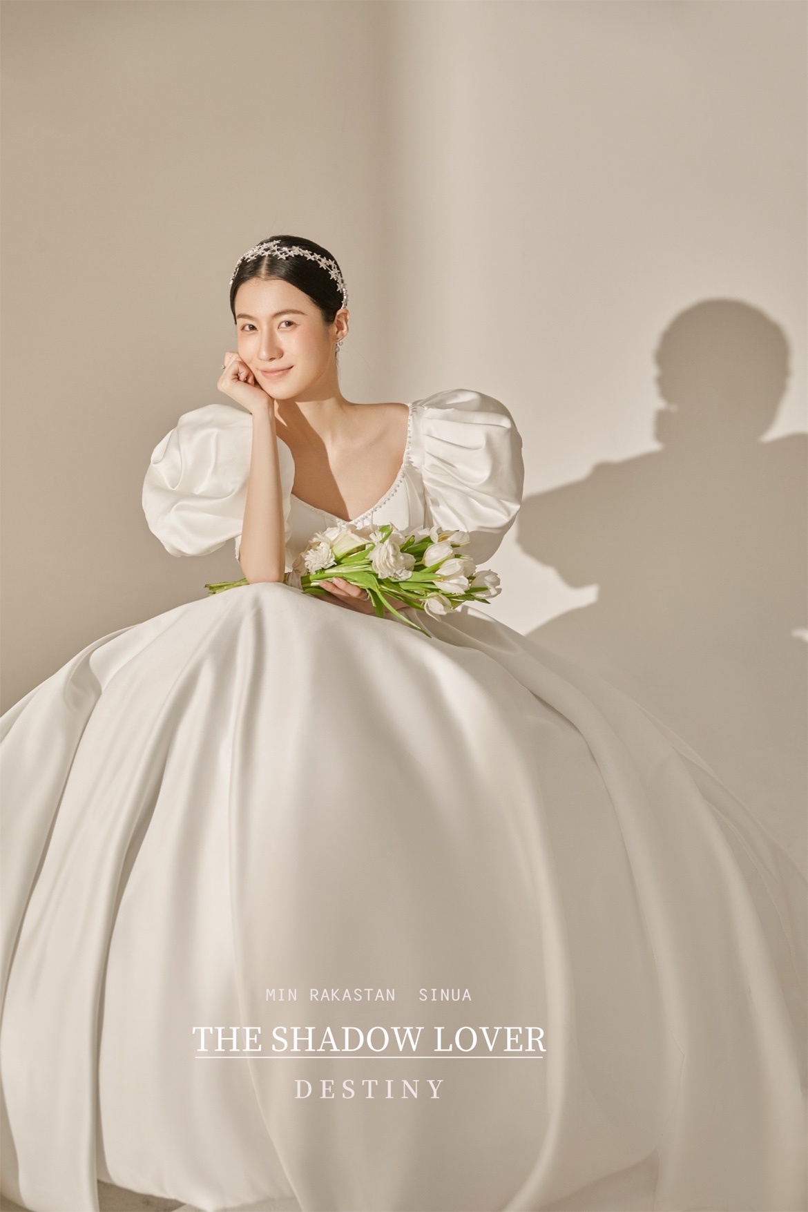 新娘着一身缎面泡泡袖婚纱简约、大气又不失俏皮