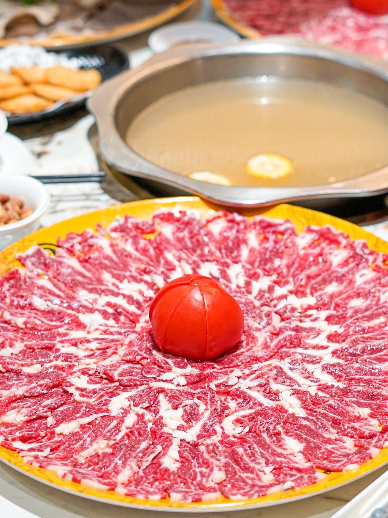大目用的是陕西秦川黄牛,明档现切新鲜看得见,雪花肥牛是我的最爱❤️肉质粉嫩纹理清晰,油脂分布均匀,轻涮就可以吃👉🏻鲜甜滑嫩有油脂感✅喜欢瘦一点的可以选黄肥牛,紧实有嚼劲🙈