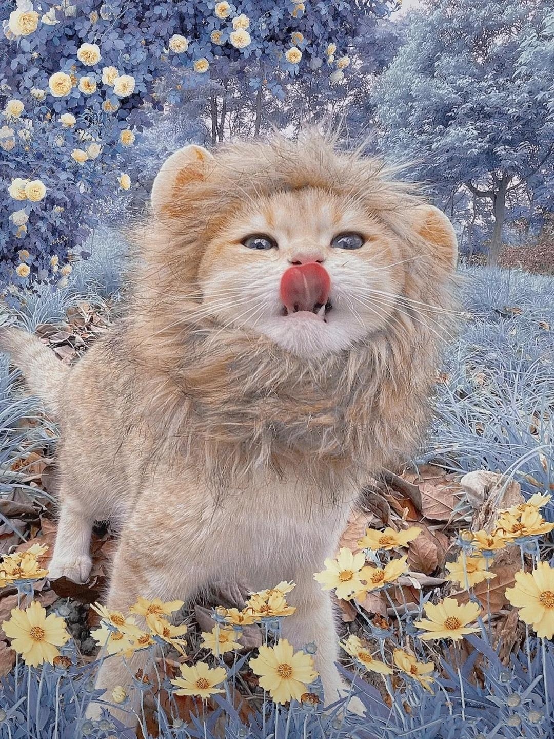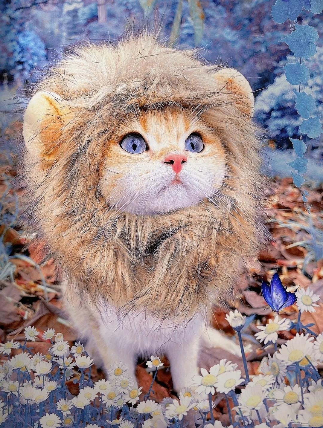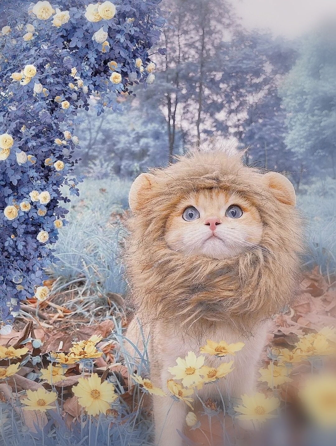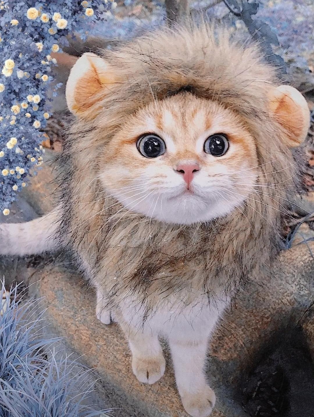 可爱的小猫咪戴上狮子头套就想装成狮子的样