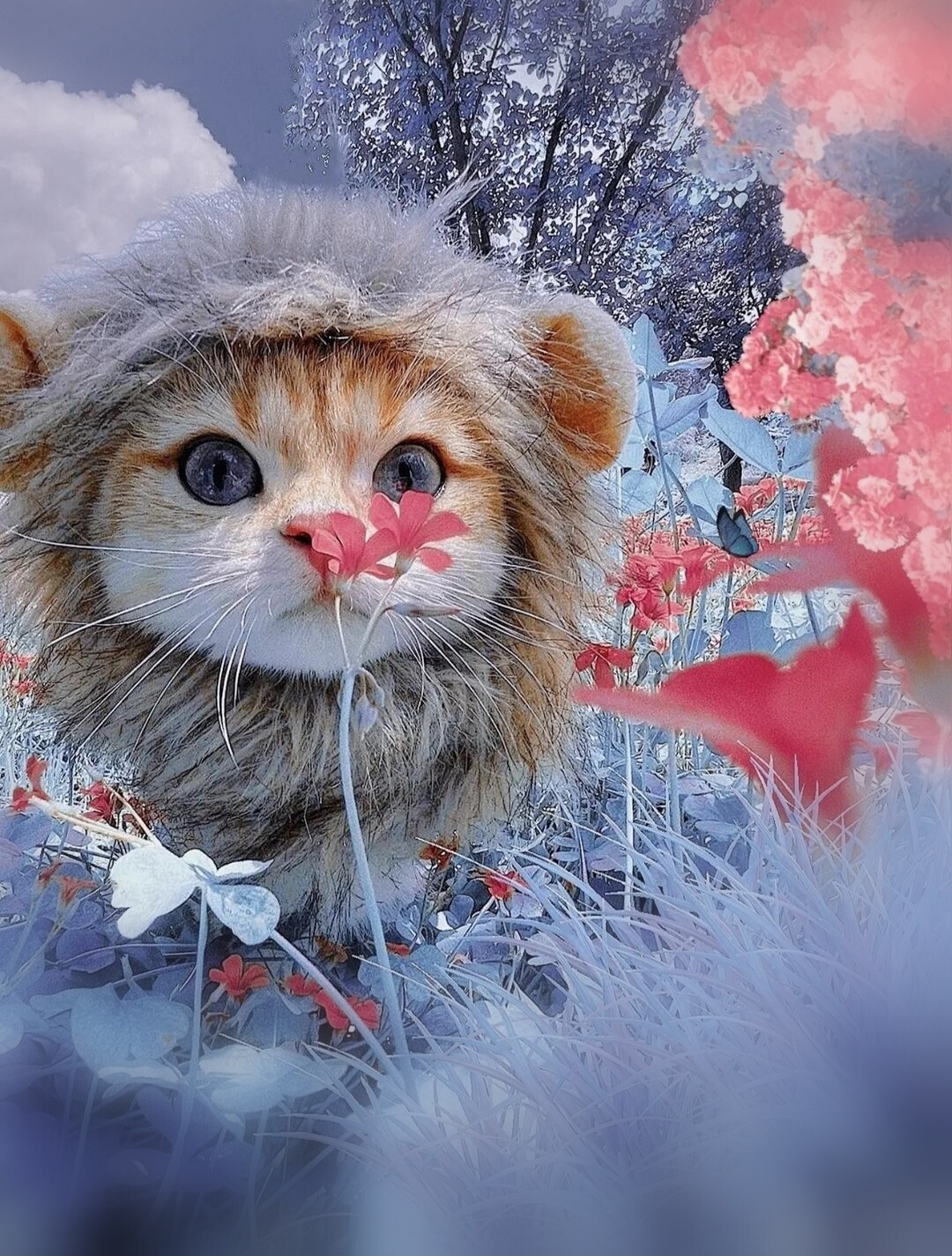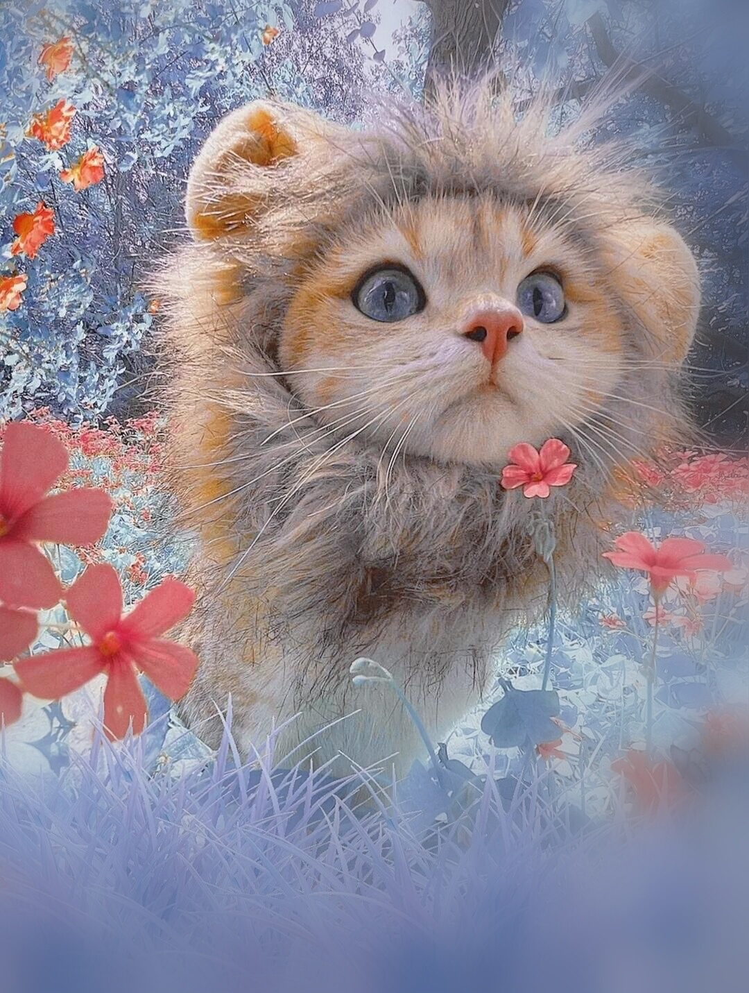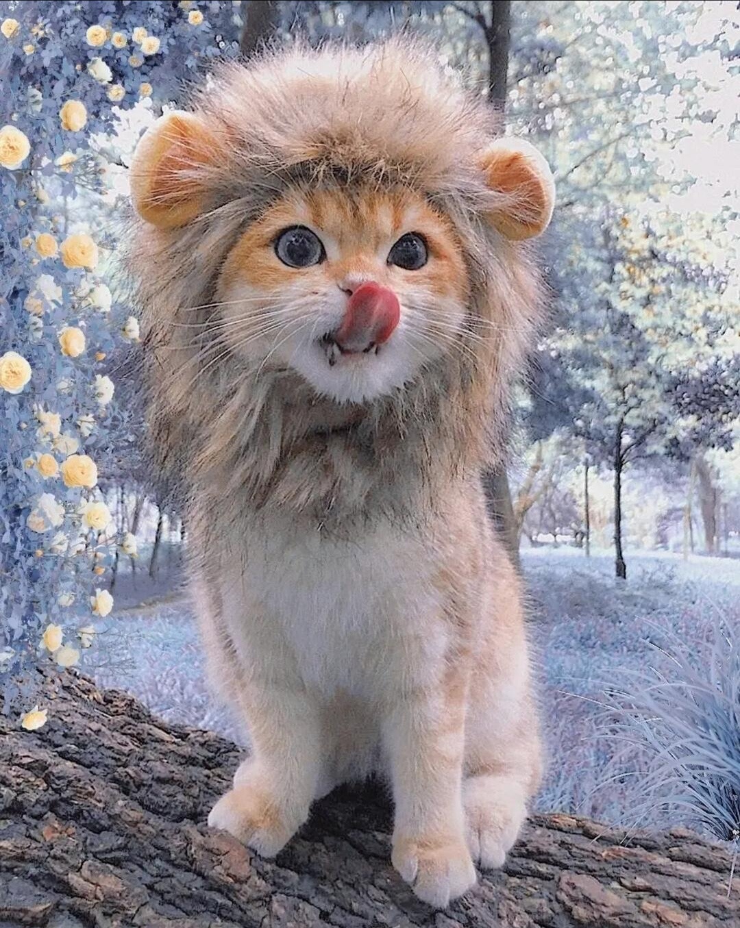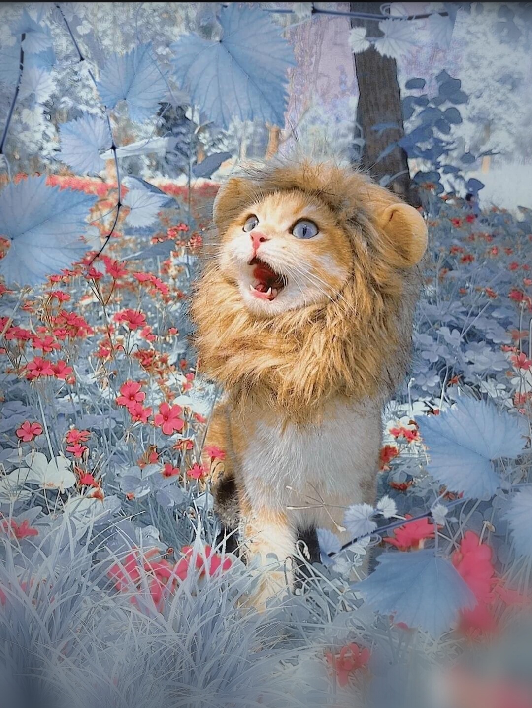 可爱的小猫咪戴上狮子头套就想装成狮子的样