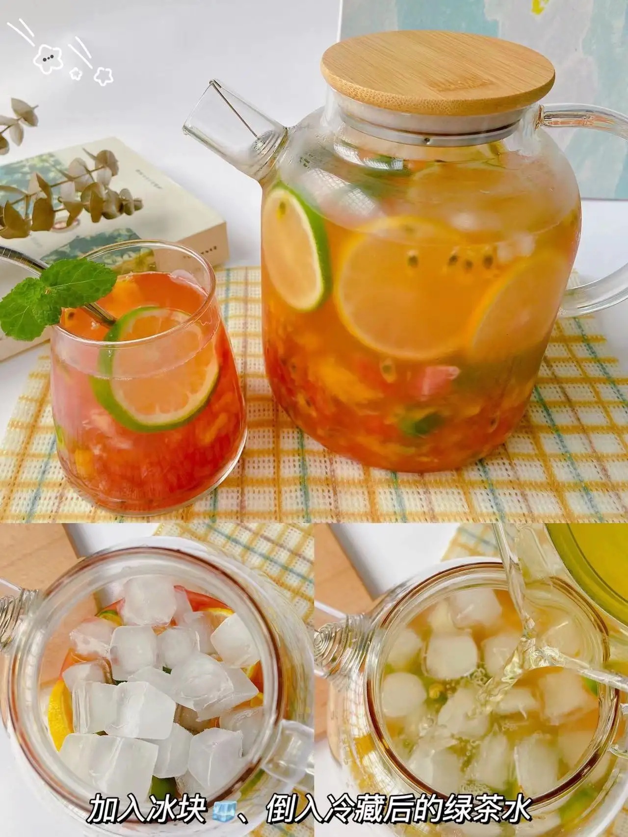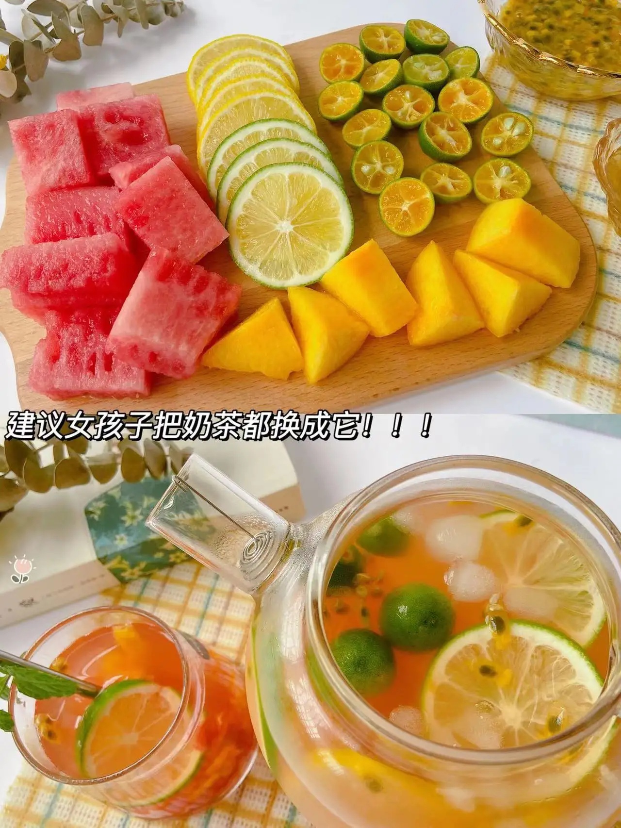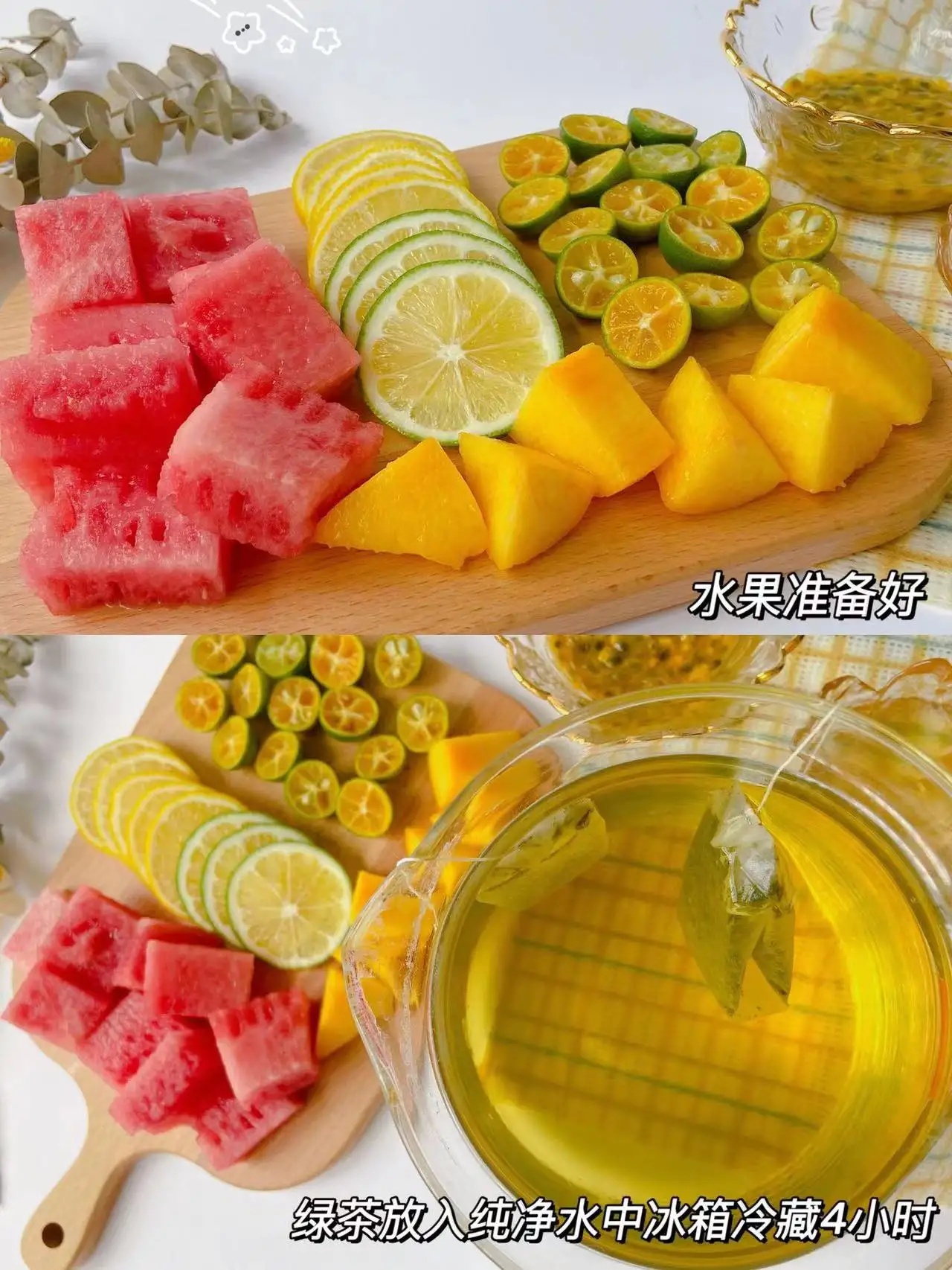 绿茶包2个、西瓜、黄桃、柠檬🍋=、小青柠、百香果、蜂蜜