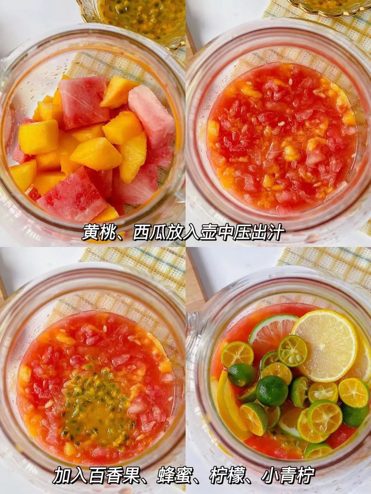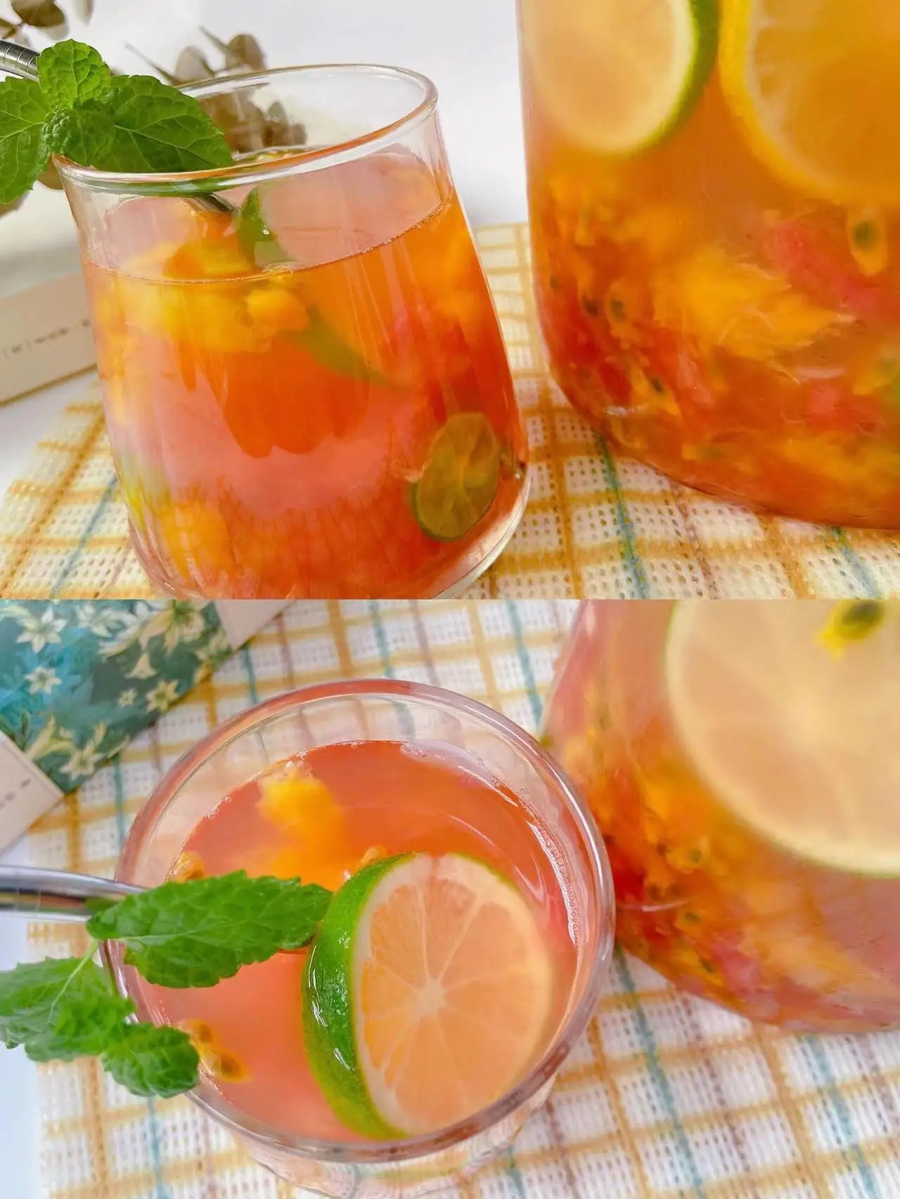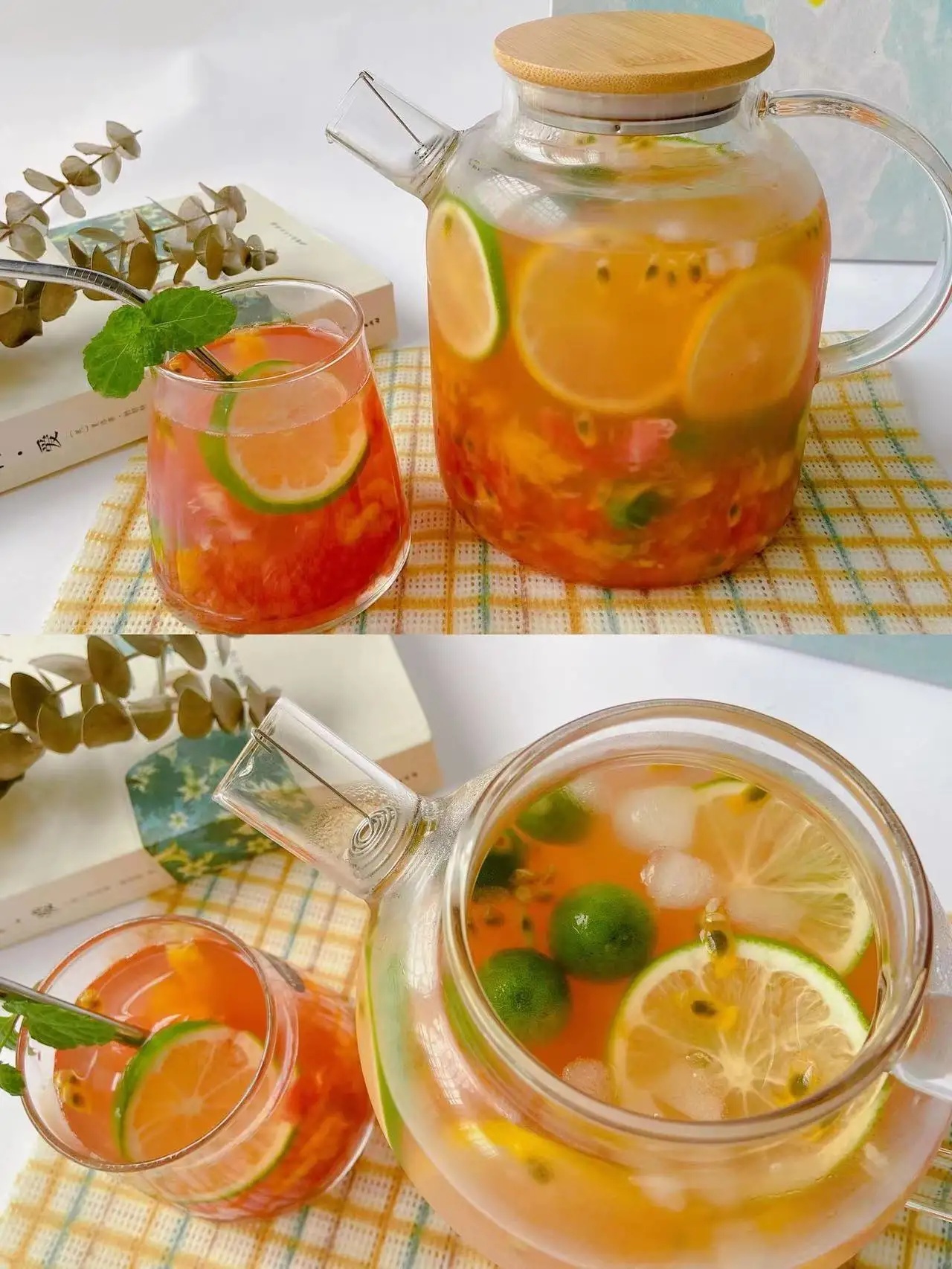 绿茶包2个、西瓜、黄桃、柠檬🍋=、小青柠、百香果、蜂蜜