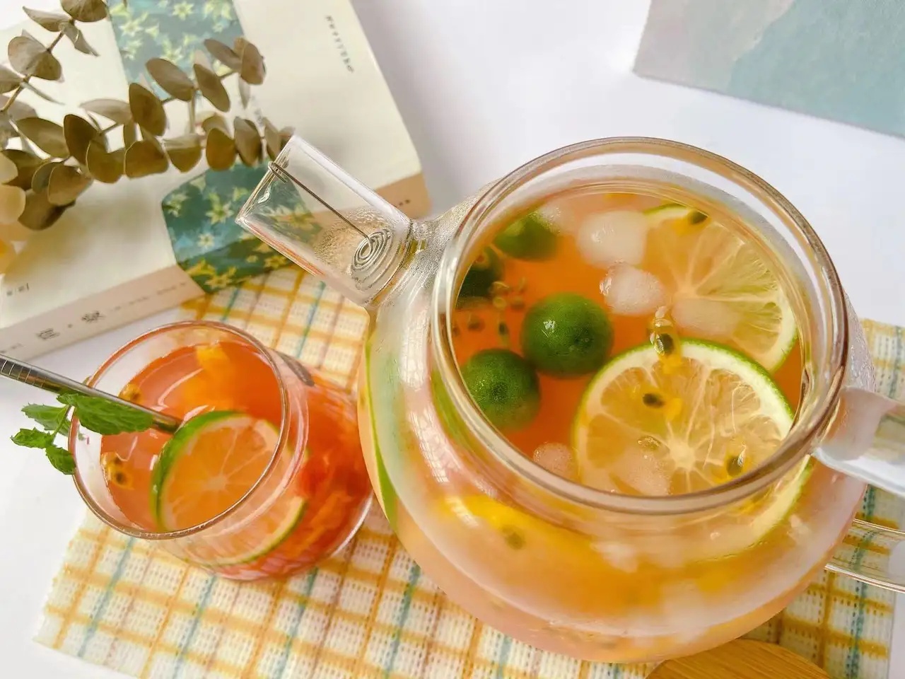 4️、再放入百香果肉、柠檬片、小青柠、适量蜂蜜(加量按照自己口味)、加上适量冰块,然后将提前泡好的绿茶水倒入搅拌均匀就可以开动啦