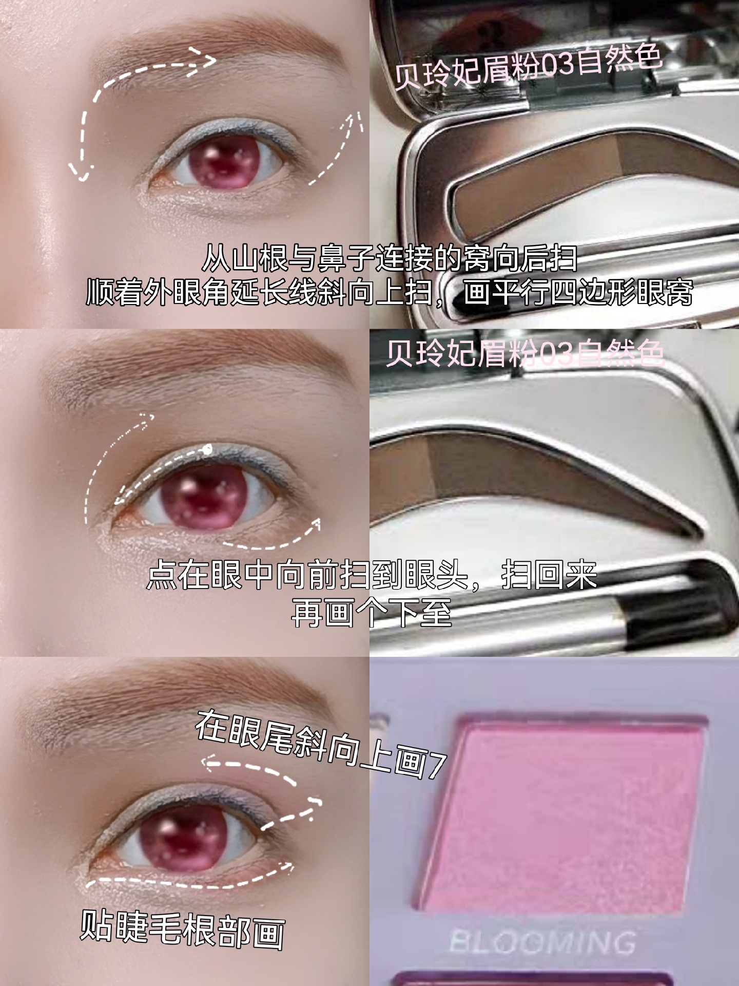 1)人物眼睛是平行四边形,所以用眉粉加深眼窝的折叠度