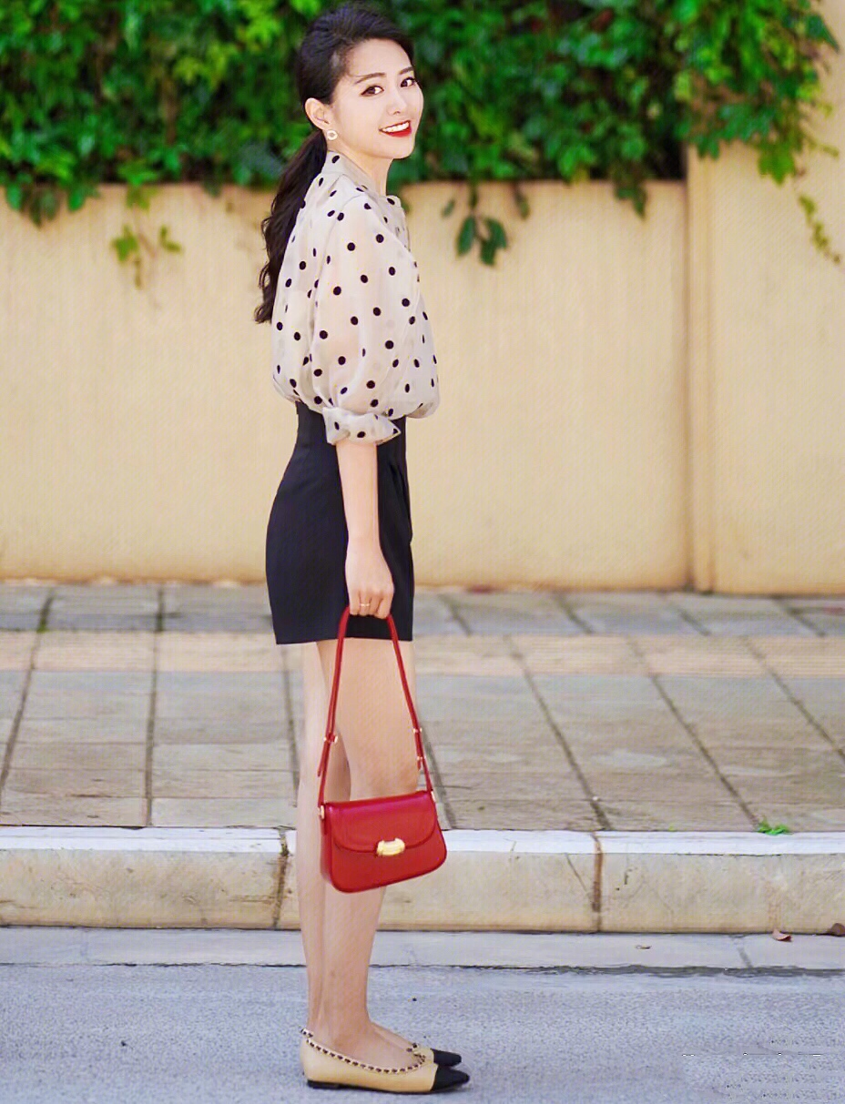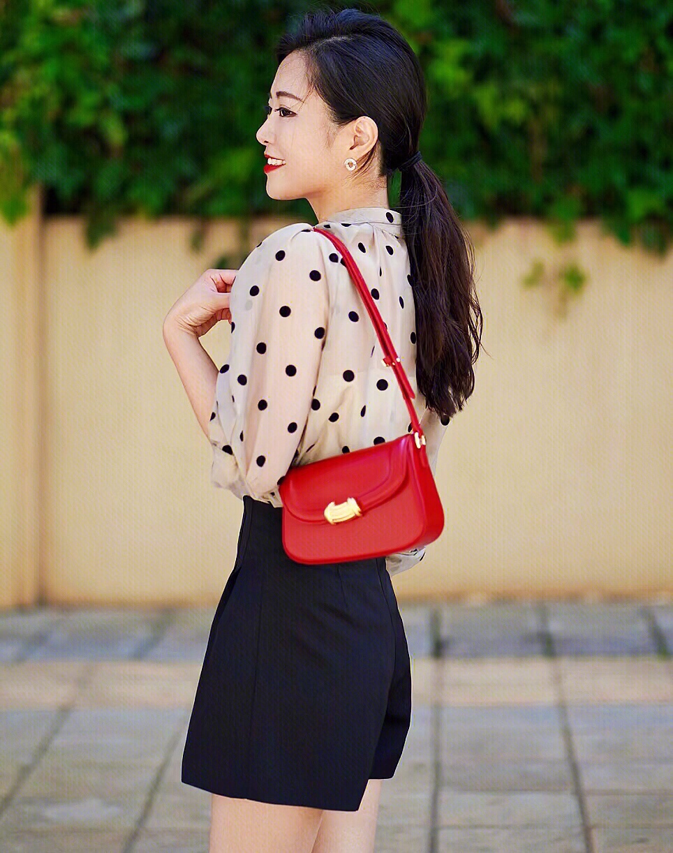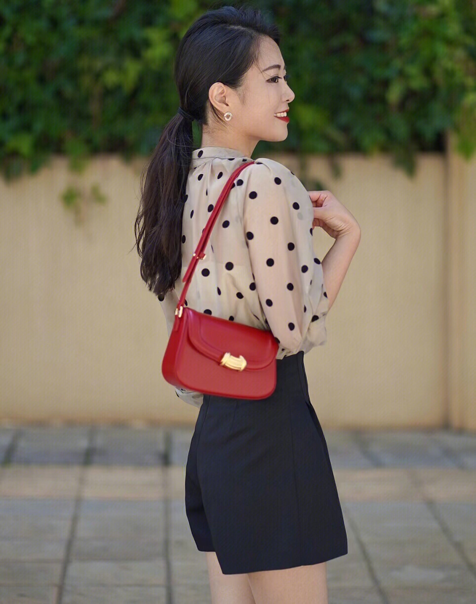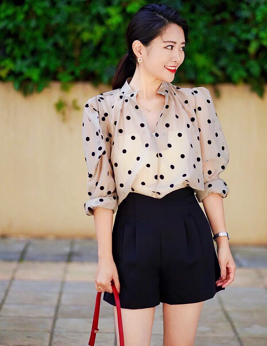 一件波点衬衫搭配上黑色短裤,适合职场和休闲的穿搭,看上去也非常优雅温柔!