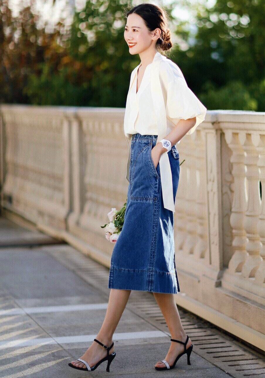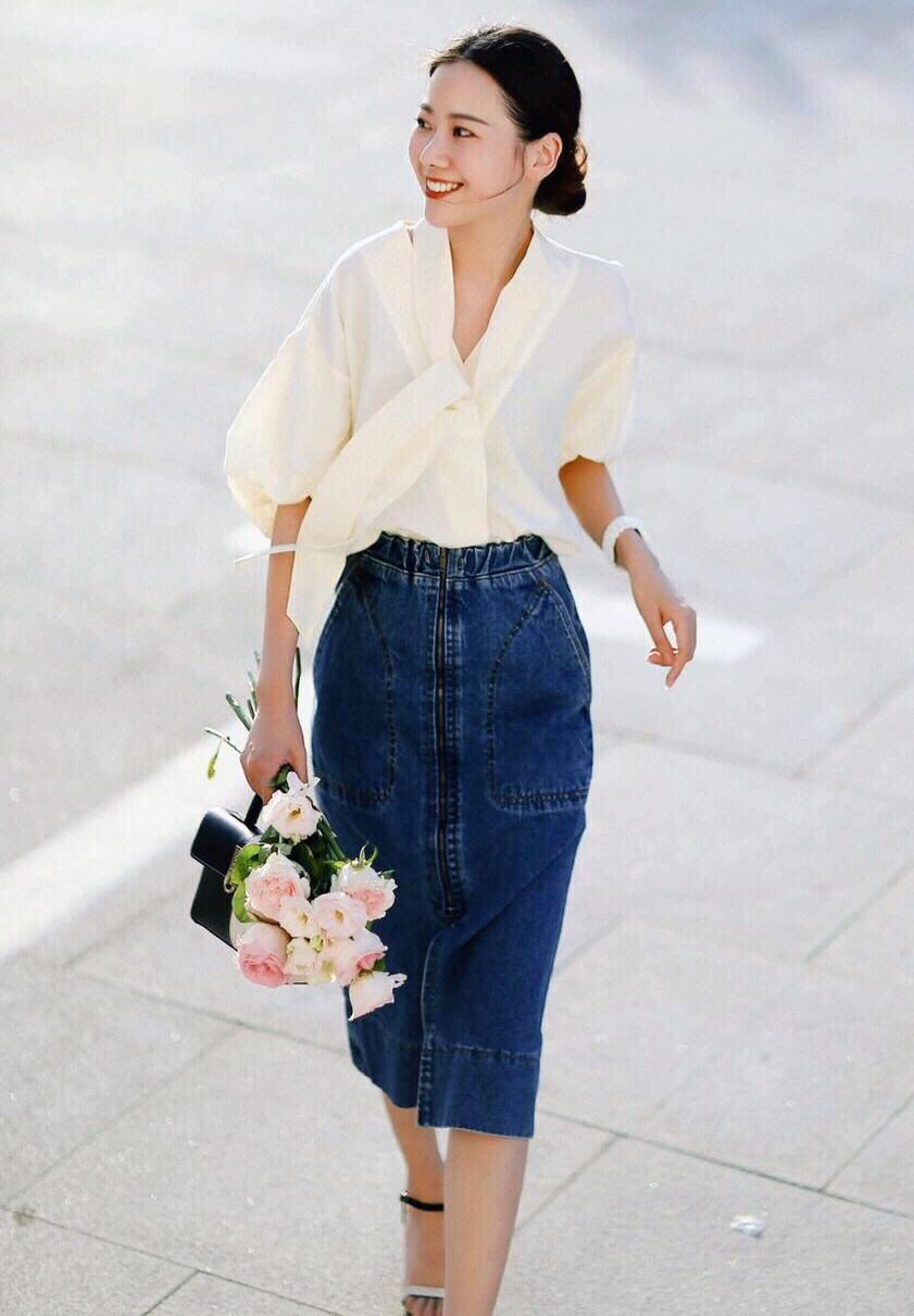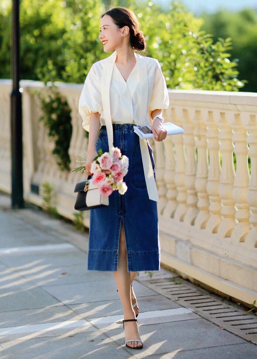 白色的飘带衬衫搭配一条牛仔开叉半身裙,优雅温柔,精致时髦又浪漫🌹