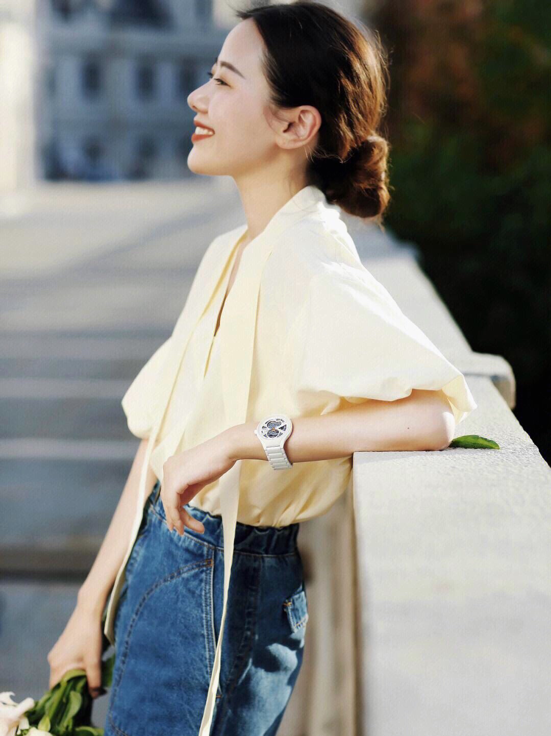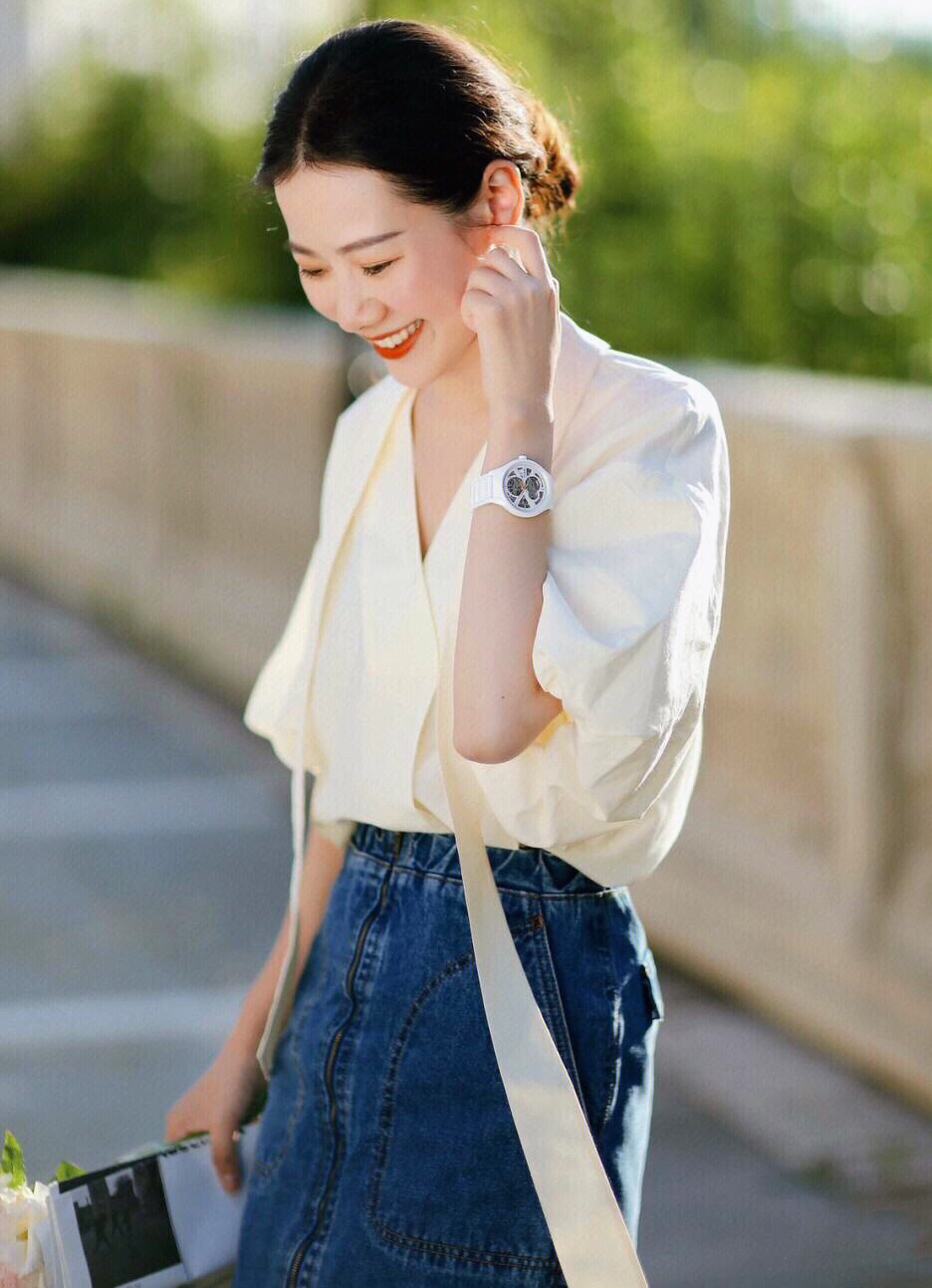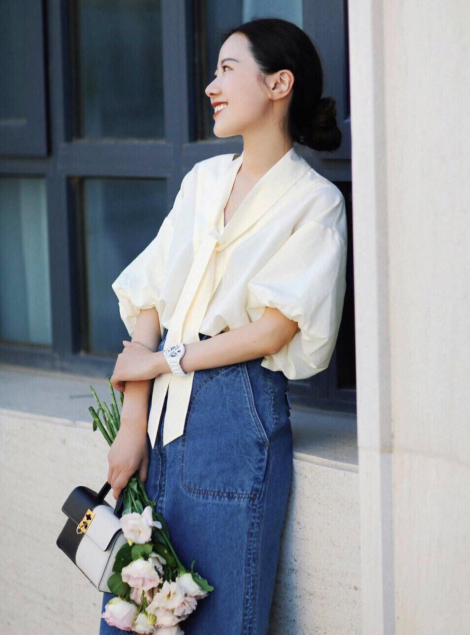 白色的飘带衬衫搭配一条牛仔开叉半身裙,优雅温柔,精致时髦又浪漫🌹