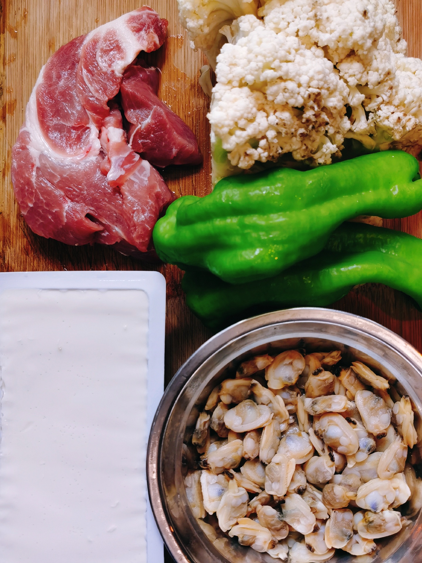 今晚做个蚬子肉豆腐羹和干锅花菜。