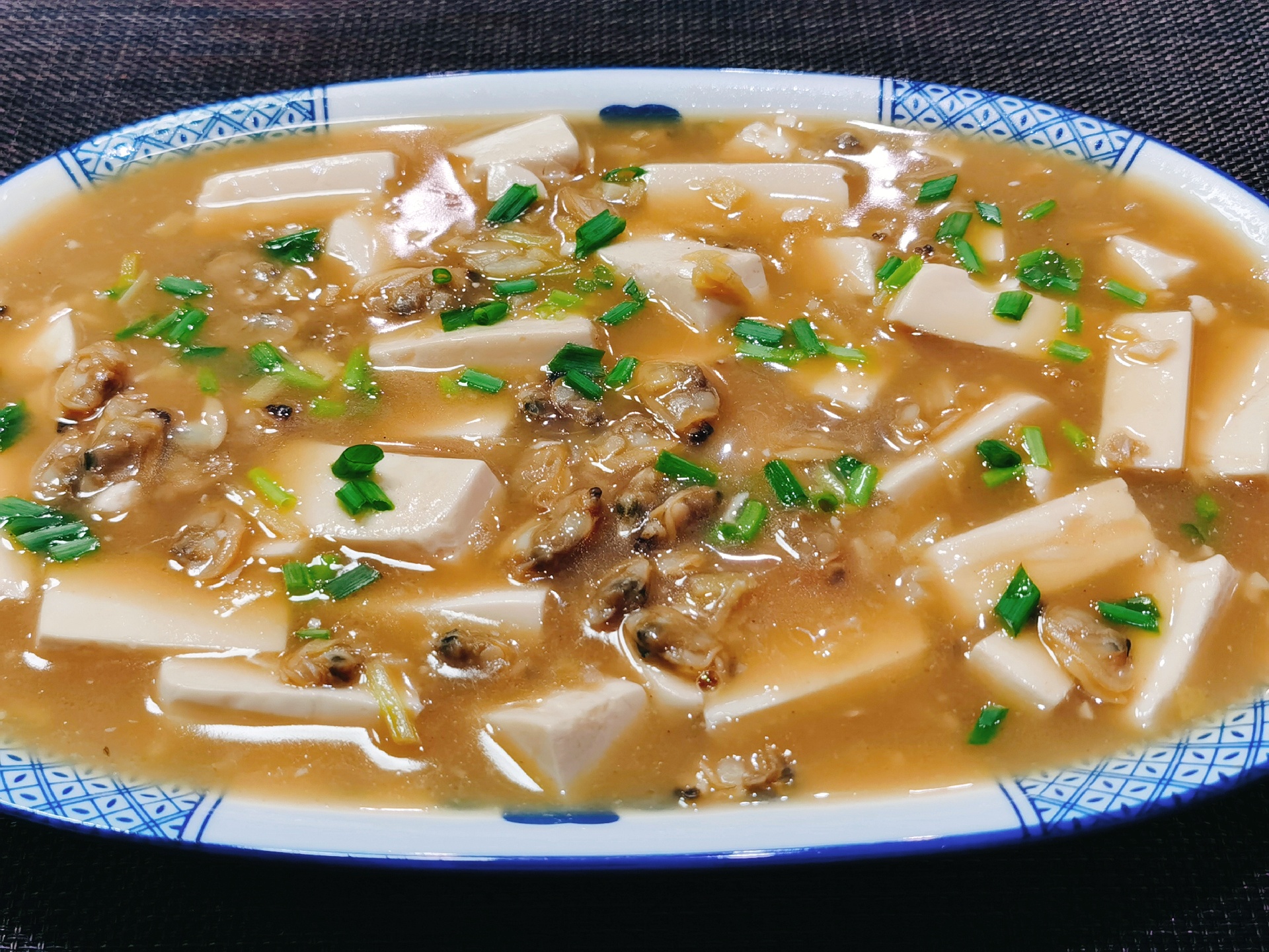 蚬子肉洗净用盐和白胡椒粉腌一下,锅里热油下姜蒜末和葱白爆香,下蚬子肉一起翻炒出水,放豆腐块,倒热水末过食材,放两勺糟卤,一点白糖盖锅盖煮到豆腐入味,开盖用水淀粉勾个芡,淋点耗油润色,最后撒上葱花就好啦。