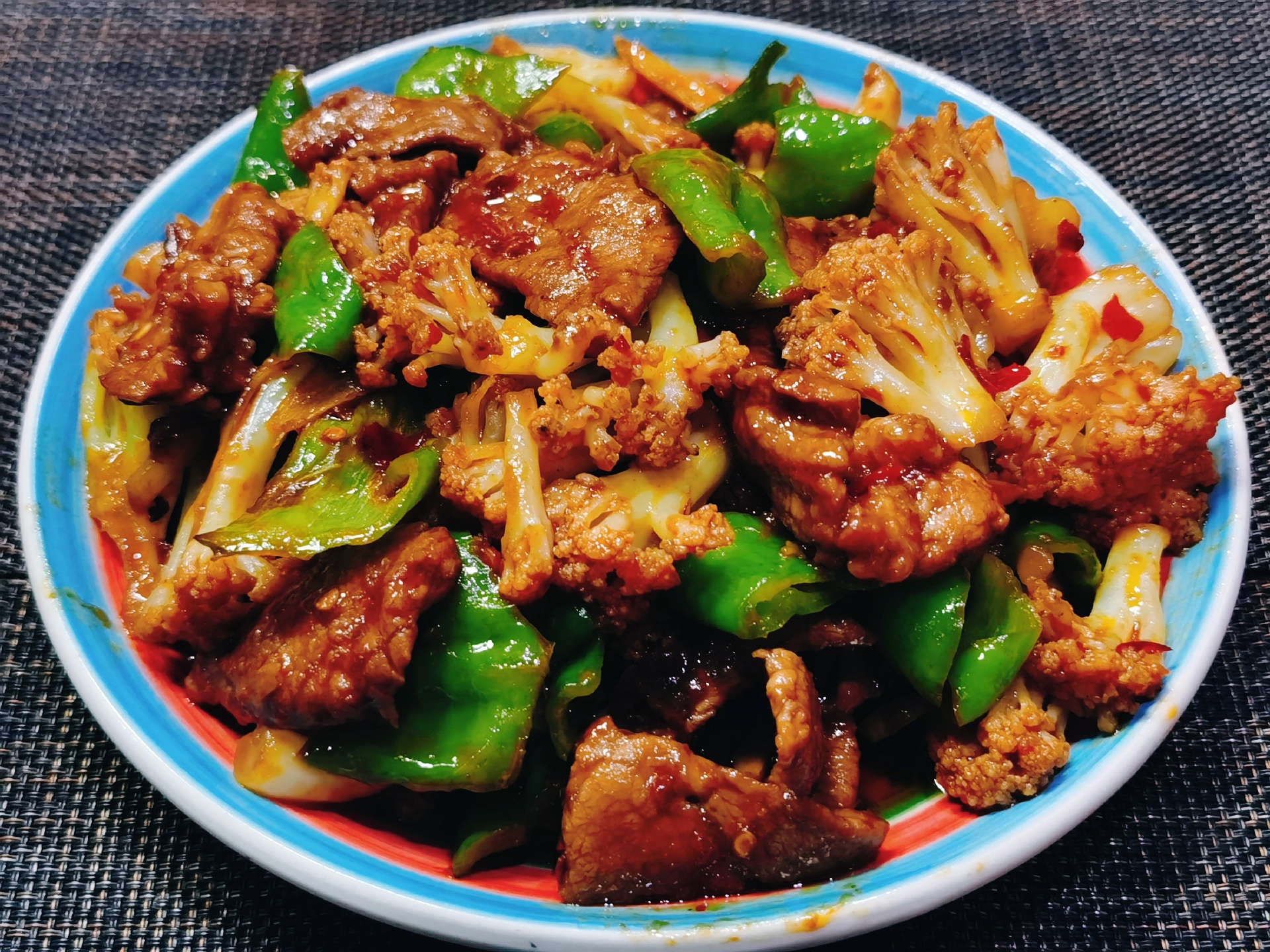 拿一块带夹心的前腿肉,切片用刀背仔细拍打,然后用料酒、五香粉、生抽腌制一下,再抓上淀粉和一点食用油,这样会非常嫩。花菜切根掰开用开水焯熟捞起,锅里热油先把肉片滑炒变色捞出,下蒜瓣、青椒和郫县豆瓣酱,炒出香味了下花菜一起翻炒,花菜上淋点味极鲜提味,再下肉片一起大火快速翻炒到锅里干了就好啦。