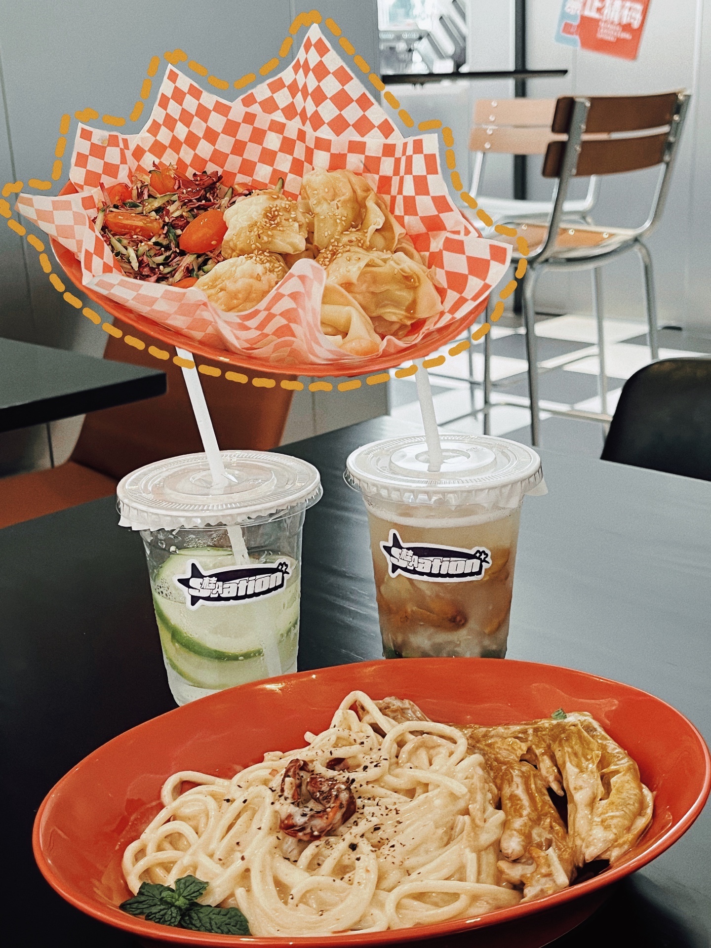 鸭脚意面是螺蛳味的鸭脚搭配奶油意面 很创新的味道 鲜虾云吞每一颗云吞都包裹着一整个鲜虾 搭配蔬菜沙拉 清爽的味道 两杯盐水饮品是古早风味 冰冰爽爽的 好喝