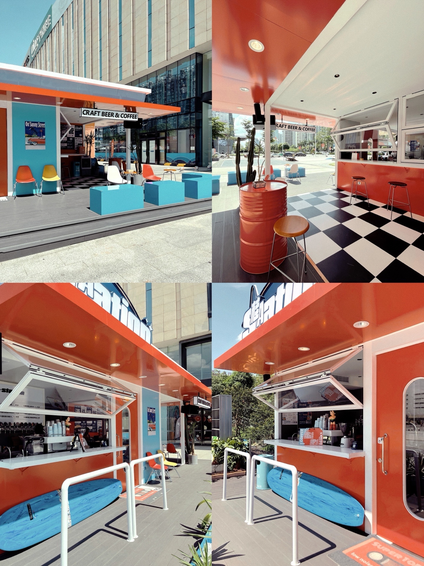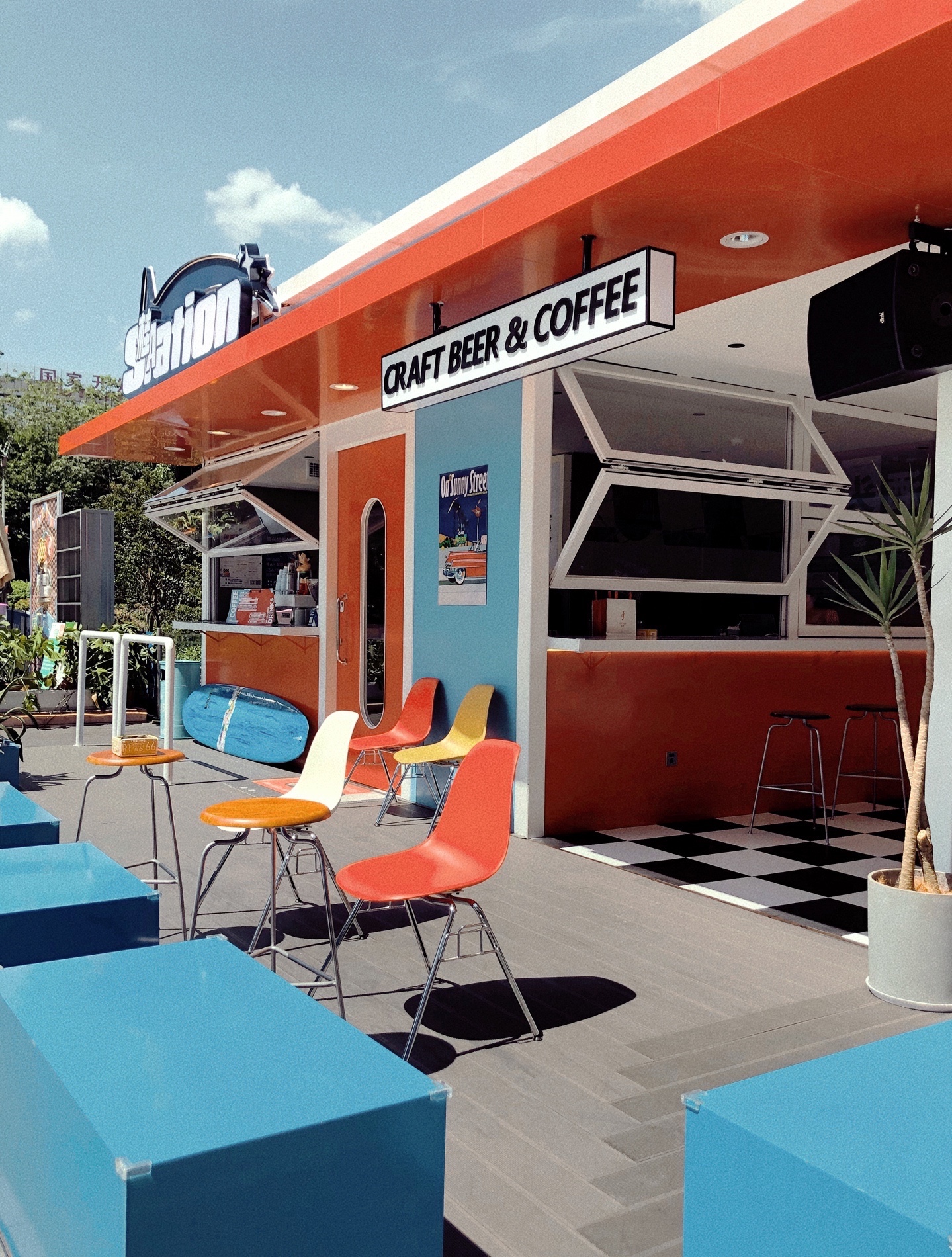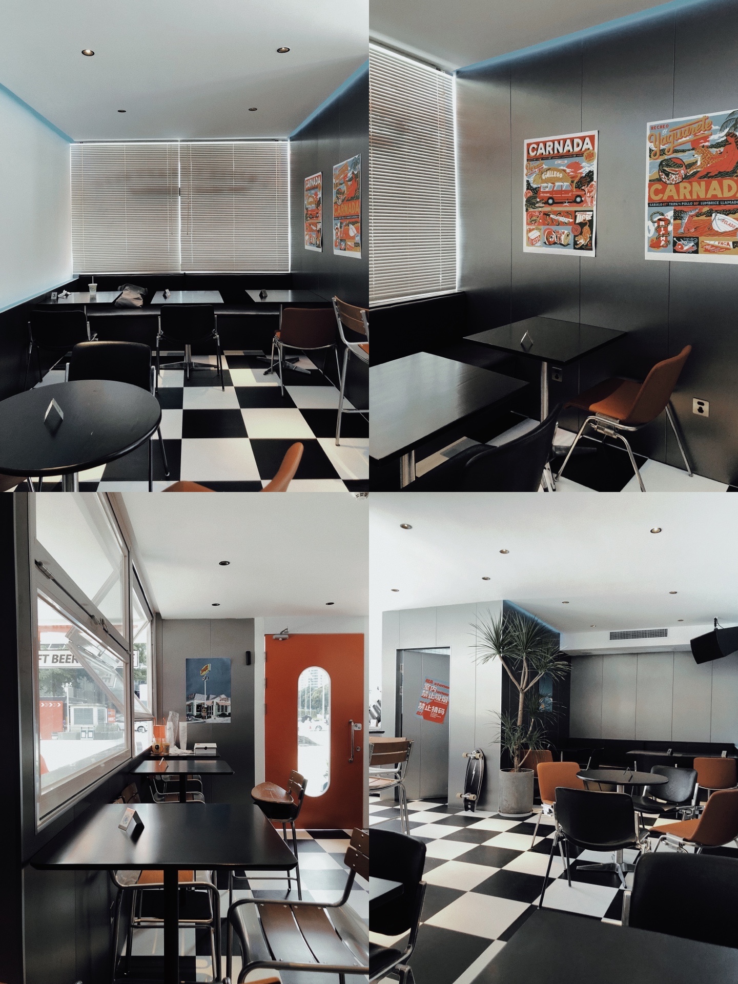 红蓝色搭配的店外有浓浓的美式复古氛围 冲浪板🌊和仙人掌🌵夏日气息满满 配合背景的蓝天白云感觉像是在海岛度假🌴 店里是很有质感的灰黑色工业风 黑白格的地板也带点美式复古味