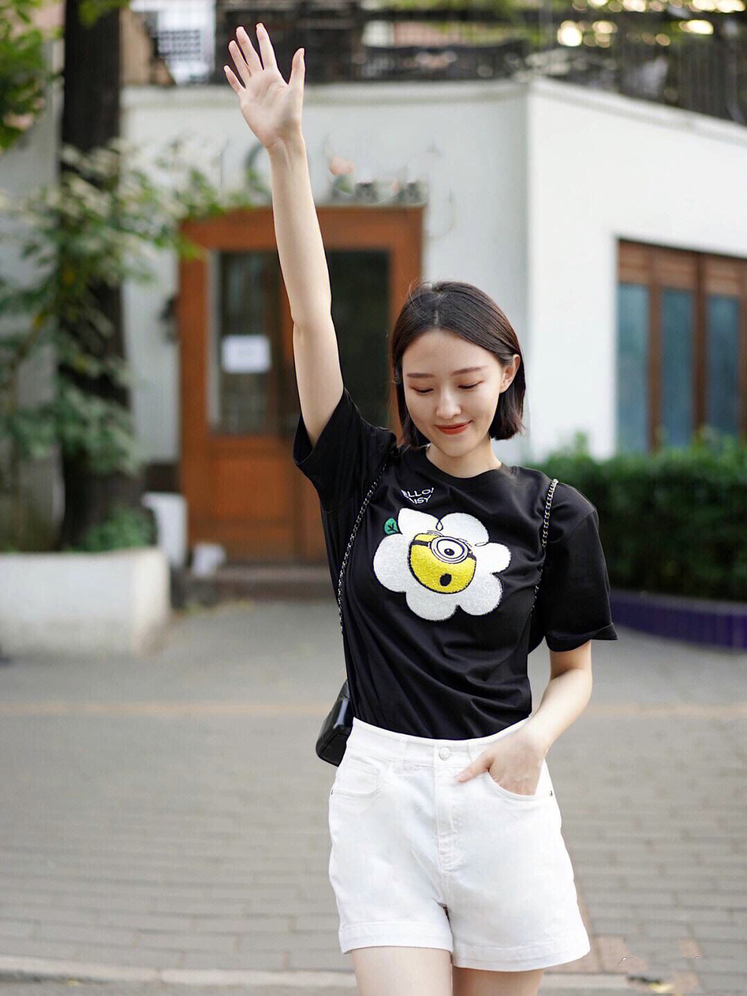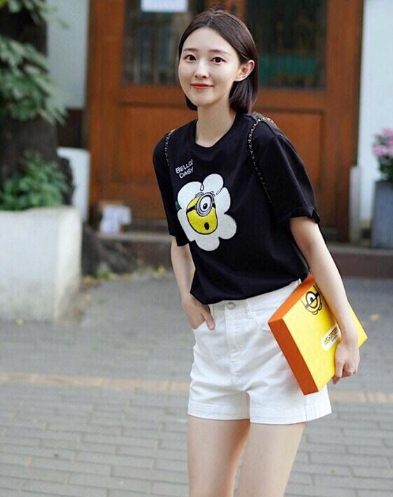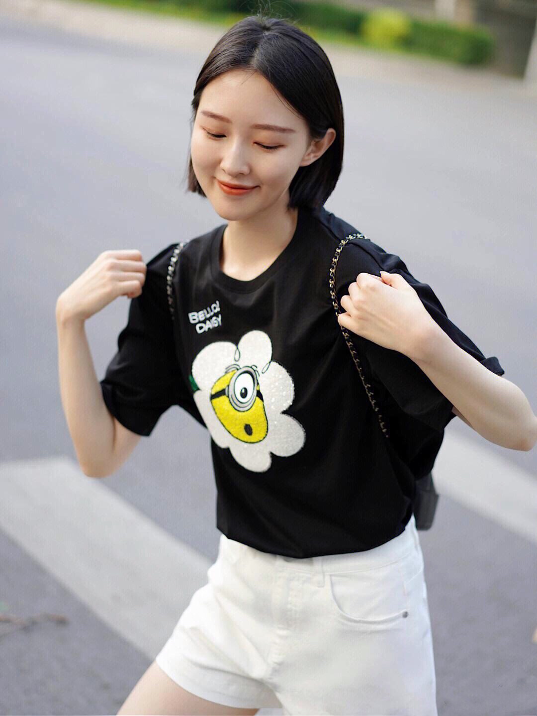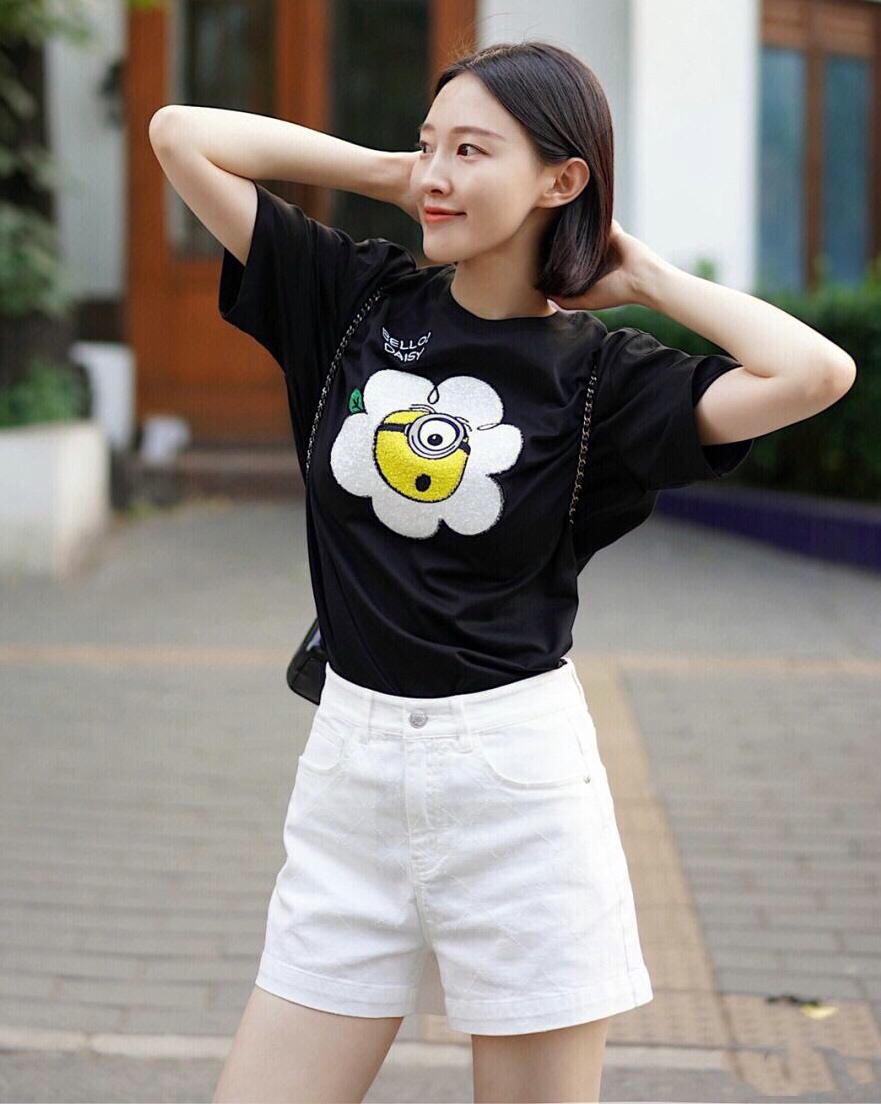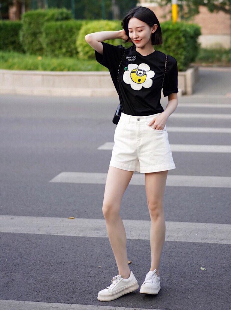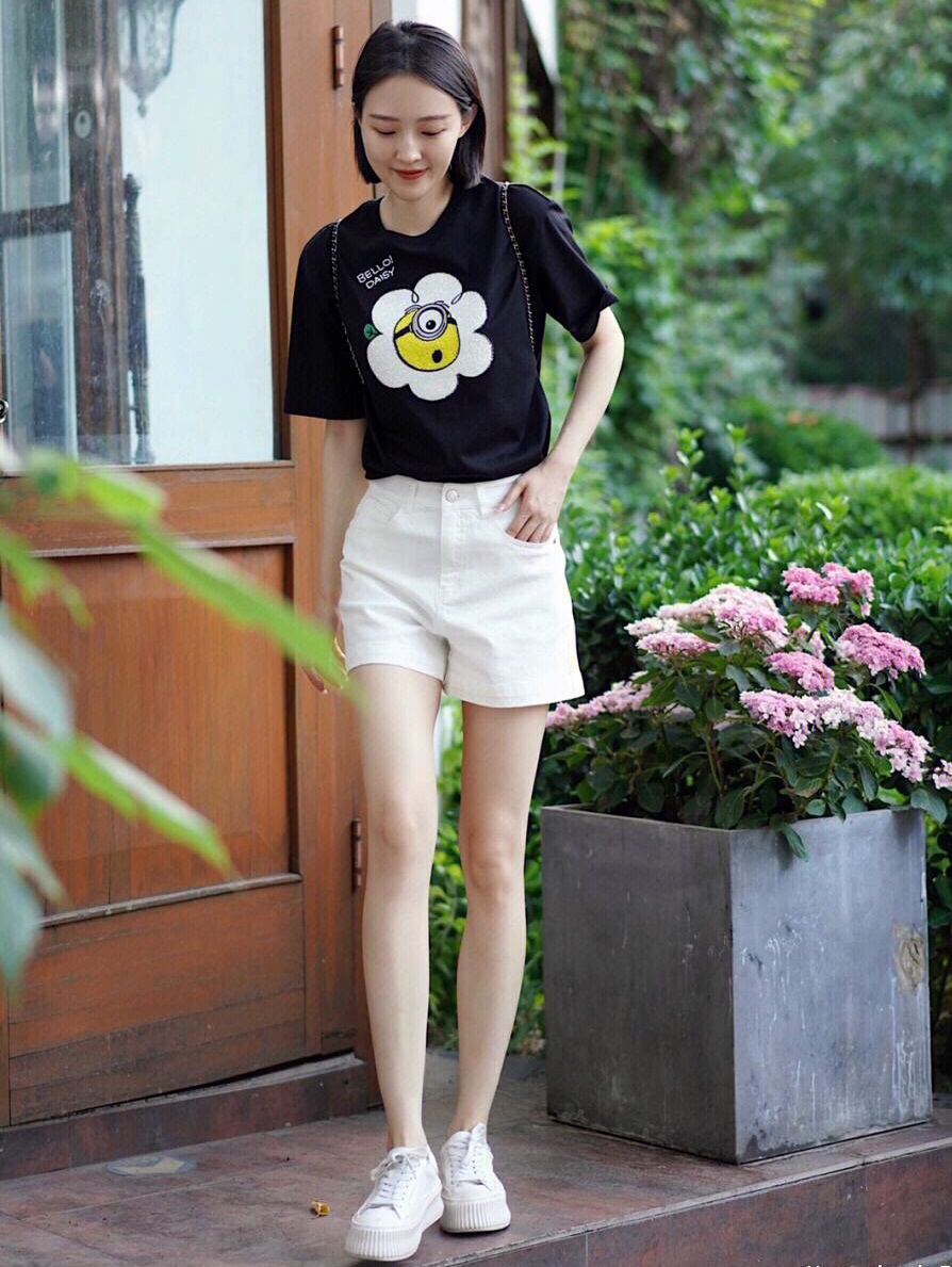 黑色印花T恤搭配白色短裤,配色清爽干净,款式简洁大方,轻松展现夏日优柔精致魅力!