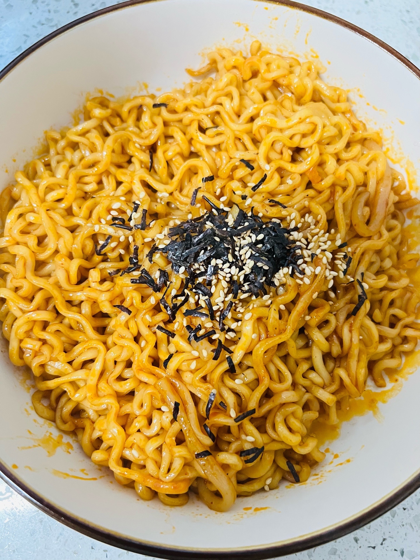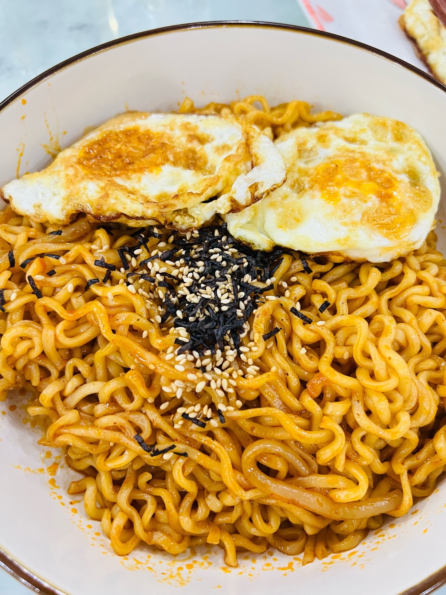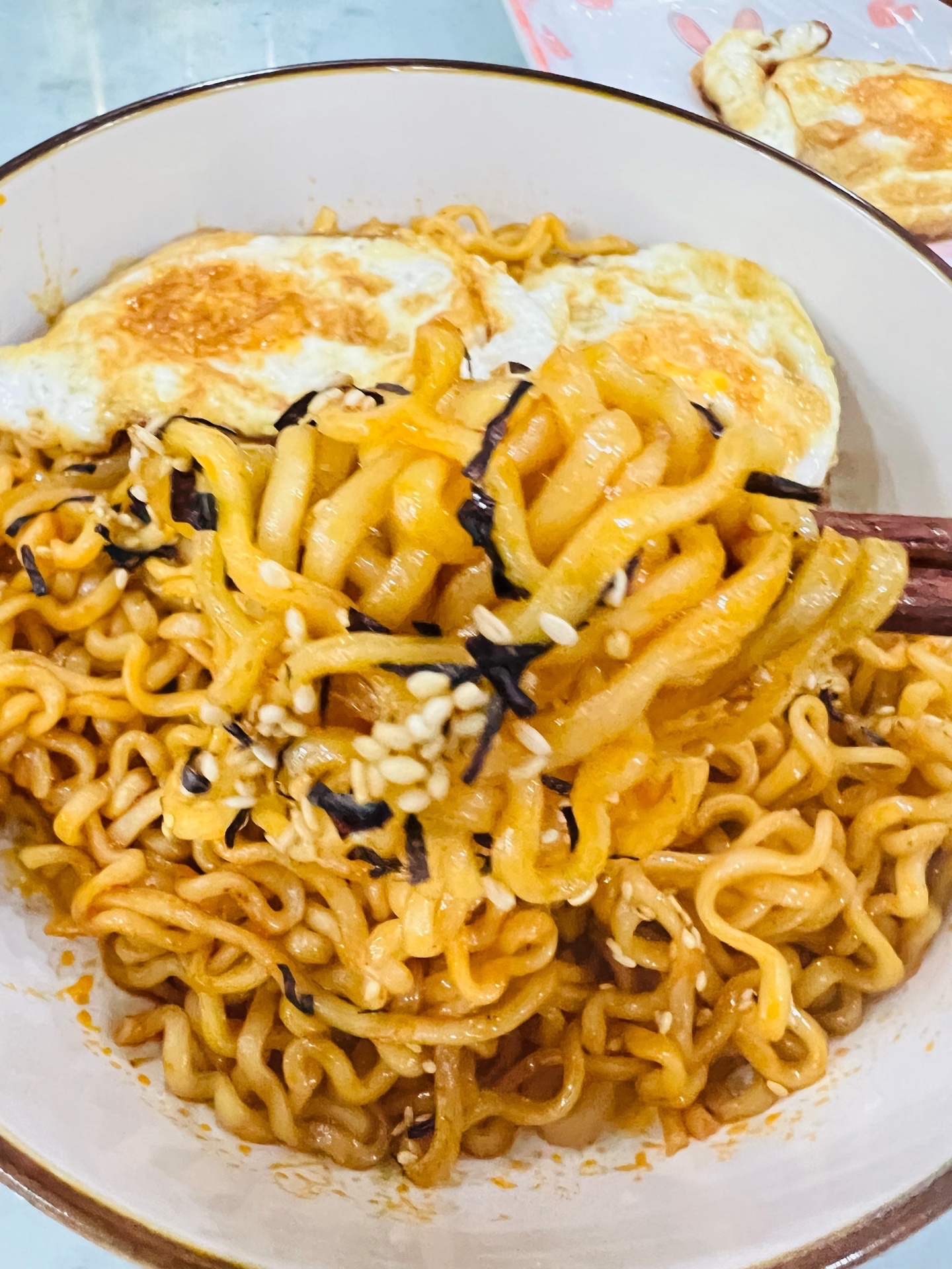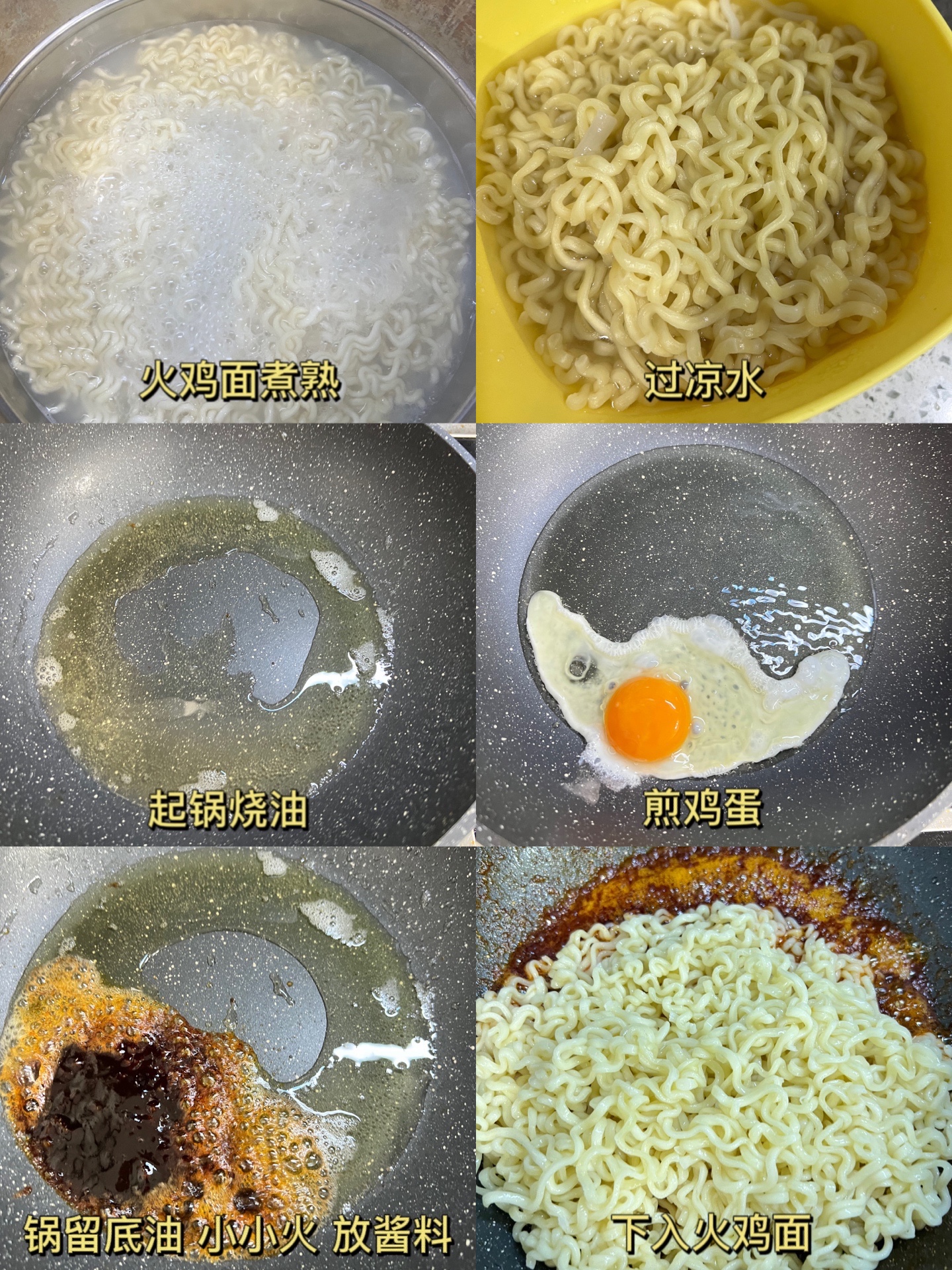 火鸡面煮熟过凉水 起锅烧油煎鸡蛋 锅留底油 小小火炒火鸡面酱(怕掌握不好火候的可以先关火 搅拌均匀酱料 在开火 吃一包按照自己接受范围内 放半包酱料 就可以 )