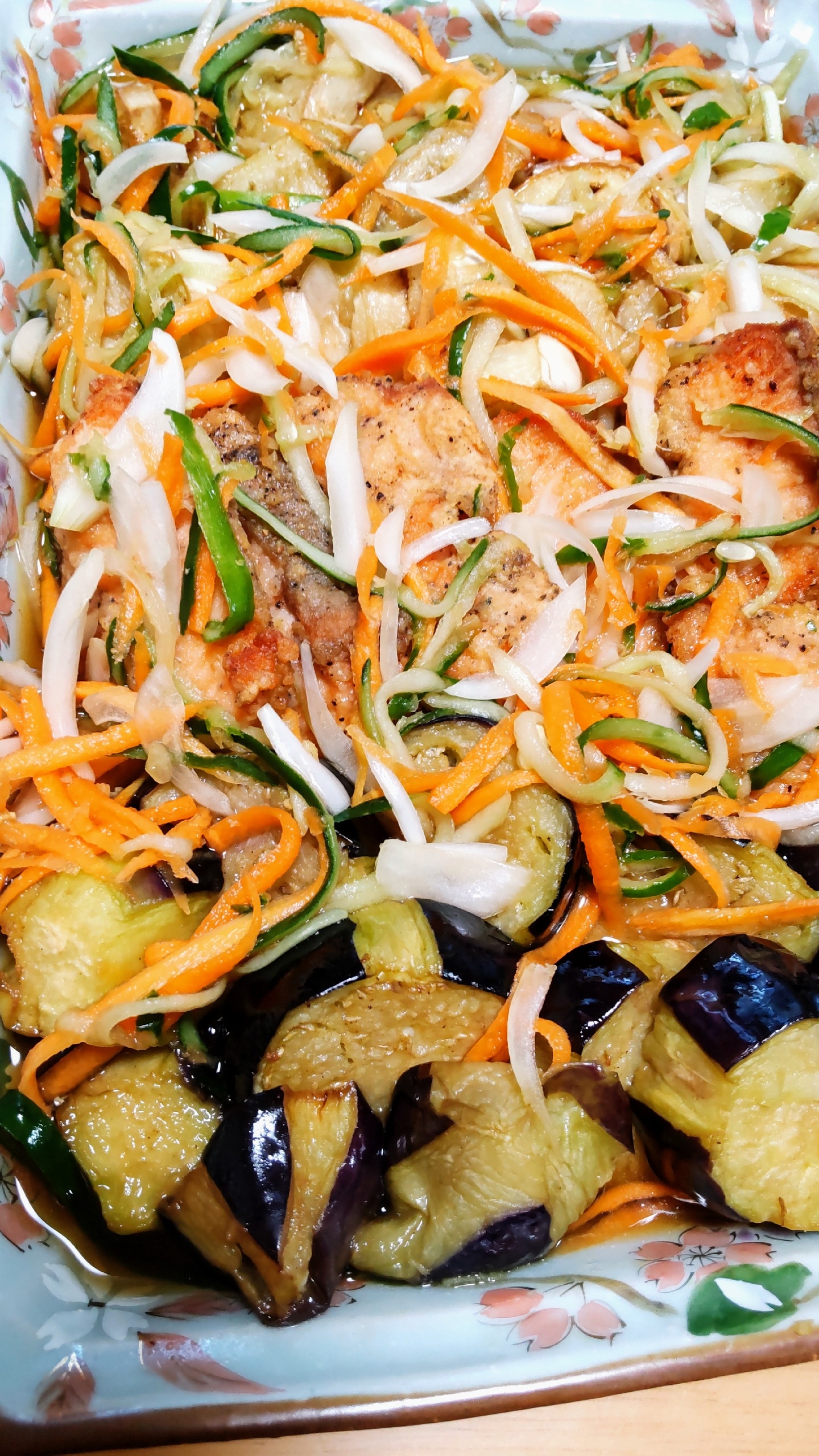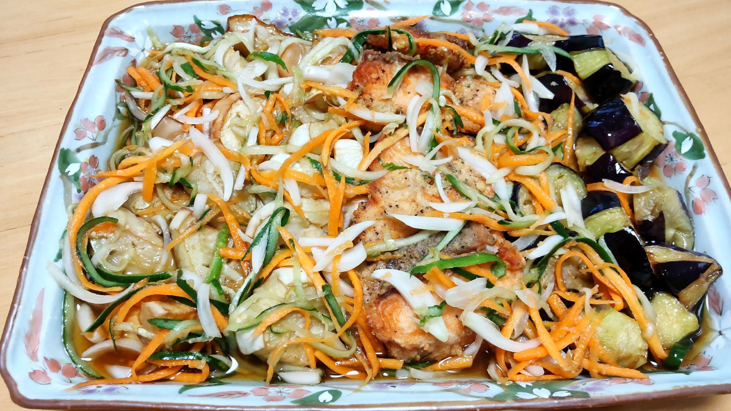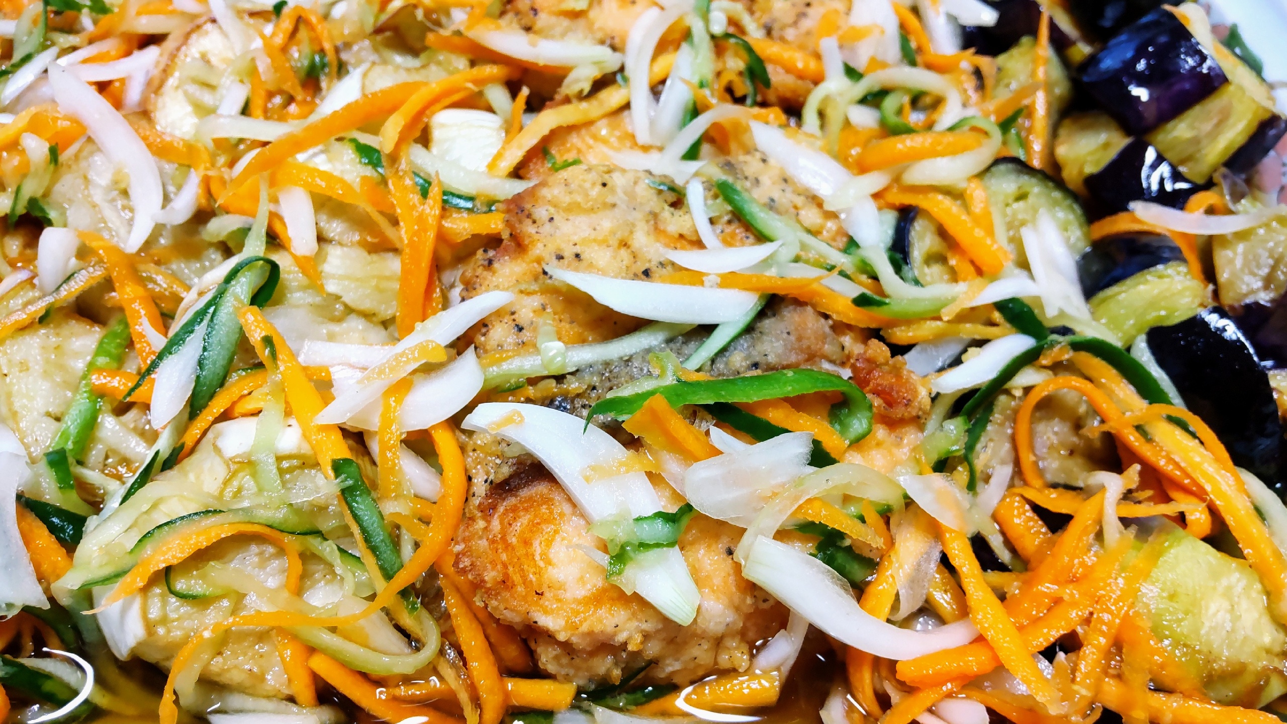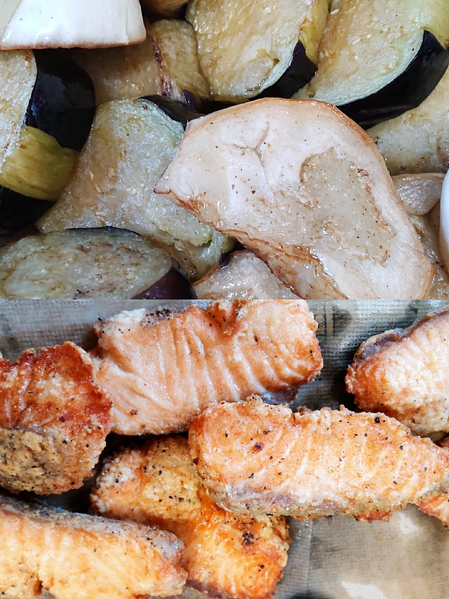 2.茄子170度油温炸一下,三文鱼也炸一下。