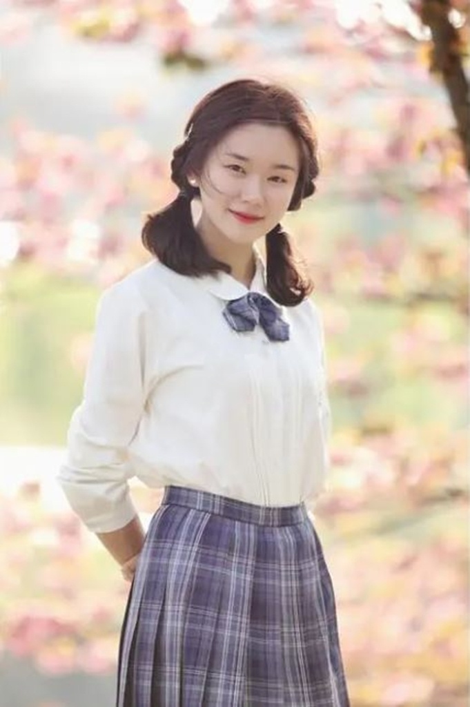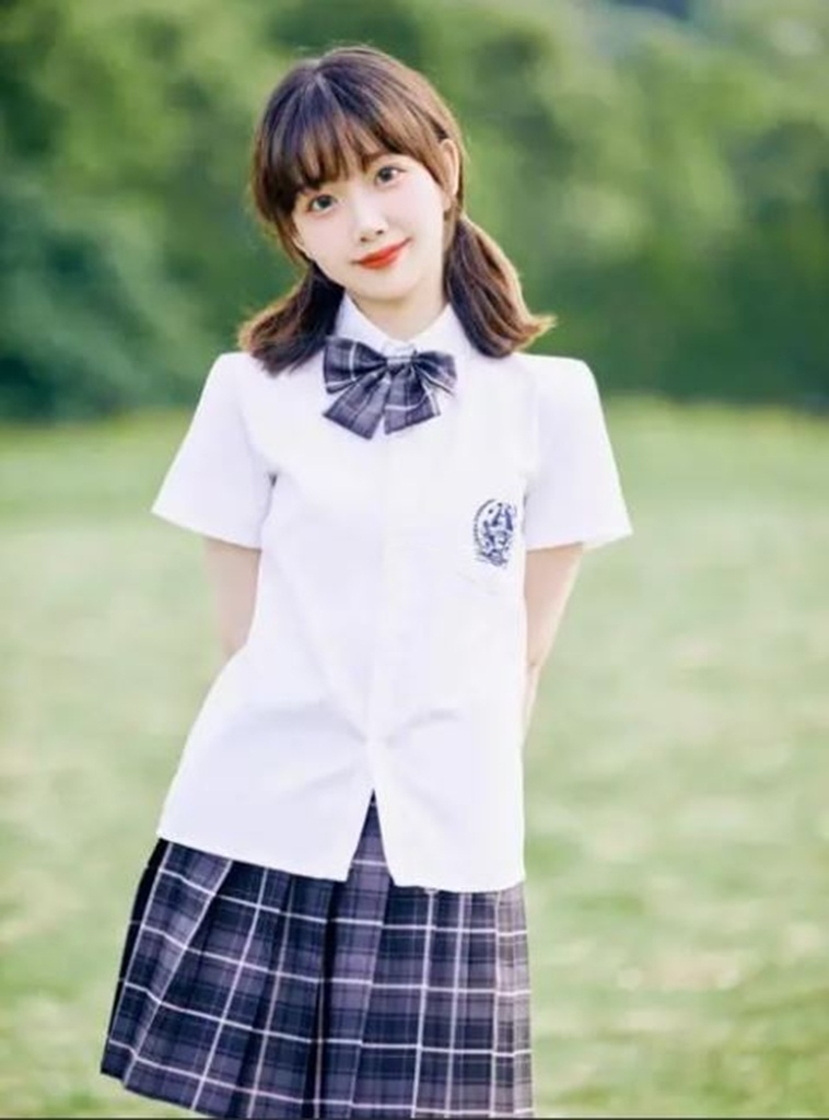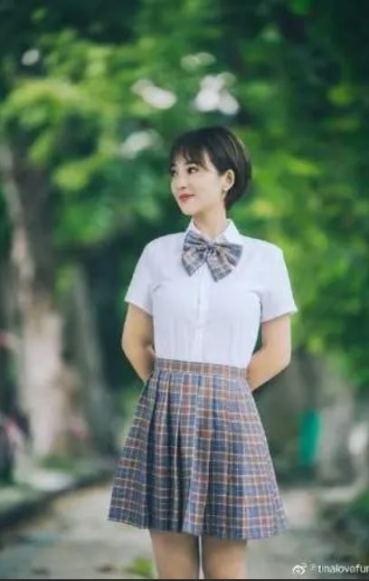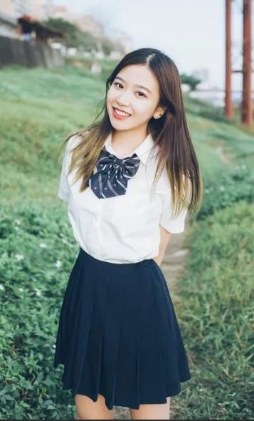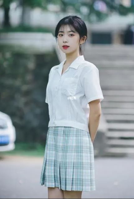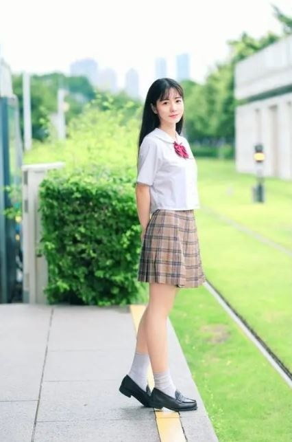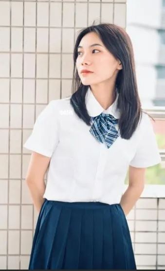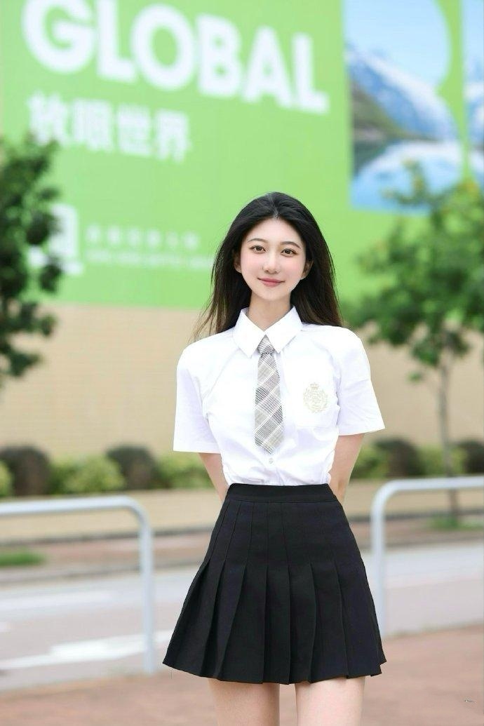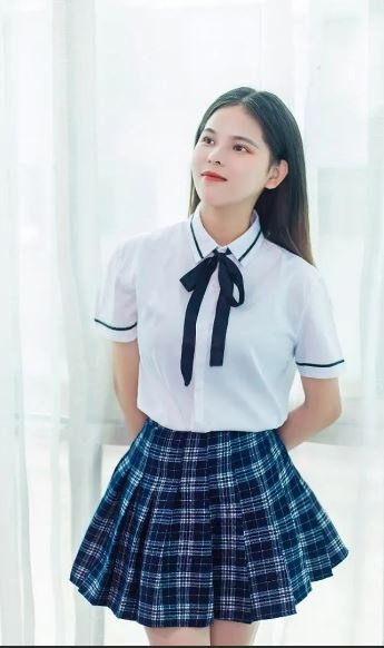 校园风格白衬衫,背着手站立的纯洁学生妹😘
