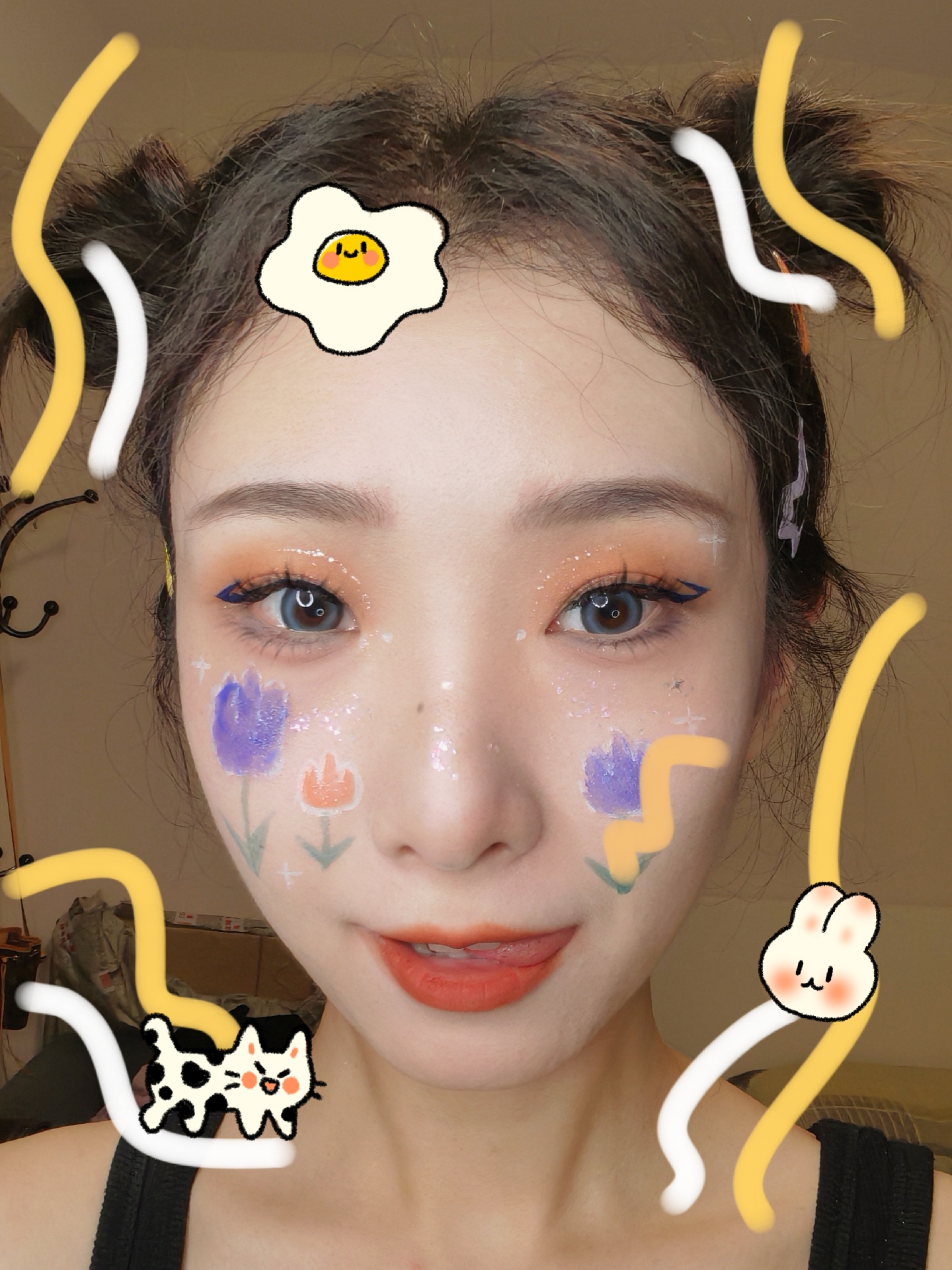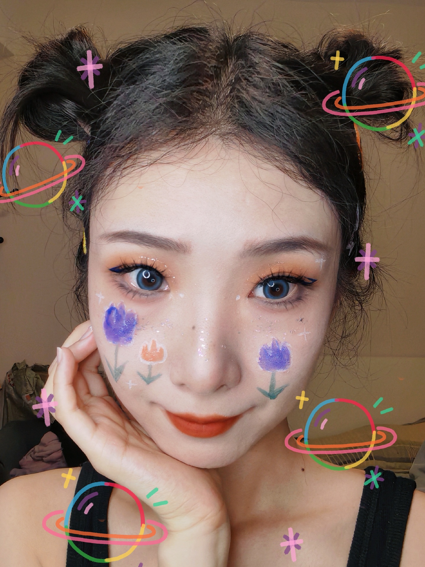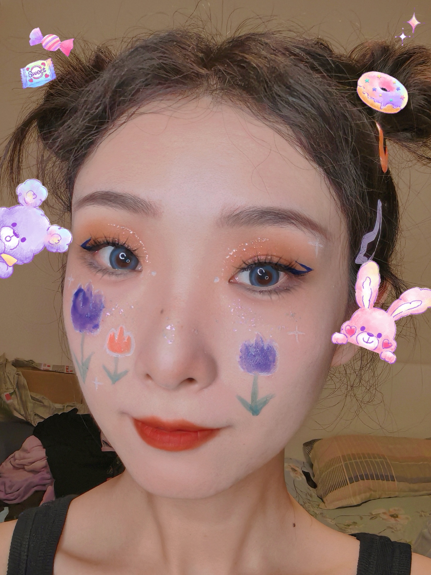 紫色和橙色的郁金香图案搭配橙色眼影和蓝色眼线~
