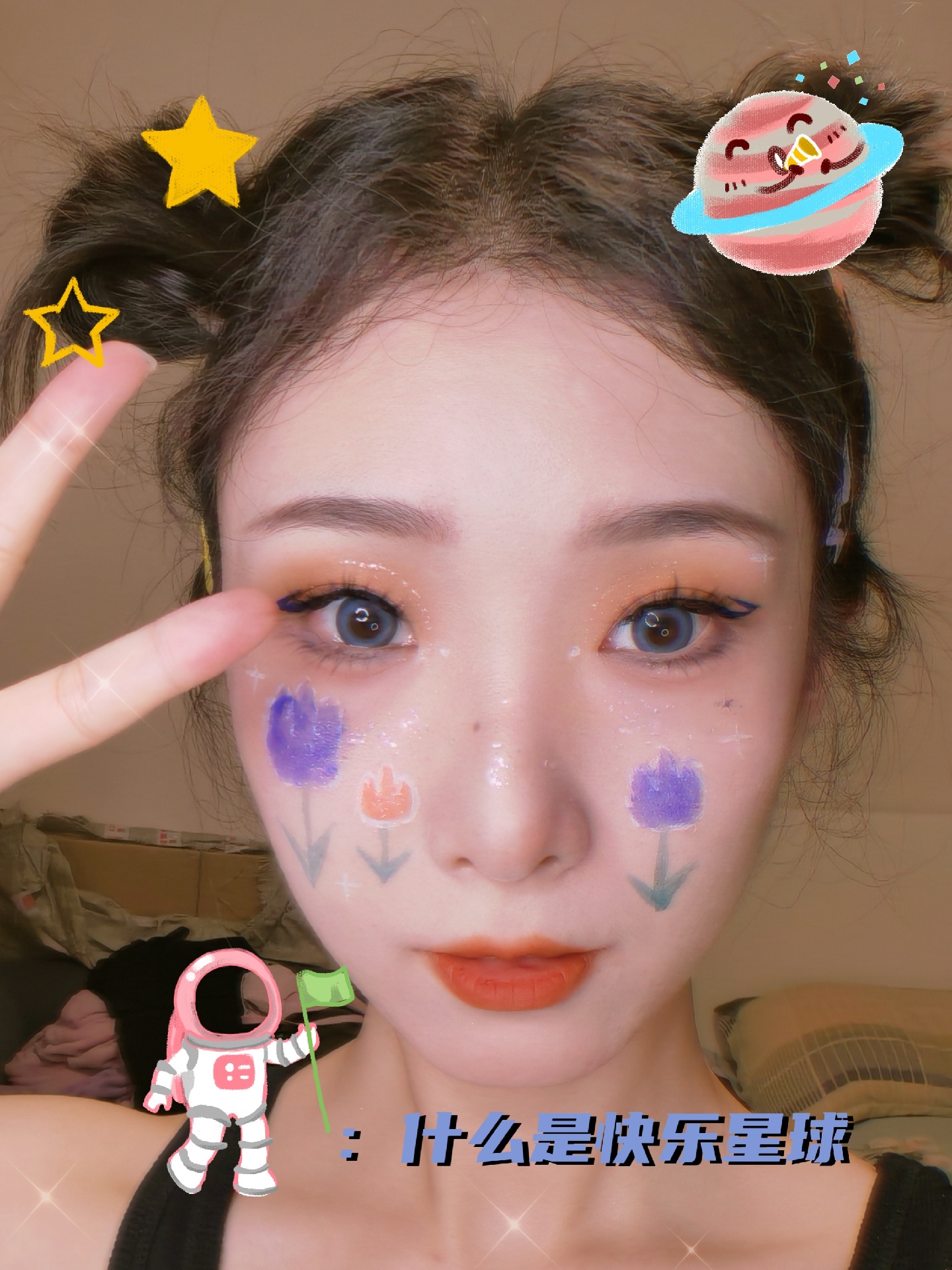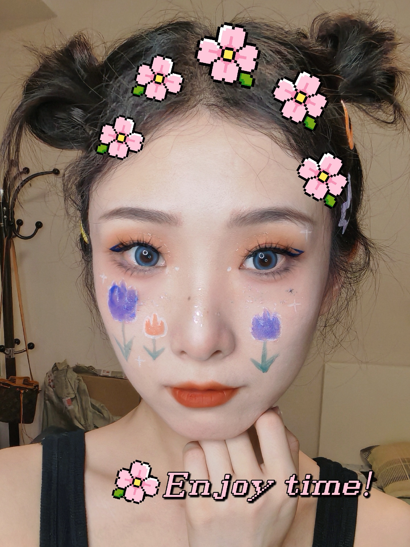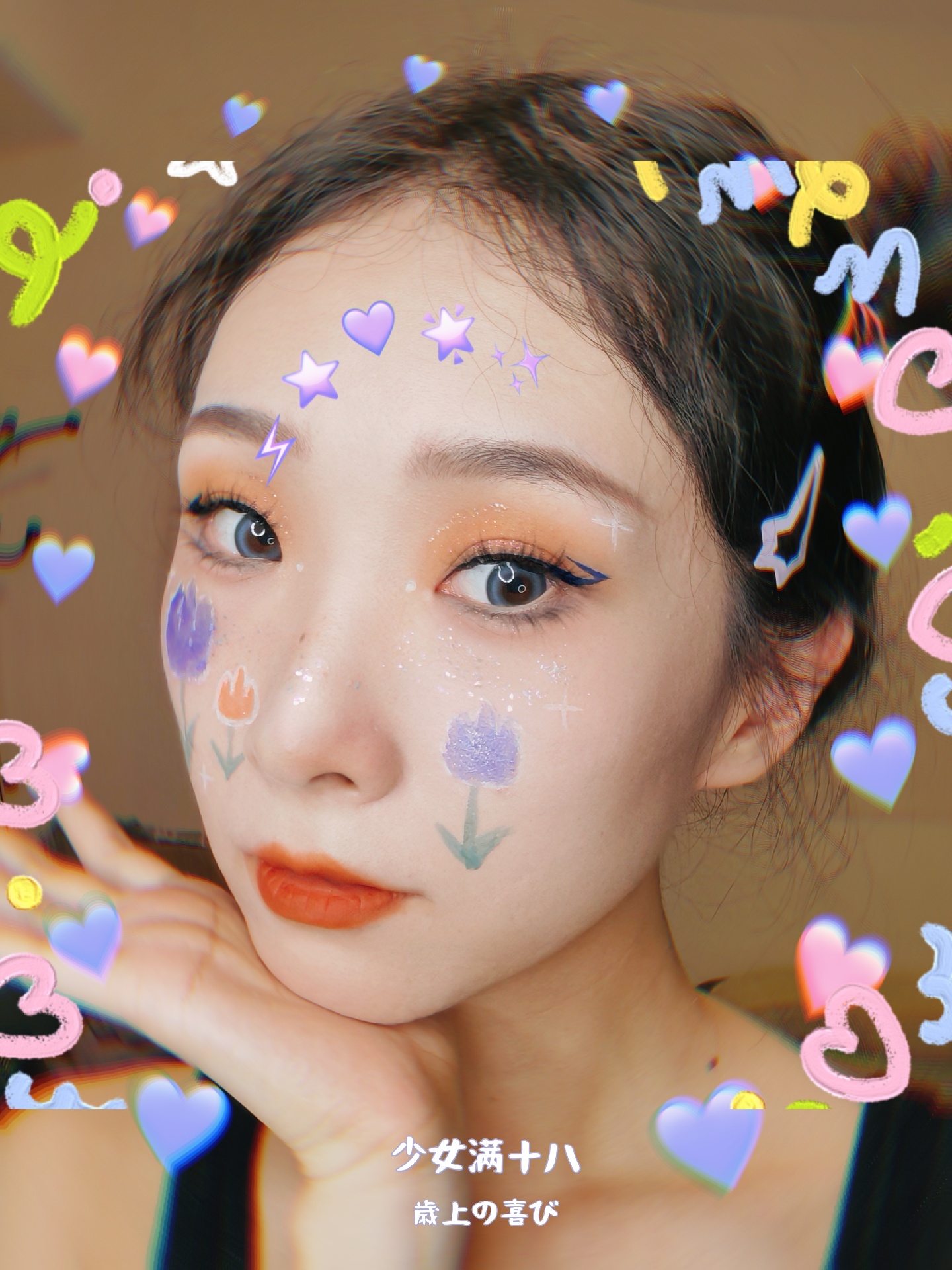 紫色和橙色的郁金香图案搭配橙色眼影和蓝色眼线~
