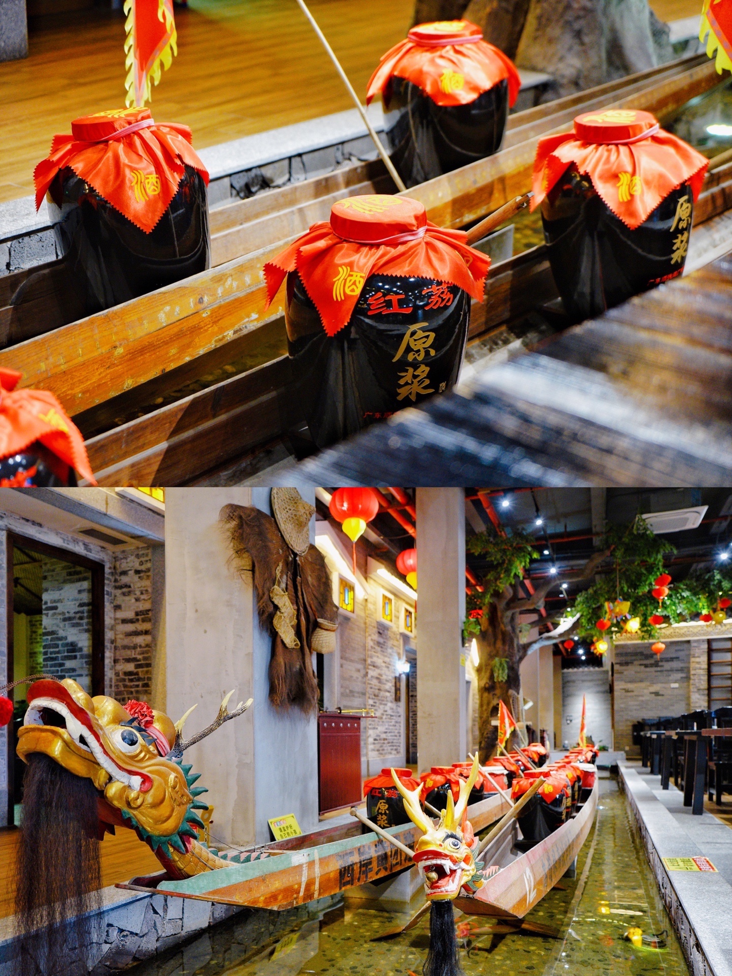 装修走的是园林渔乡风情,餐厅内花灯高悬,绿树婆娑,小桥流水之上还并排着两条真·龙船,红荔原浆铺于龙船之上,一种古朴的顺德风土人情,瞬间扑面而来。
