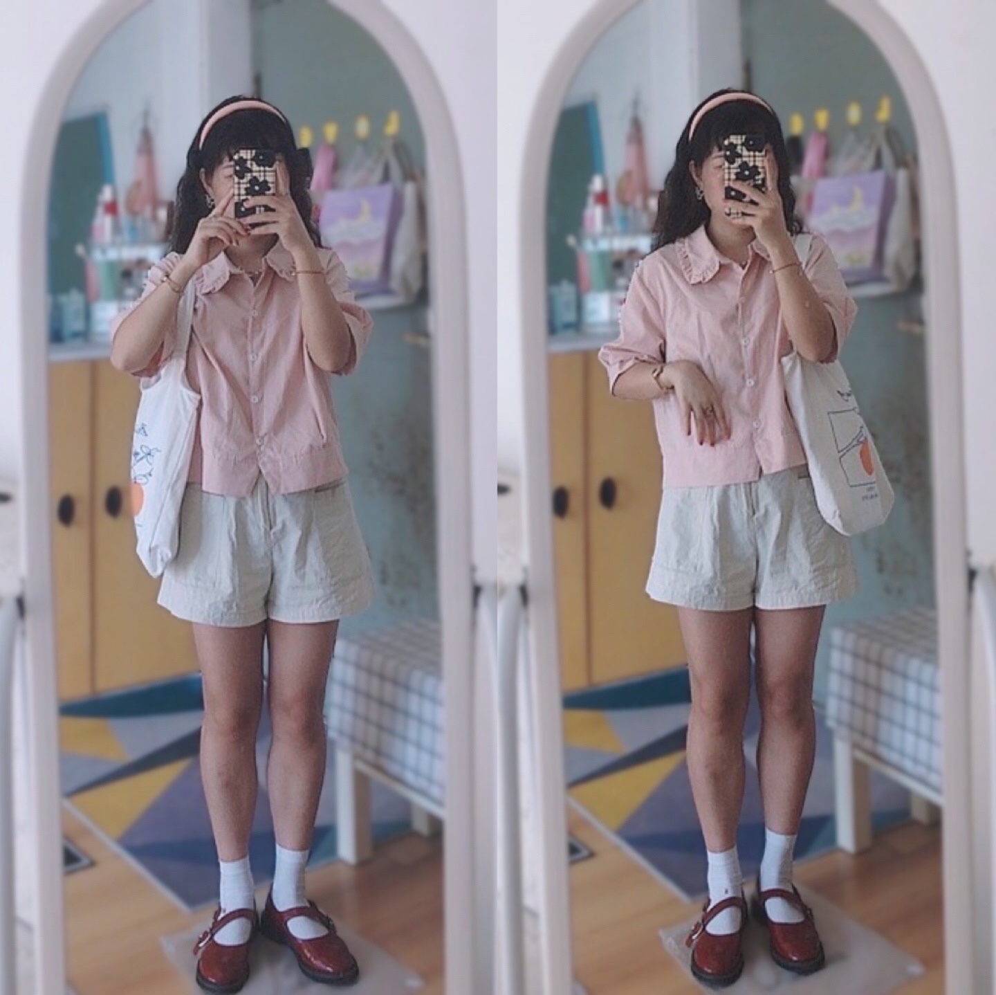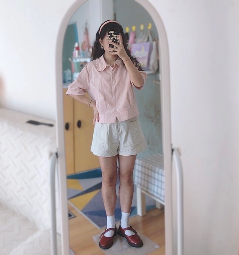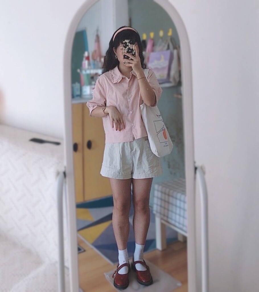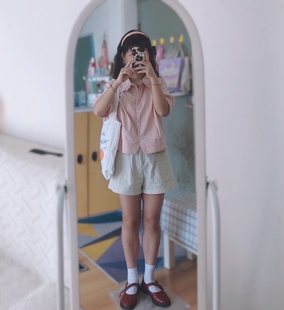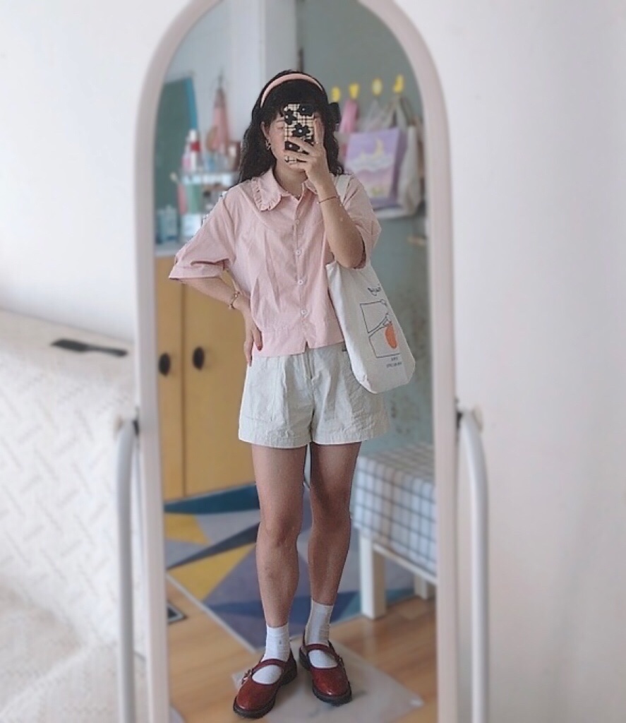 🫧 粉色上衣+杏色阔腿短裤+小皮鞋+帆布包