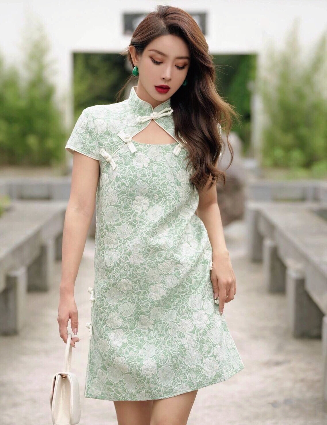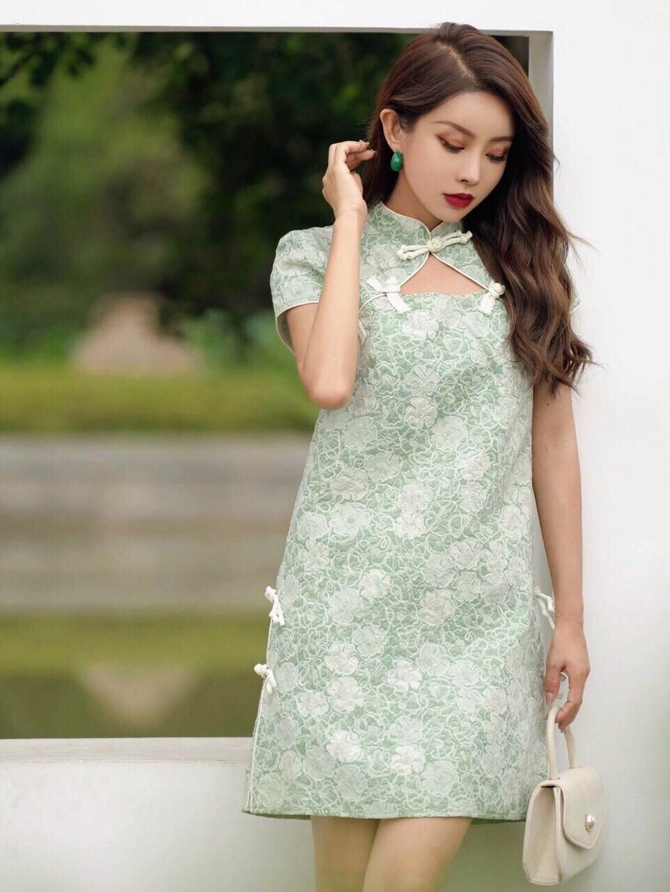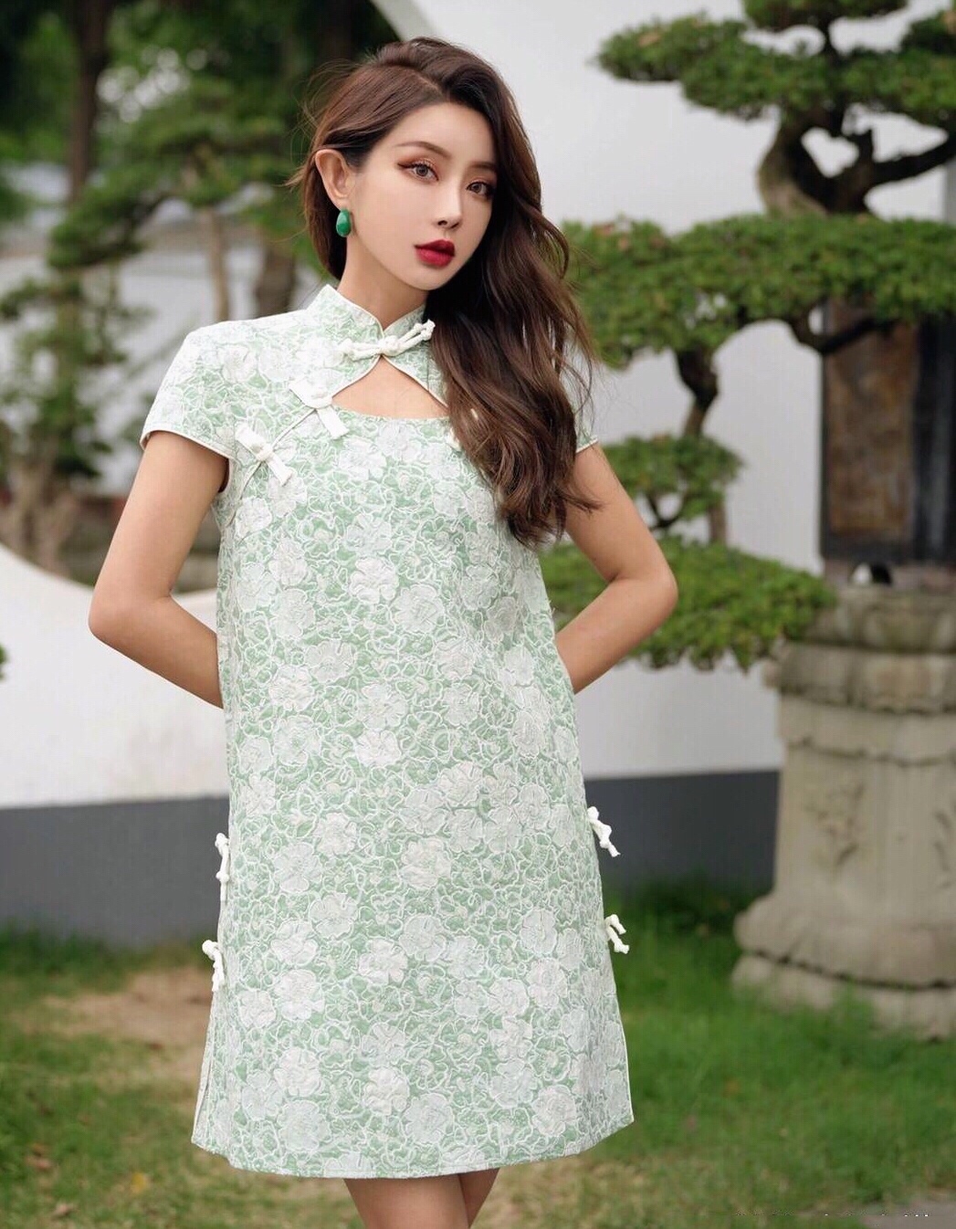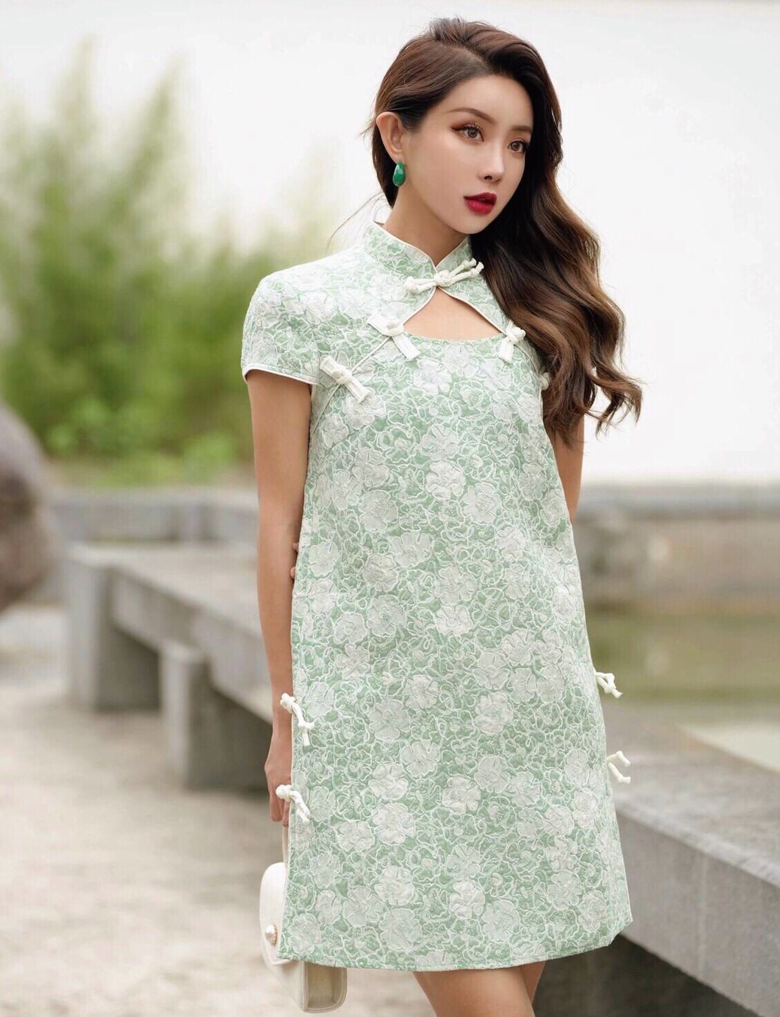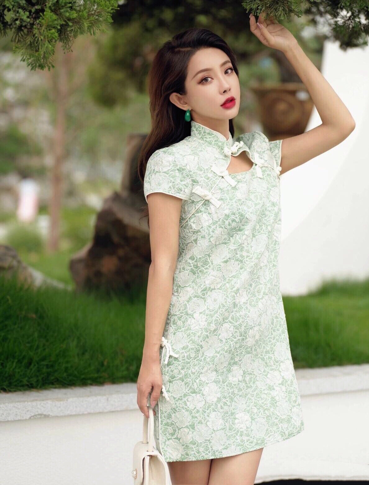 新中式穿搭,穿一件奶绿色旗袍清爽一夏~