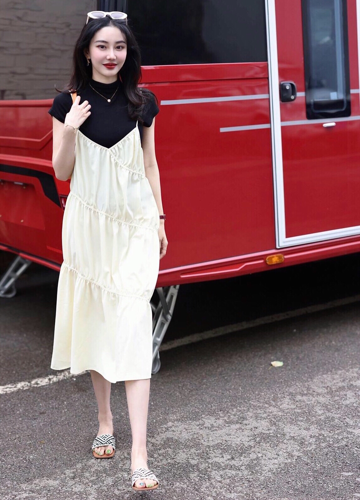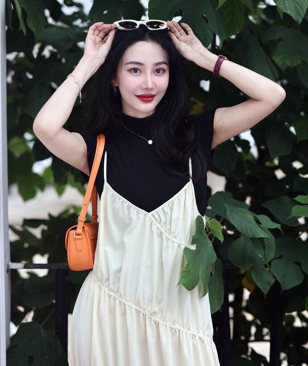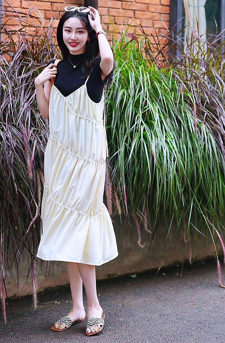 奶白色吊带裙叠穿黑色T恤,让穿搭更有层次感,偶尔少女一下吧🤪
