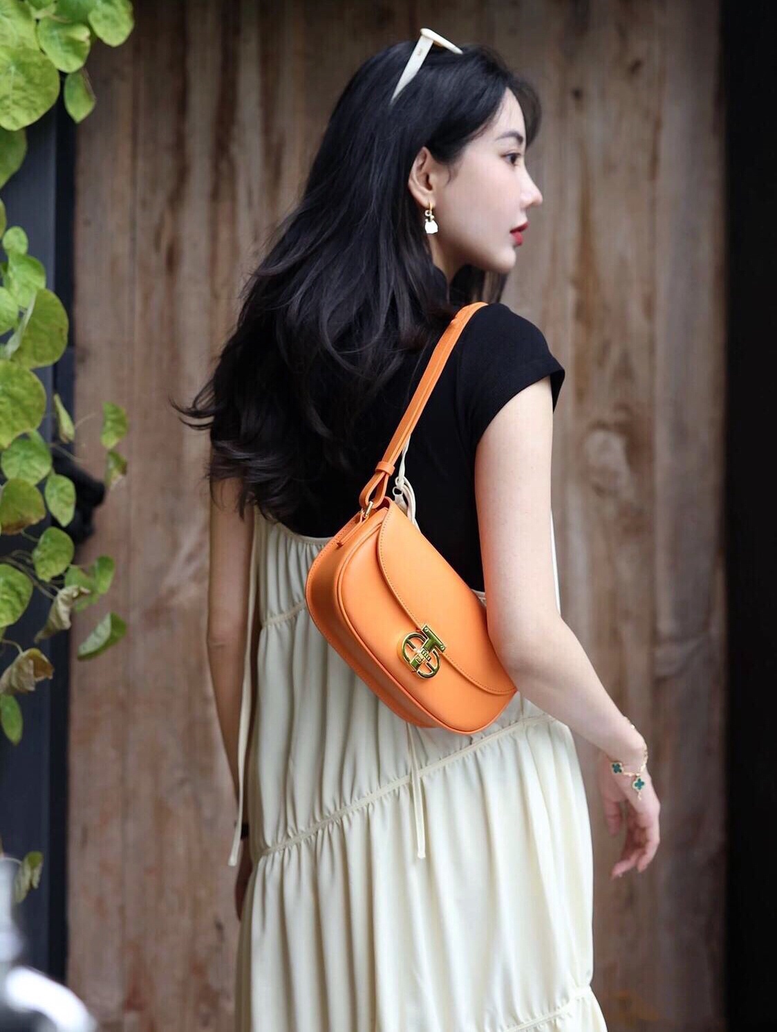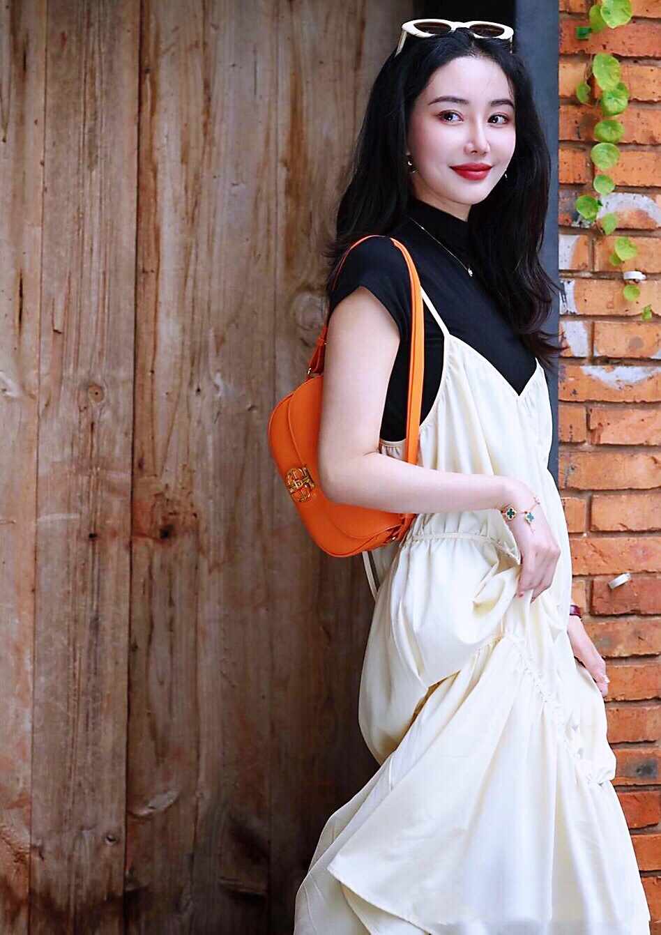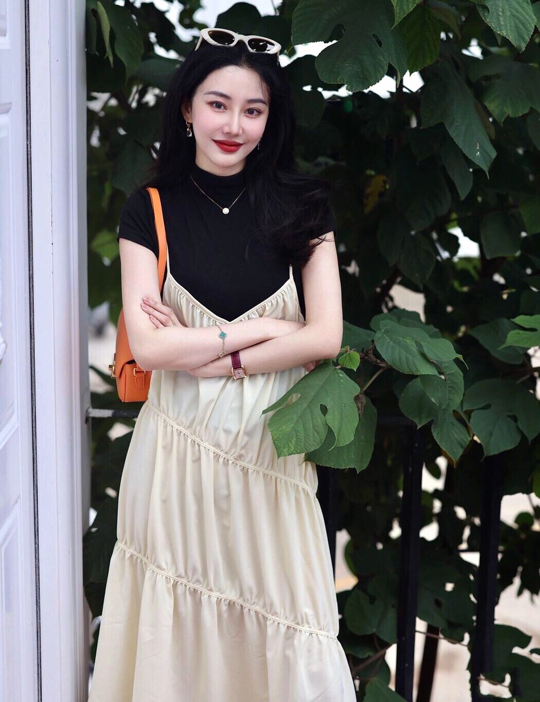 奶白色吊带裙叠穿黑色T恤,让穿搭更有层次感,偶尔少女一下吧🤪