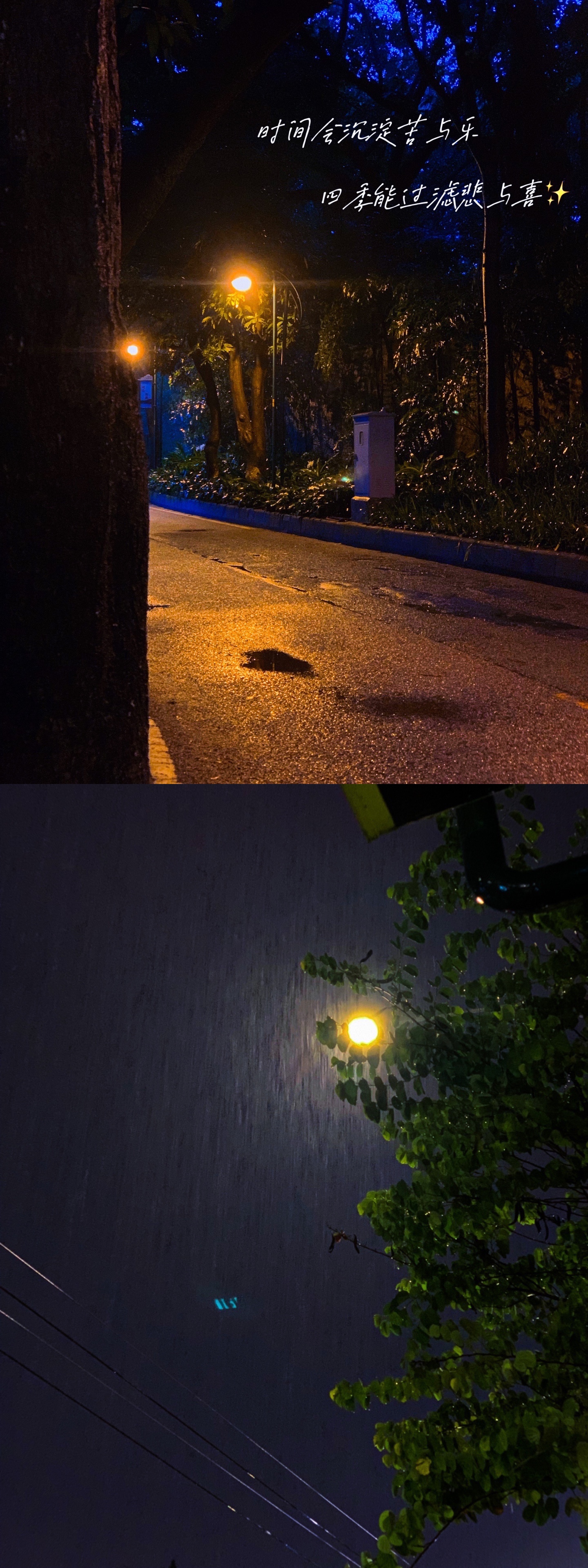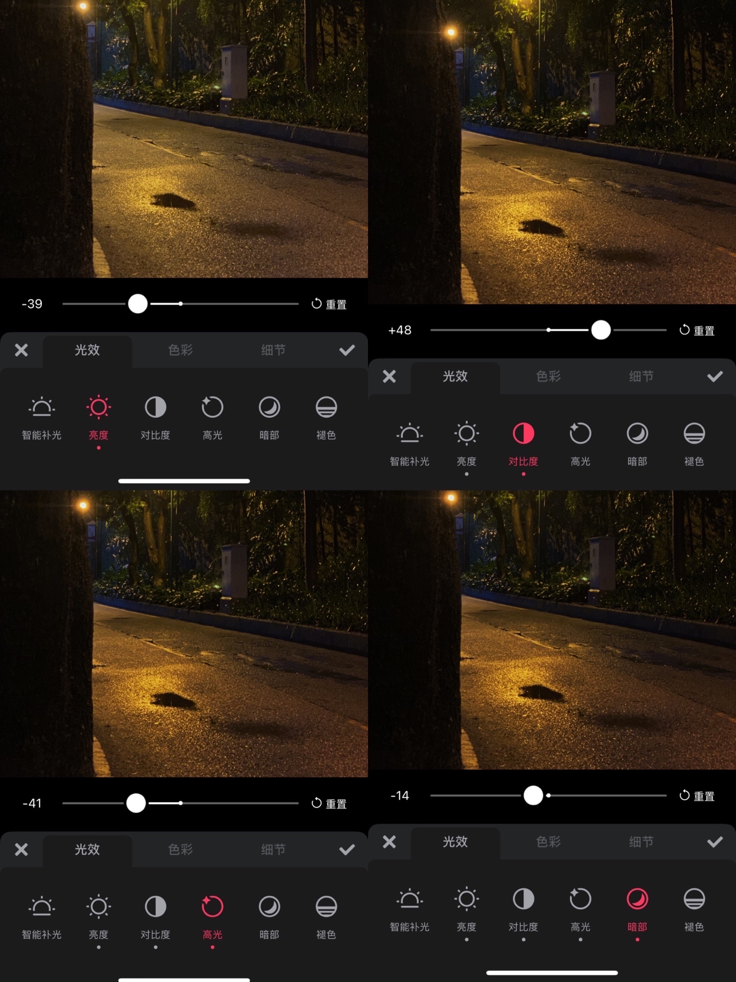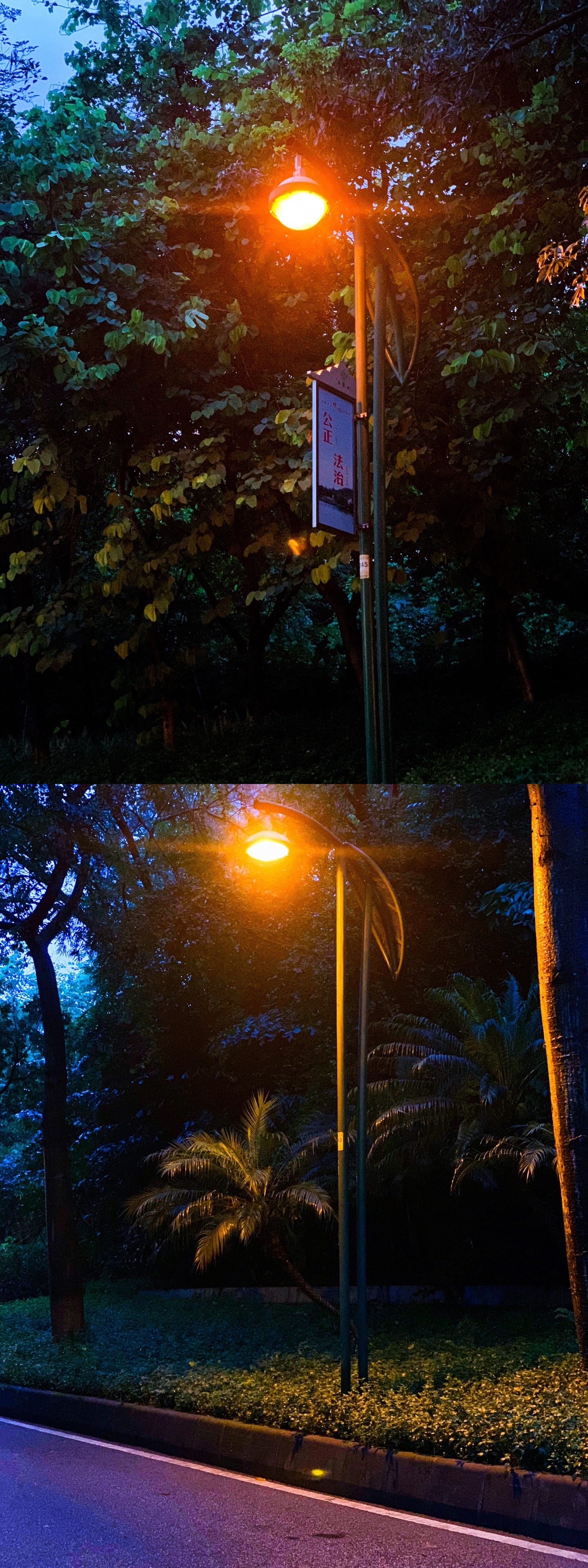在路上遇到好看的路灯,假如手机拍出来比较亮没有氛围感可以试试把亮度调低在把对比度拉高