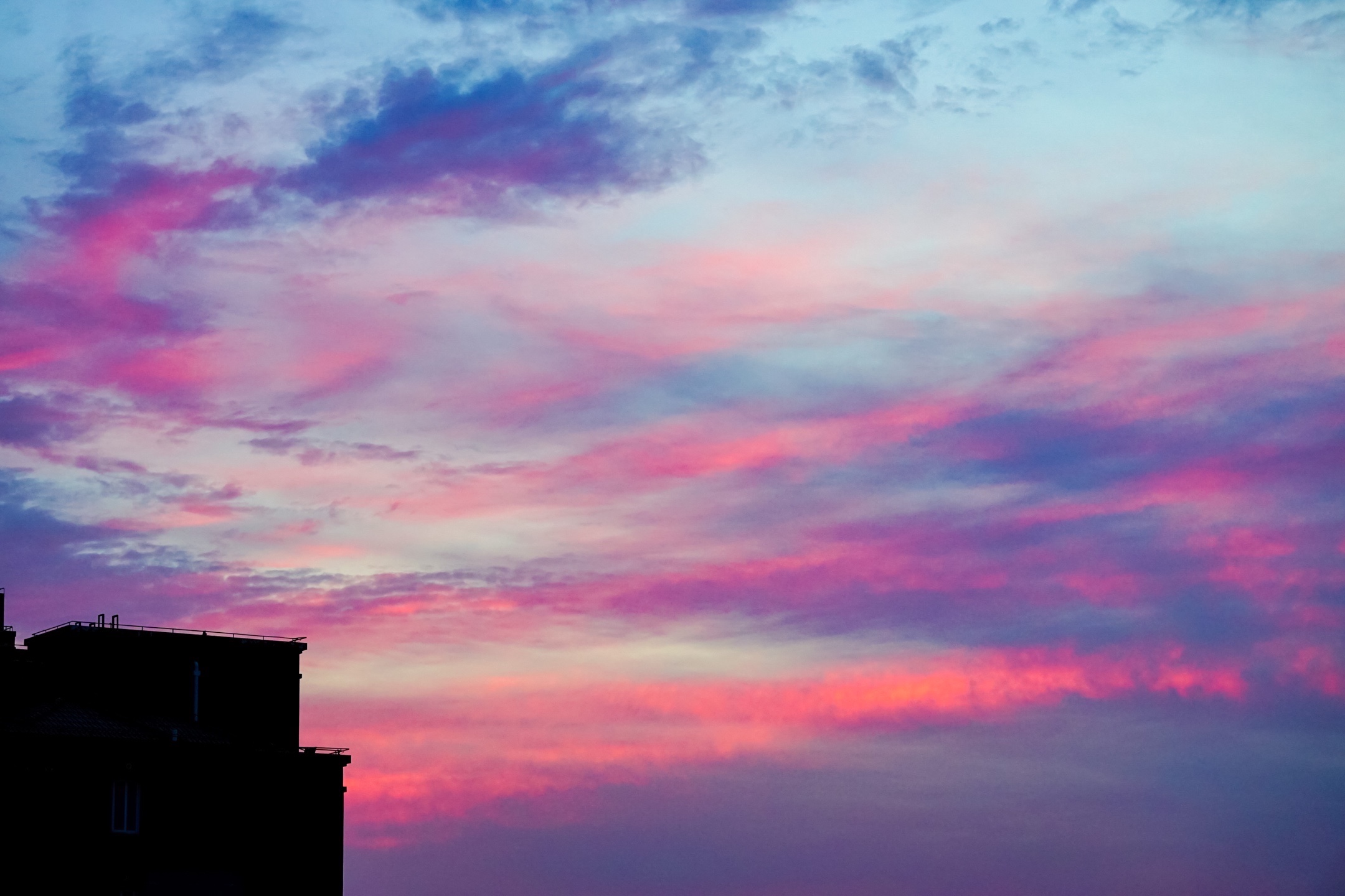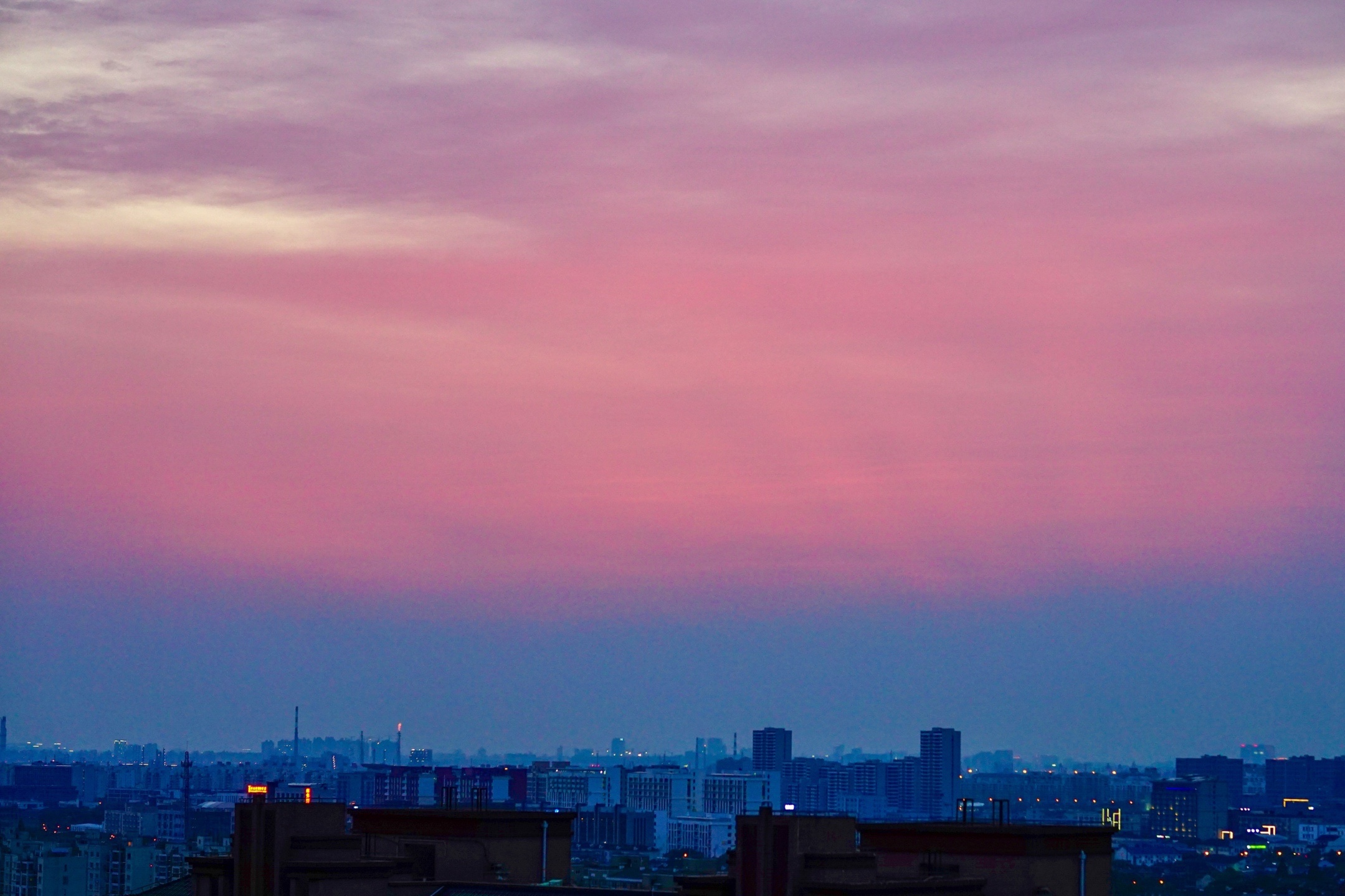 今天是淡粉色的晚霞,比火烧云不强烈,但是也很美