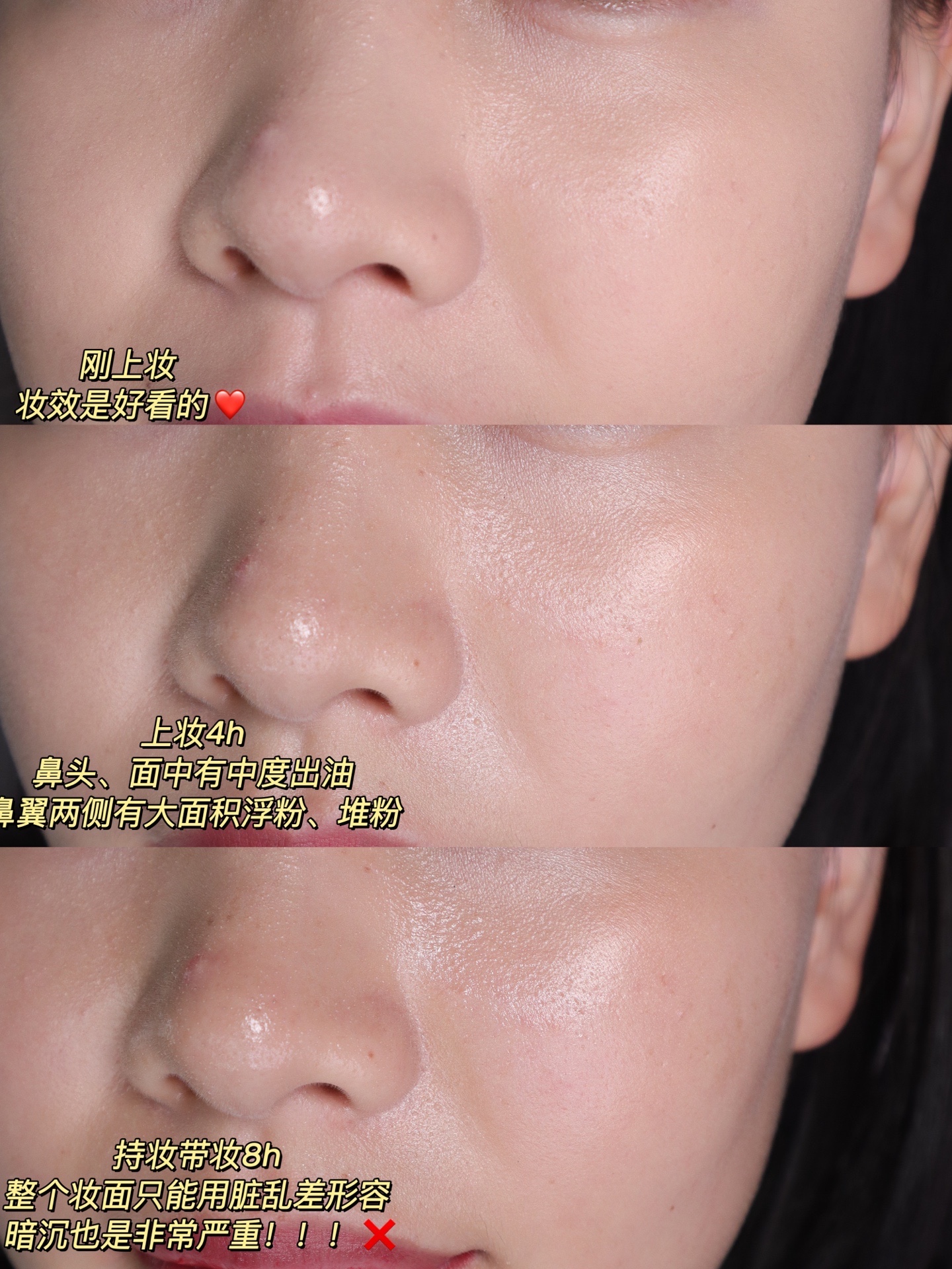 🍧持妆持色:太差,4h就已经没什么遮瑕力了,面中也开始泛油光,下巴浮粉加剧,法令纹处有明显的纹路,8h以上情况更加糟糕😰暗沉就更不用说了一塌糊涂!!!