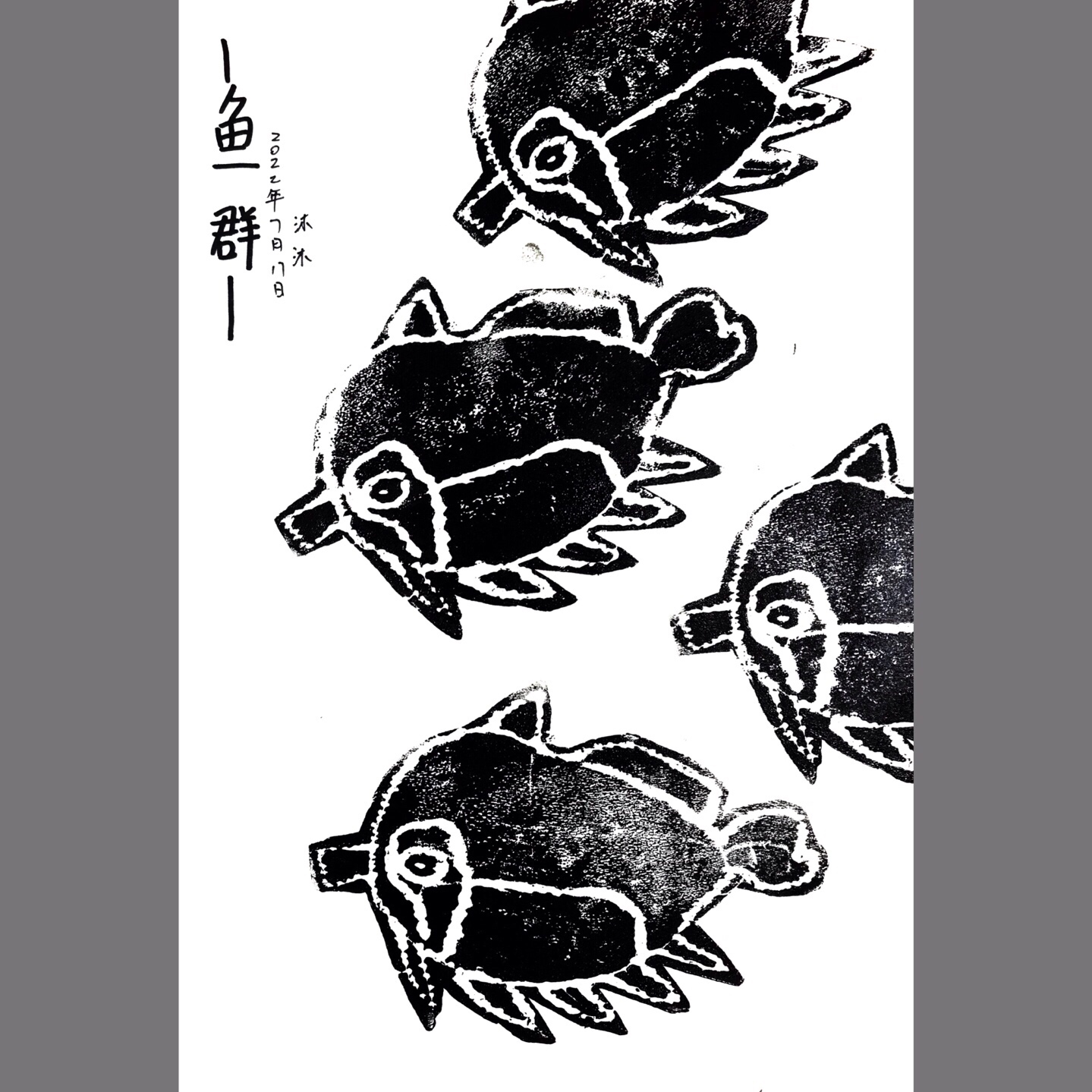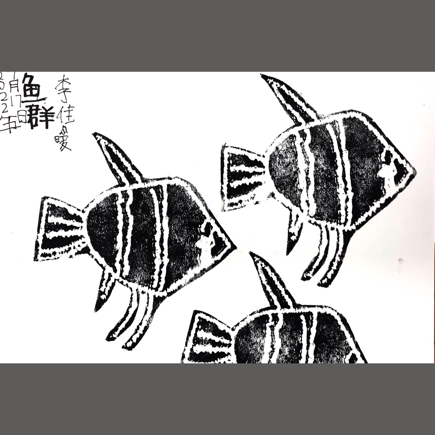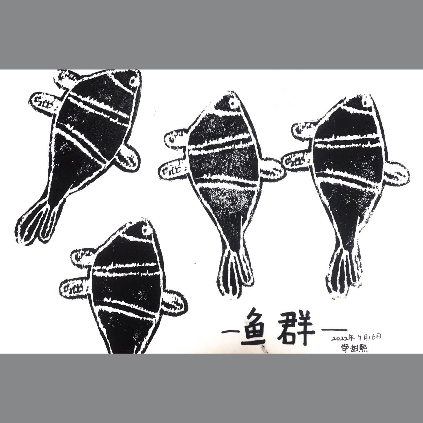 《鱼群》通过绘本《大鱼吃小鱼》让小朋友了解团队协作的重要性,并通过观察鱼群的特点了解鱼群的鱼的相似性以及鱼群多少大小的分布,让小朋友对后期画面构图有所掌握。本节课运用版画的形式来让小朋友感受不一样的创作形式。