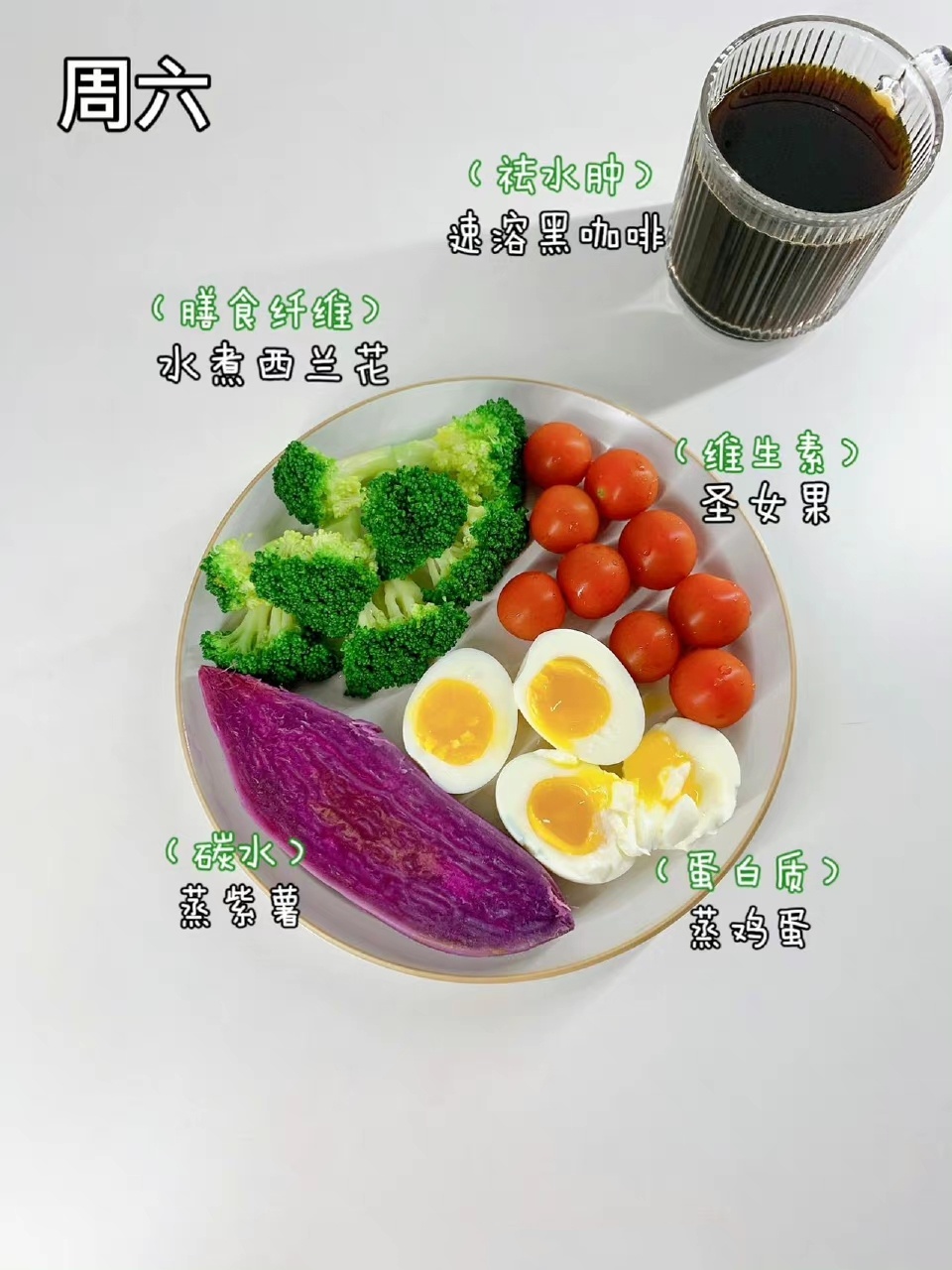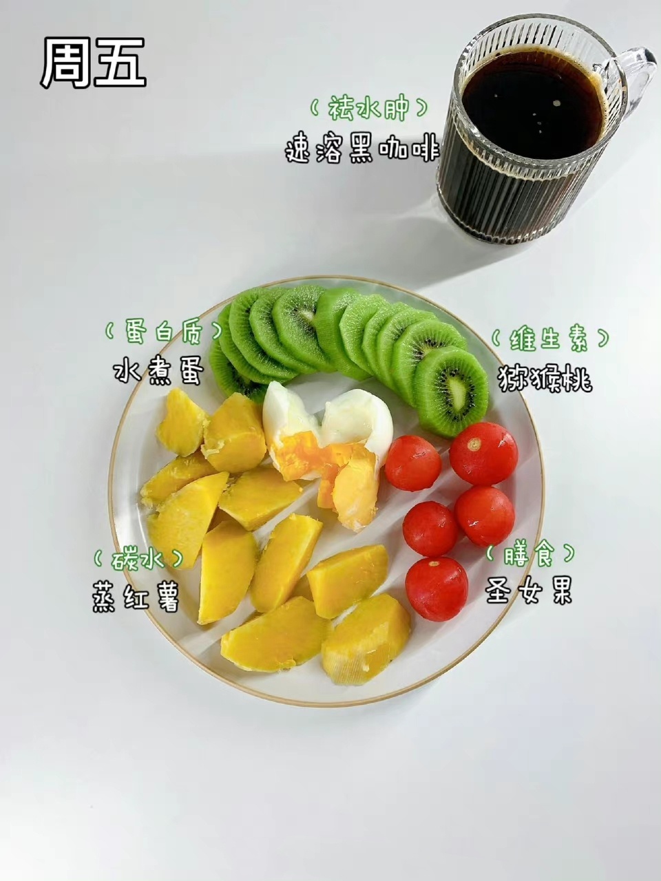 周五✔️蒸红薯🍠 圣女果🍅 蒸鸡蛋🥚 猕猴桃🥝 速溶黑咖啡☕️