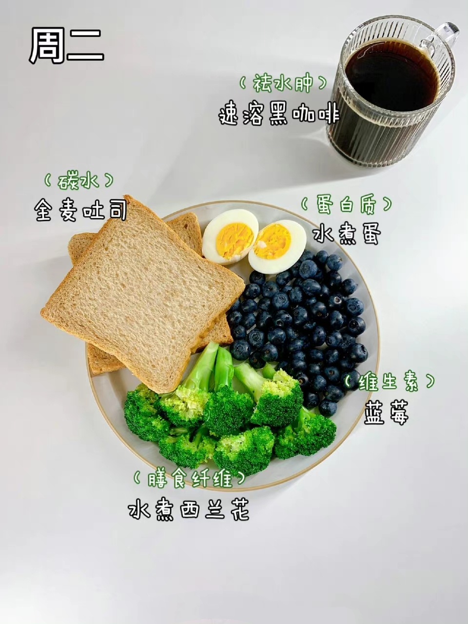 周二✔️全麦吐司🍞 蒸鸡蛋🥚 煮西兰花🥦 蓝莓🫐 速溶黑咖啡☕️