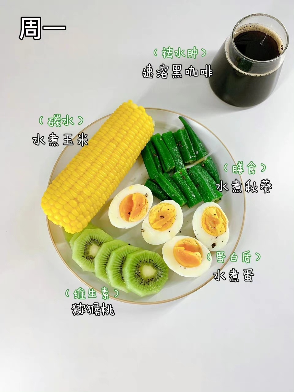 周一✔️水煮玉米🌽 水煮秋葵 蒸鸡蛋🥚 猕猴桃🥝 速溶黑咖啡☕️