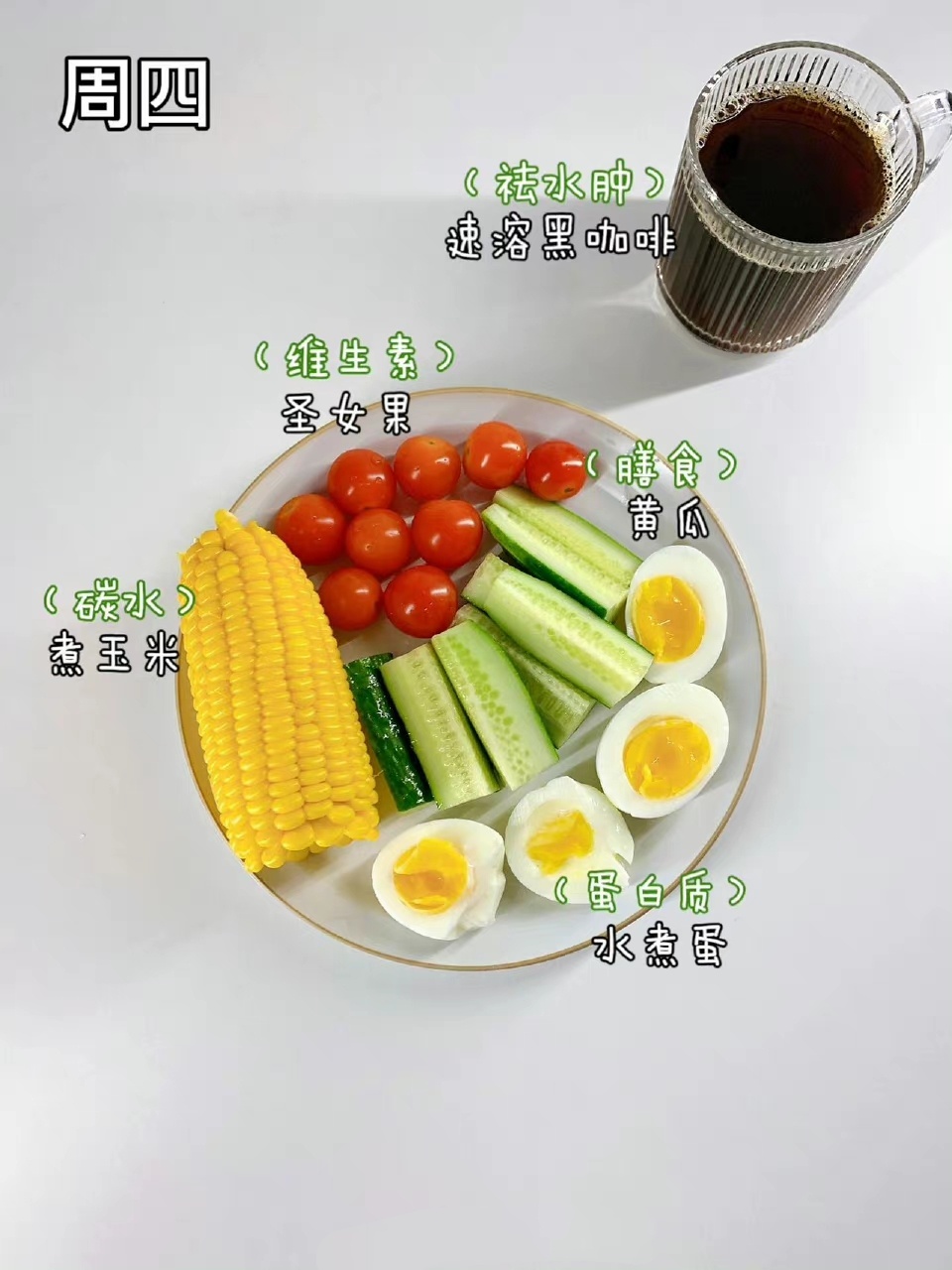 周四✔️煮玉米🌽 圣女果🍅 蒸鸡蛋🥚 黄瓜🥒 速溶黑咖啡☕️