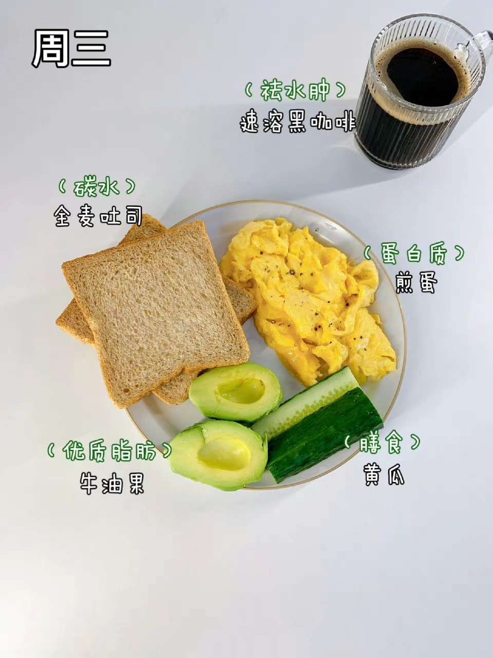周三✔️全麦吐司🍞 煎蛋🍳 牛油果🥑 黄瓜🥒 速溶黑咖啡☕️