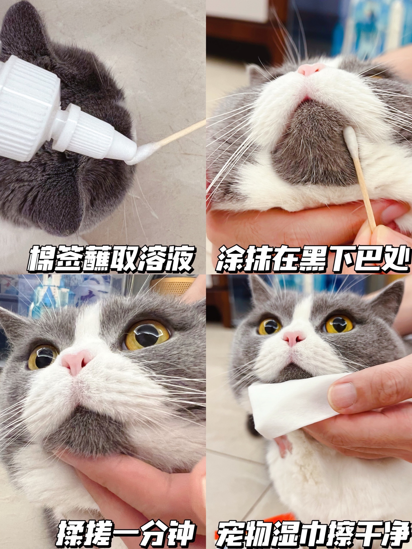 用法也简单,用棉签蘸溶液涂在黑下巴的地方,然后用手帮它们揉搓涂了溶液的地方,大概一分钟后用宠物湿巾擦干净就行啦~