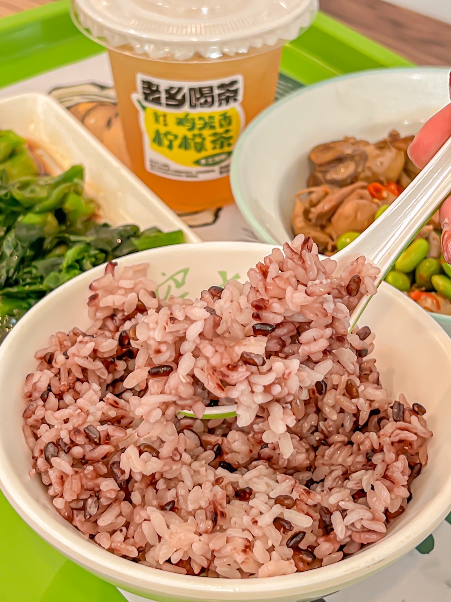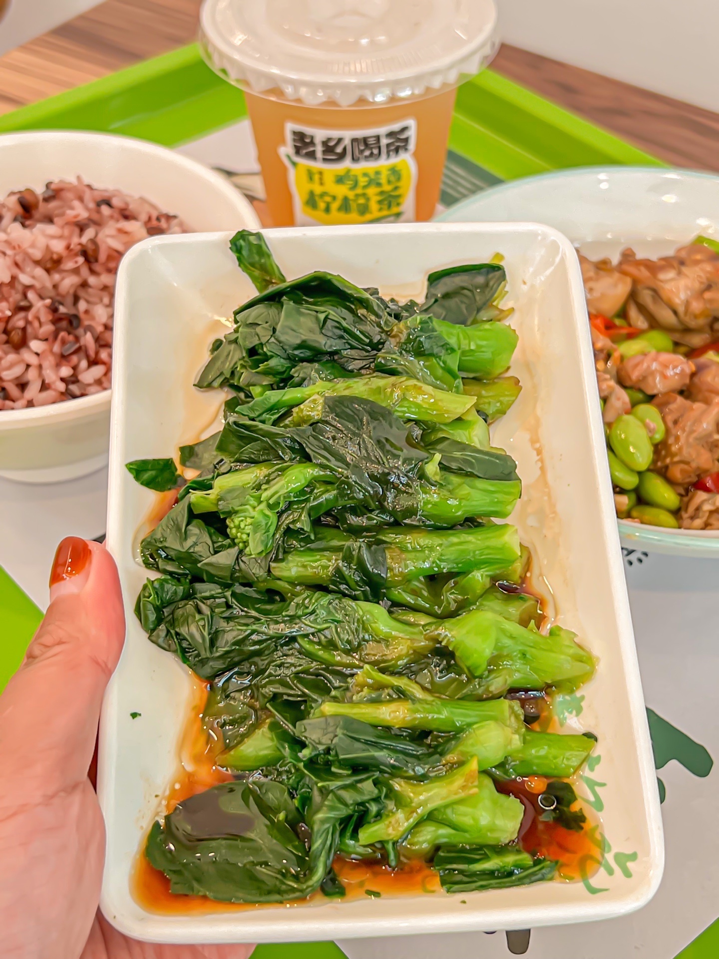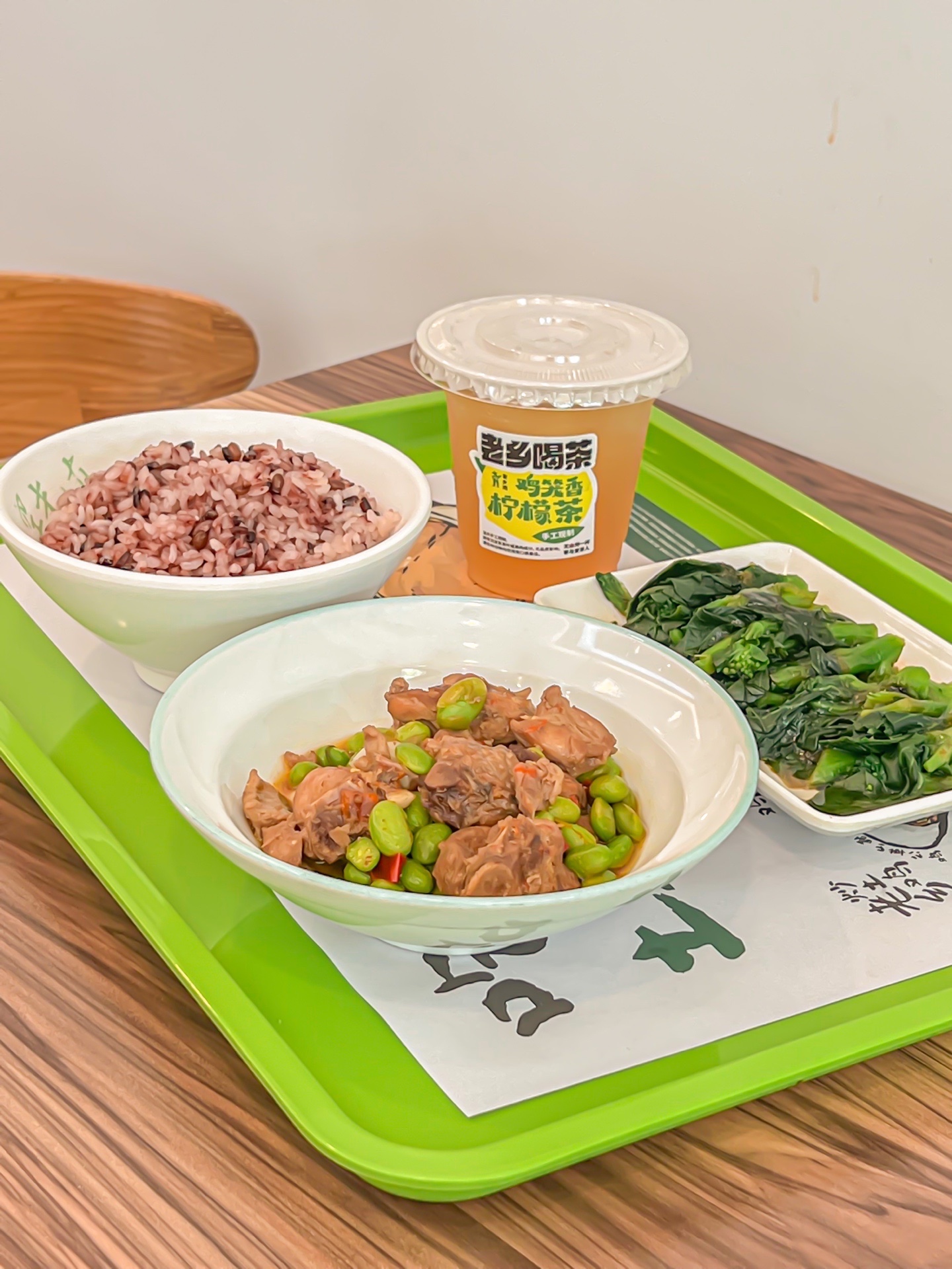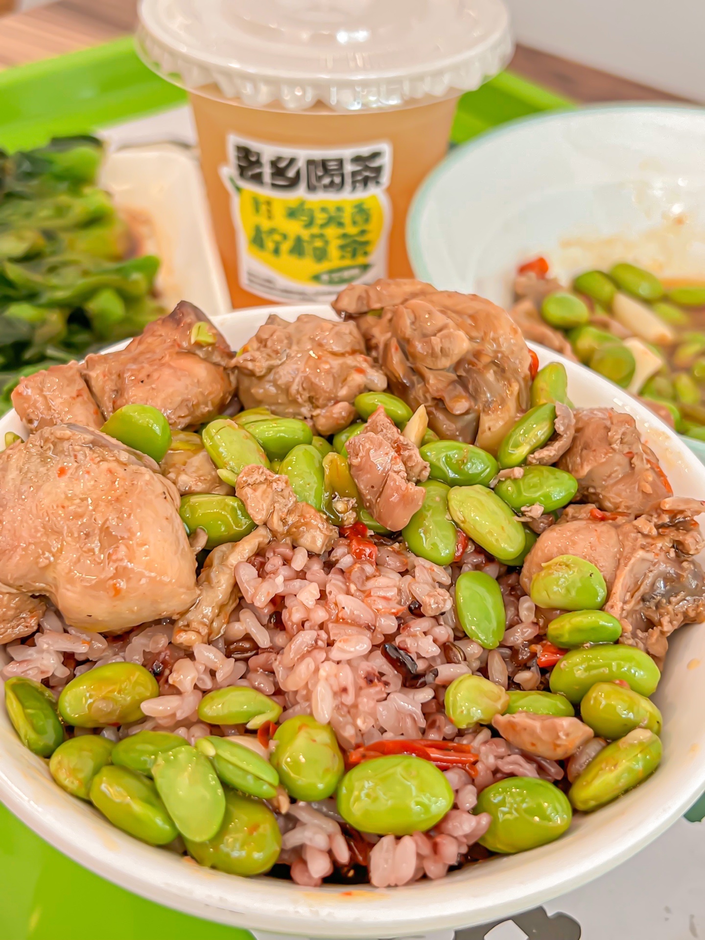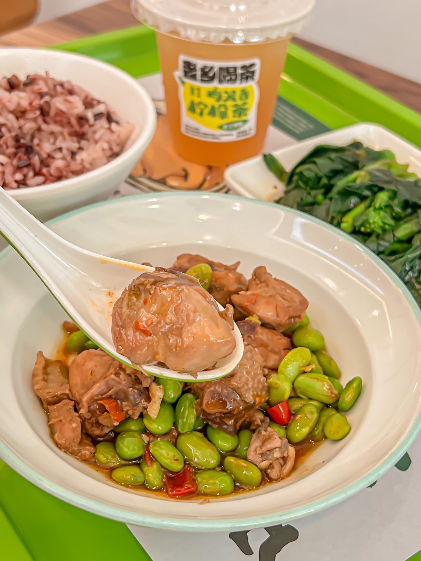 ✔️套餐包含毛豆烧土鸡、葱油菜苔、三黑元气饭和鸡笼香柠檬茶。