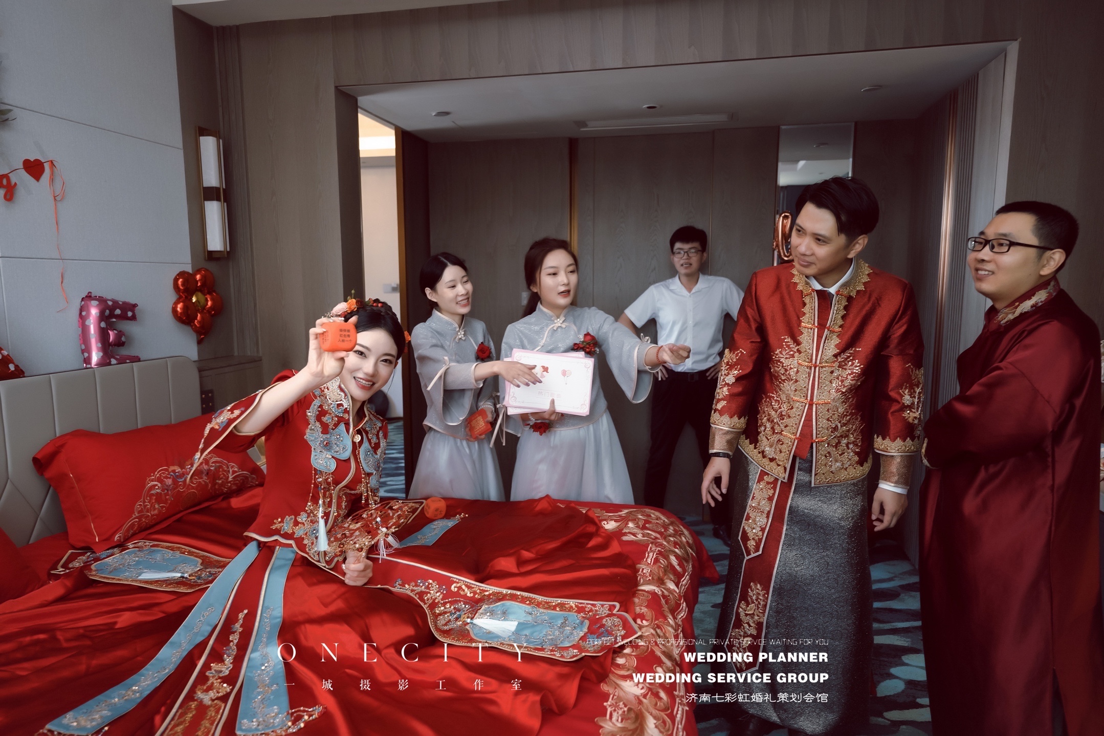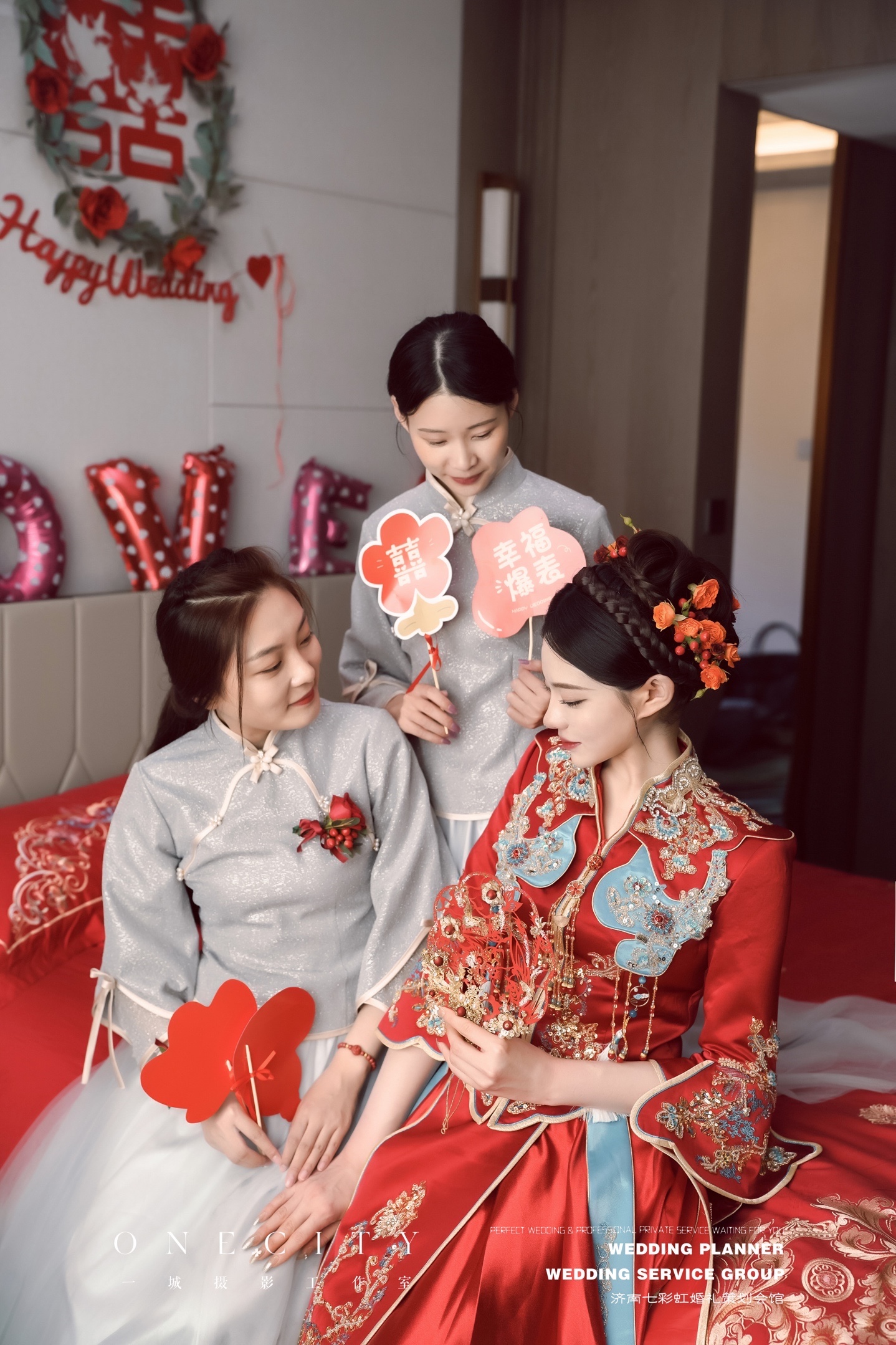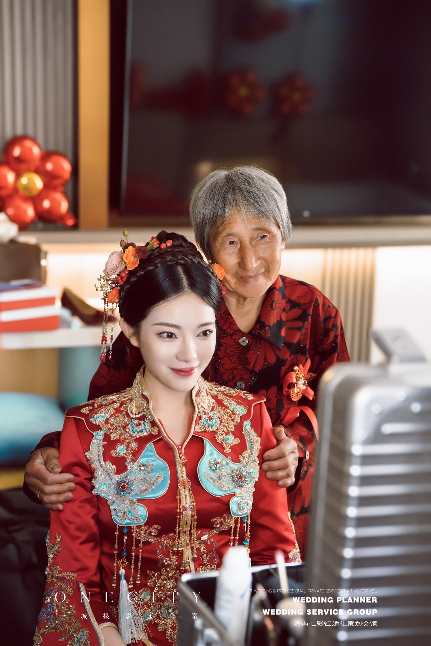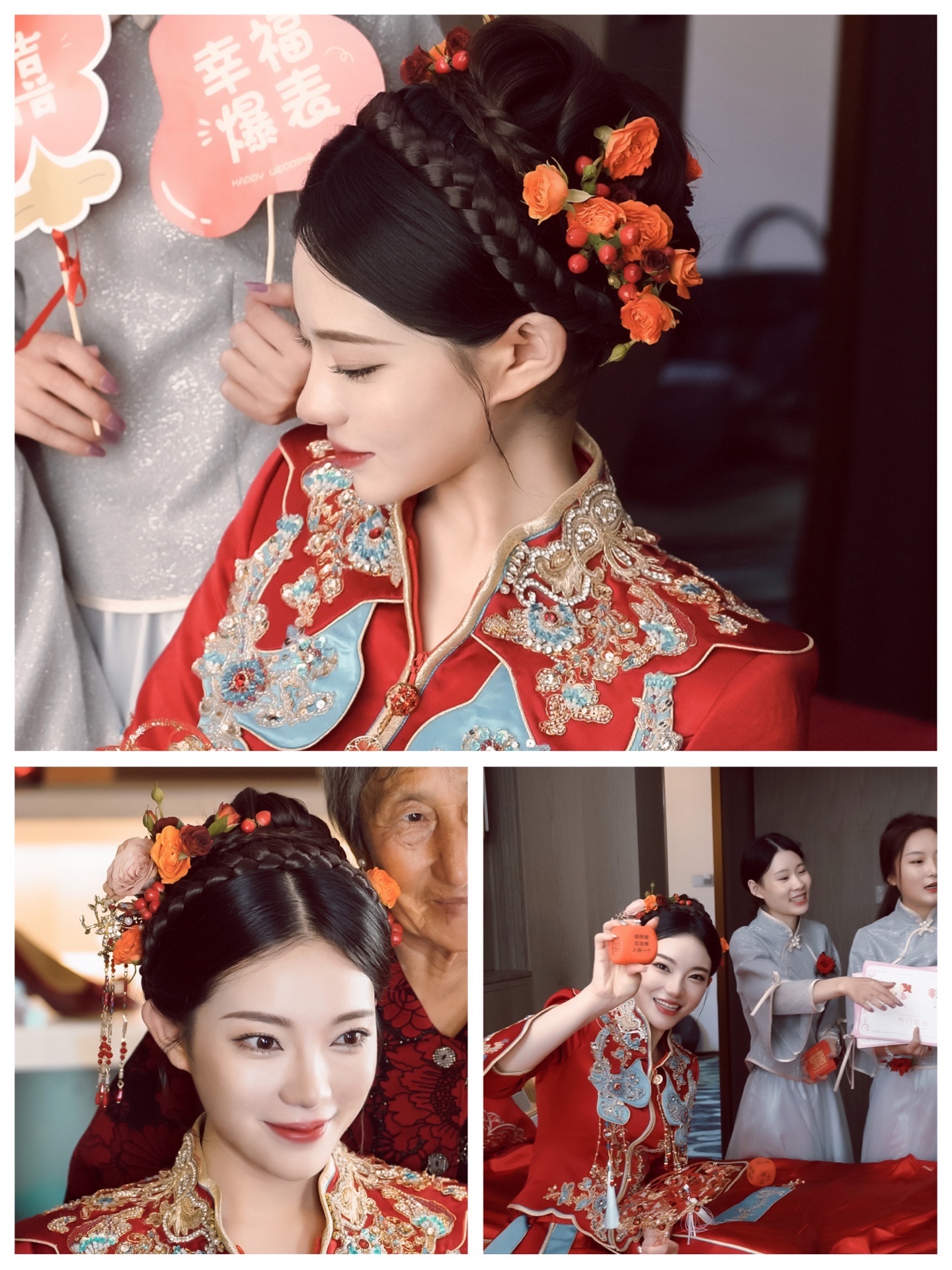 不要再土土的弄满头头饰啦,我也是看明星们结婚秀禾服发型都很简单,不想用钗子,以自己的头发为主,造型师就自己买了鲜花帮我做的头饰,夏季用鲜花就是很清爽,本身秀禾服就重工,装饰多,鲜花可以中和一下。
