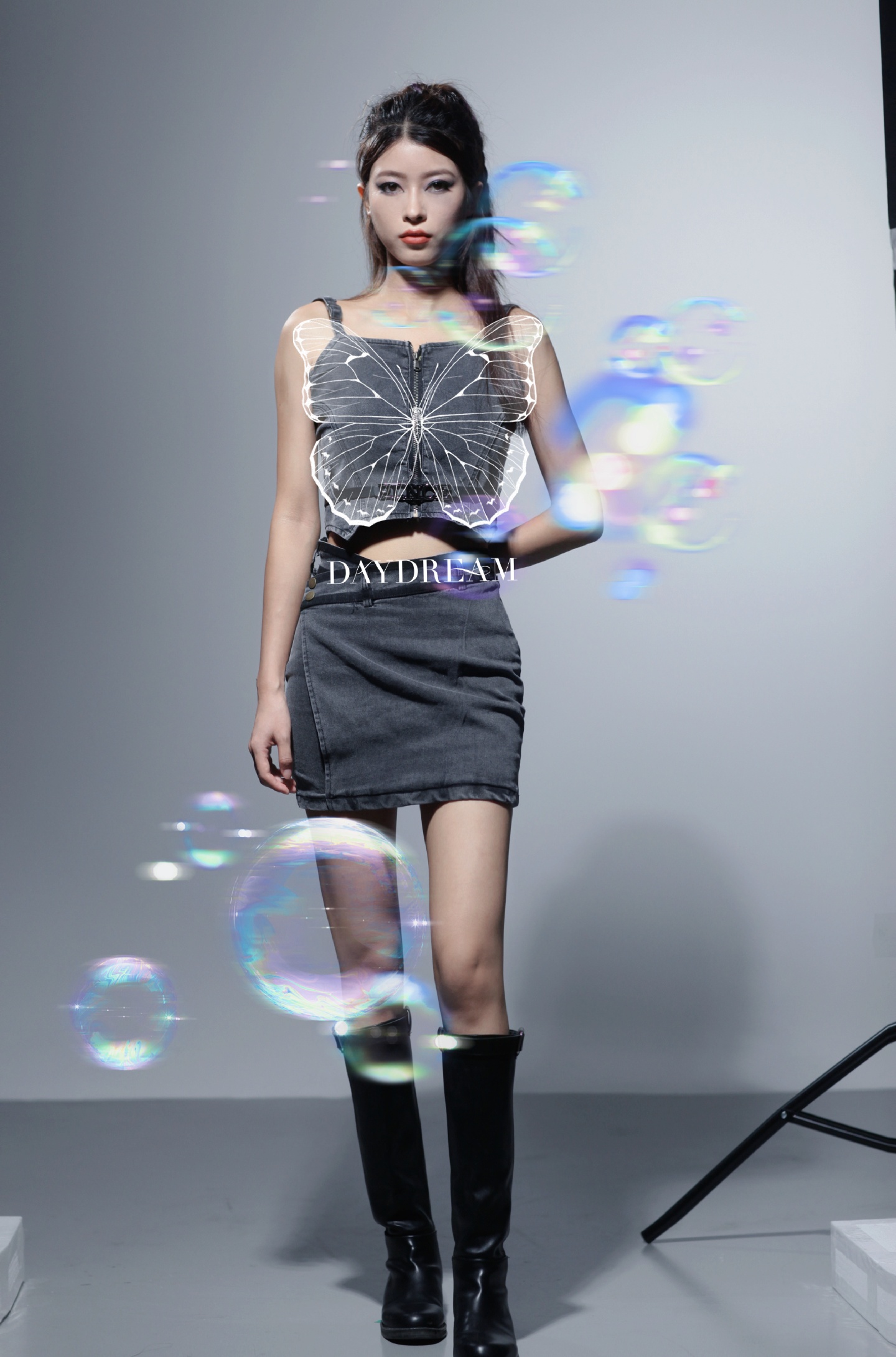 服装:辣妹牛仔吊带套装+直筒皮靴