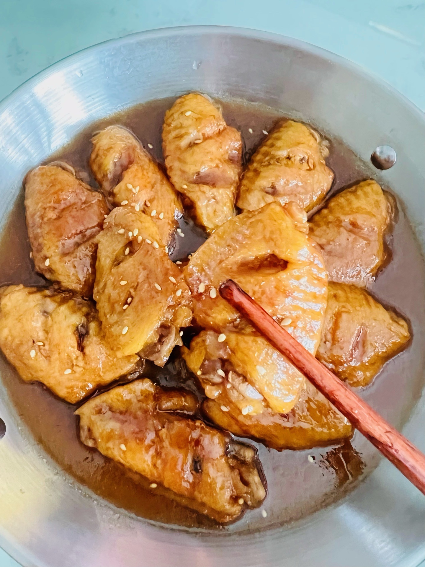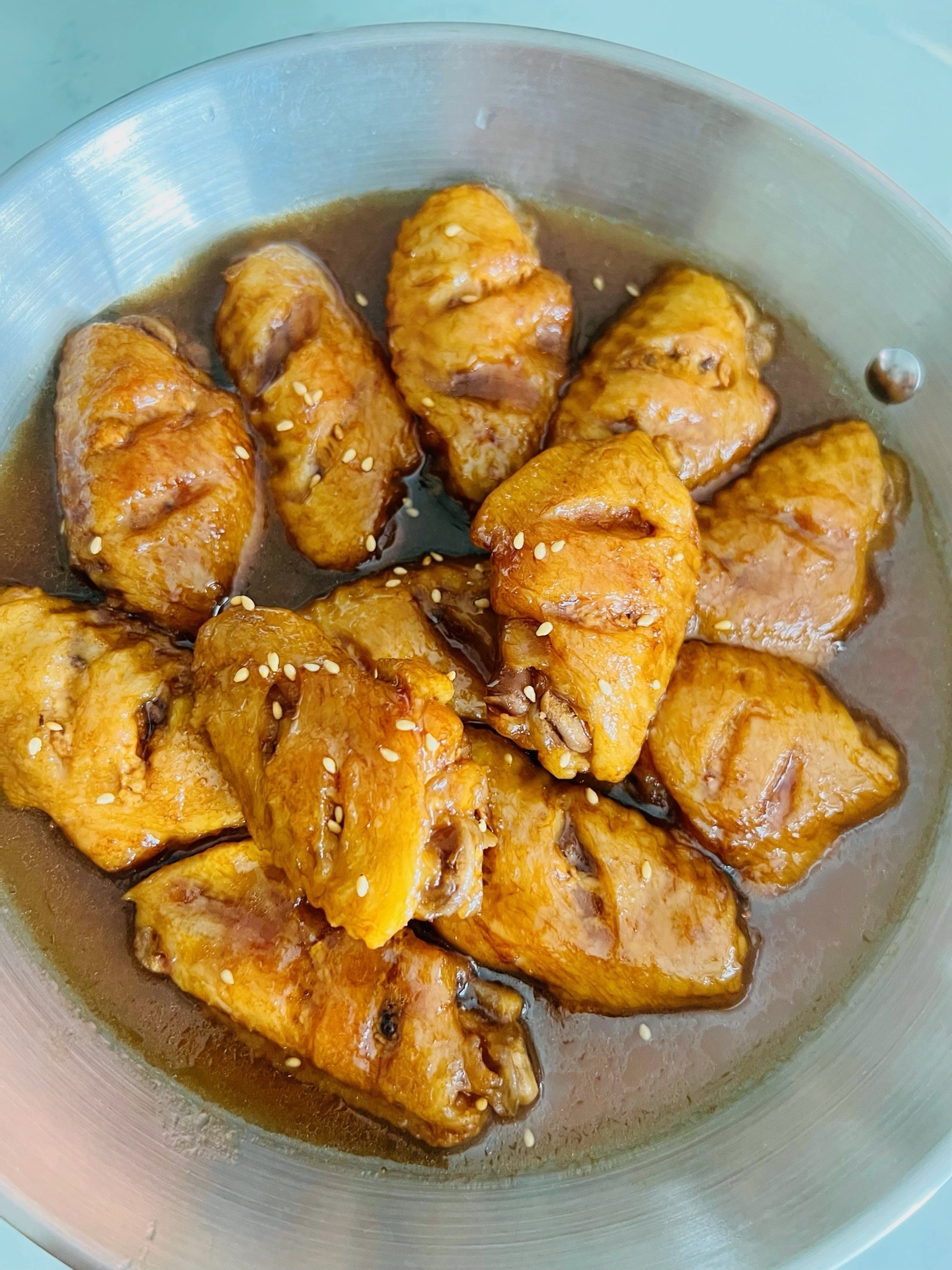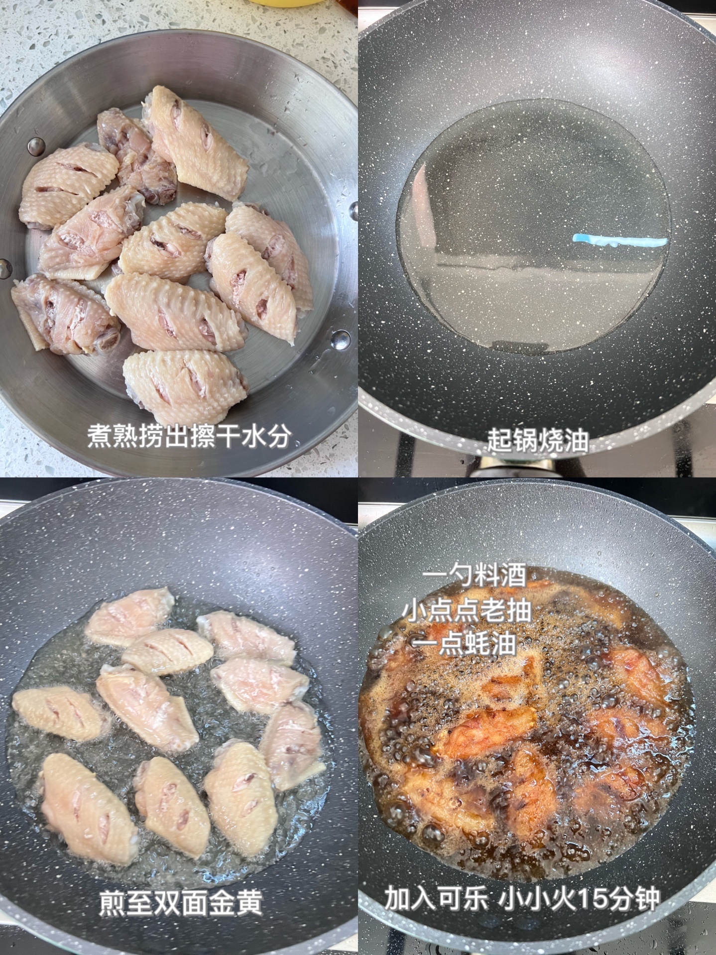 2️⃣锅热之后,倒入油,再放鸡翅,煎至两面金黄,➕一勺料酒➕一点老抽➕蚝油➕两勺白糖➕一厅可乐。大火煮开之后,中小火继续煮十几分钟,汤汁浓稠就好了