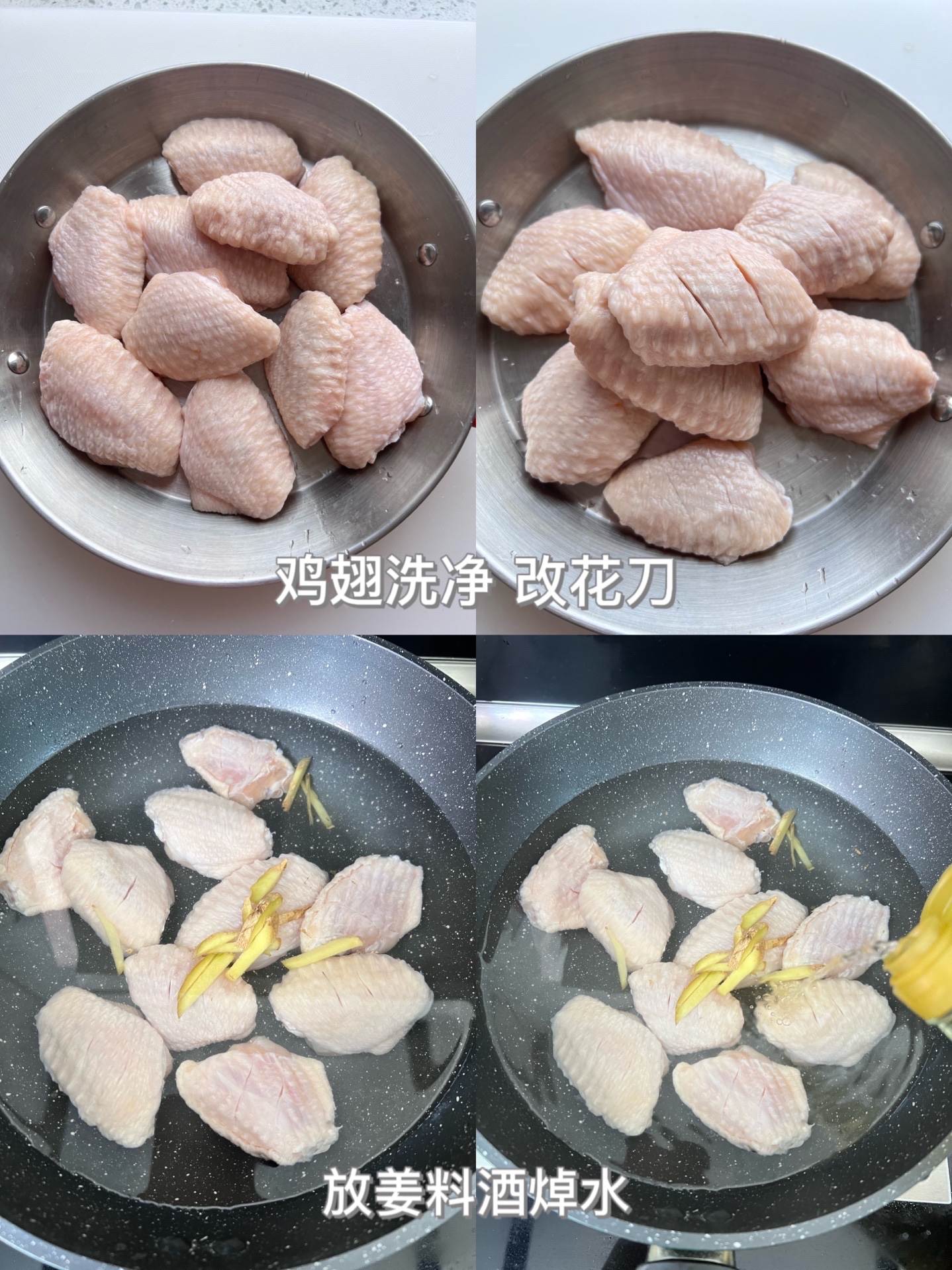 做法:1️⃣鸡翅洗干净,两边都划两道口子,然后冷水下锅,➕料酒➕生姜。煮开之后,捞出过凉水洗干净。用纸把鸡翅表面水分擦干