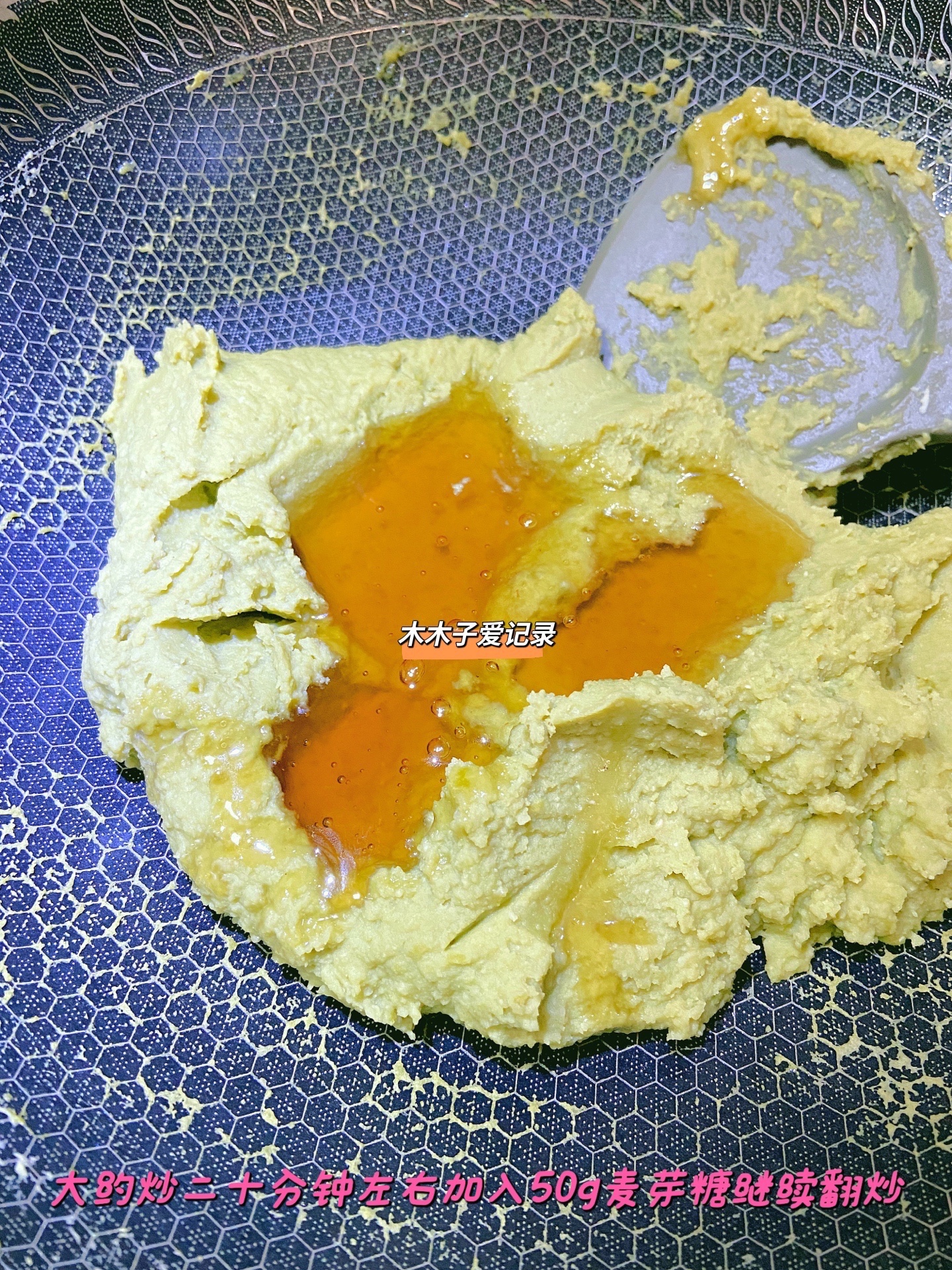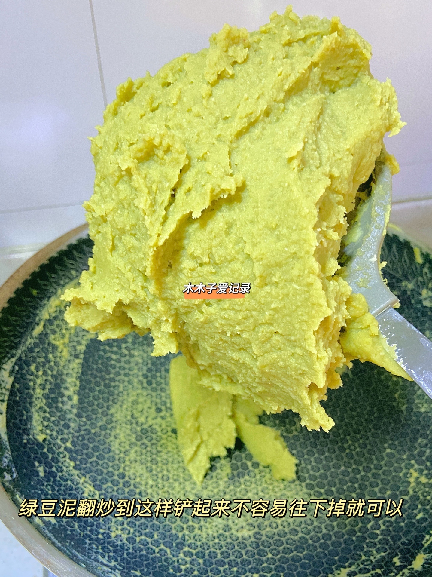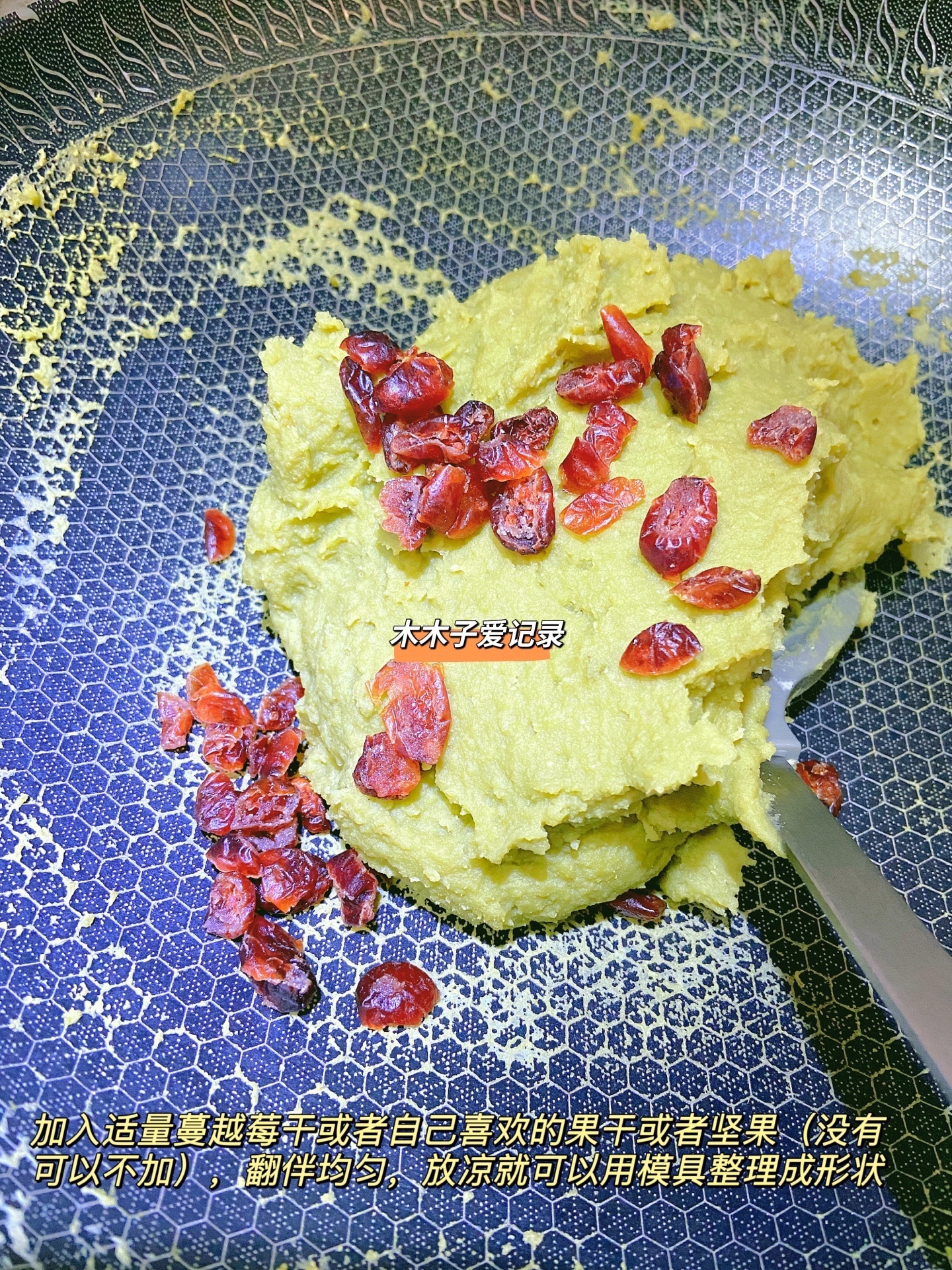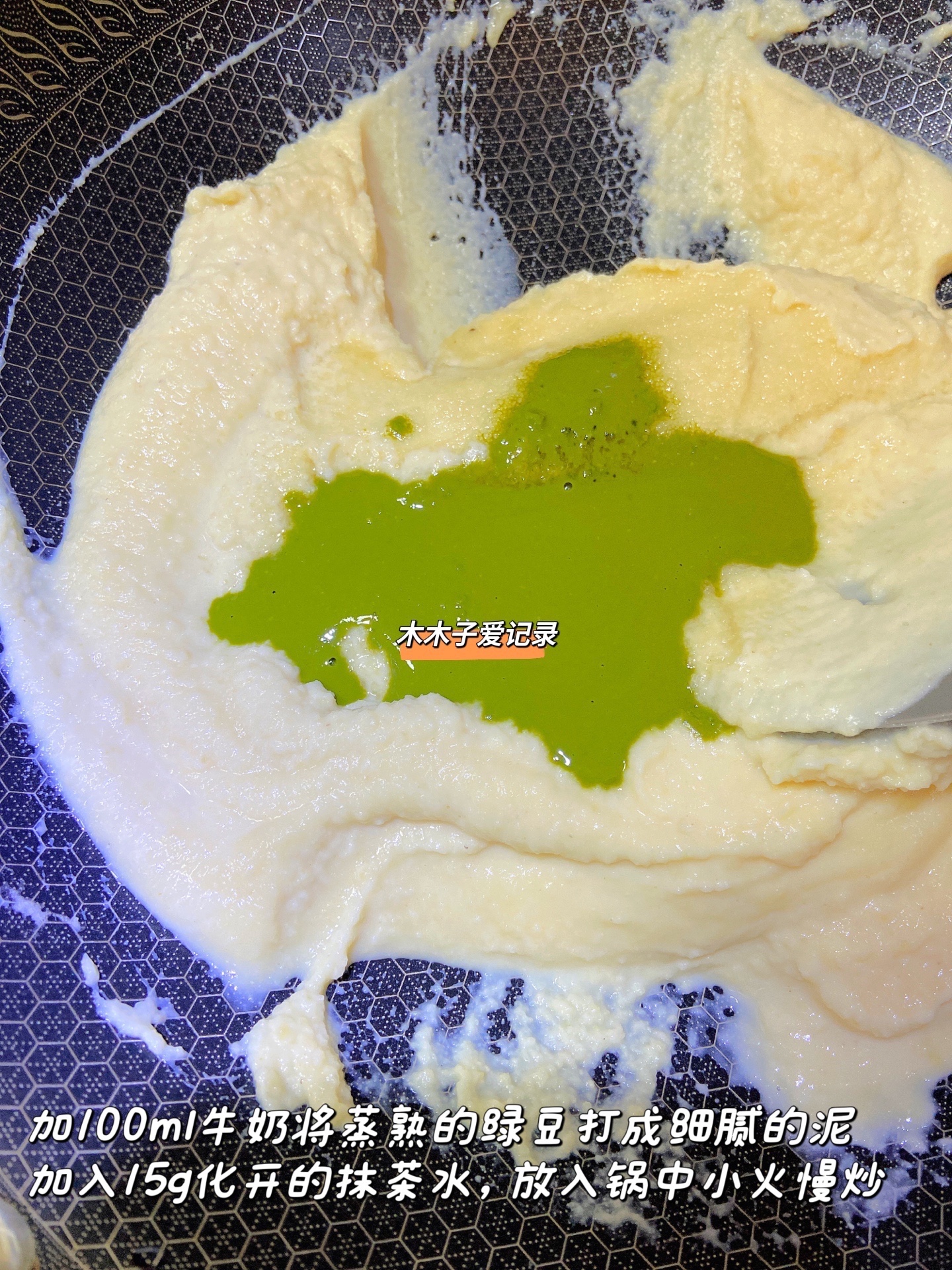 2⃣️ 加入100ml纯牛奶,30g白糖将蒸熟了的绿豆打成细腻的泥,加入15g化开的抹茶水,放入锅中用小火慢炒,大约炒二十分种左右,加入50g麦芽糖继续翻炒,翻炒到绿豆泥用铲子铲起来不容易掉落,加入自己喜欢的果干(没有可不加),放凉后用模具压出形状即可,放入冰箱冷藏两小时,绿豆冰糕的风味会更佳哦……