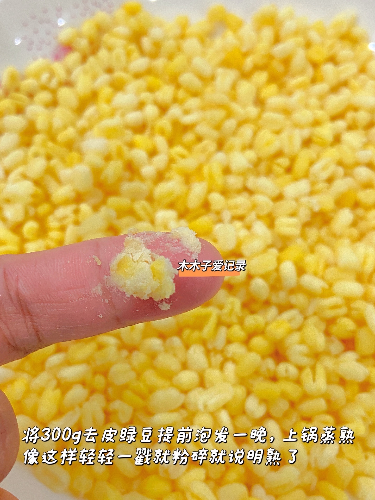 1⃣️将300g去皮绿豆提前泡发一晚上,上锅蒸熟像这样轻轻一戳就粉碎就说明熟了