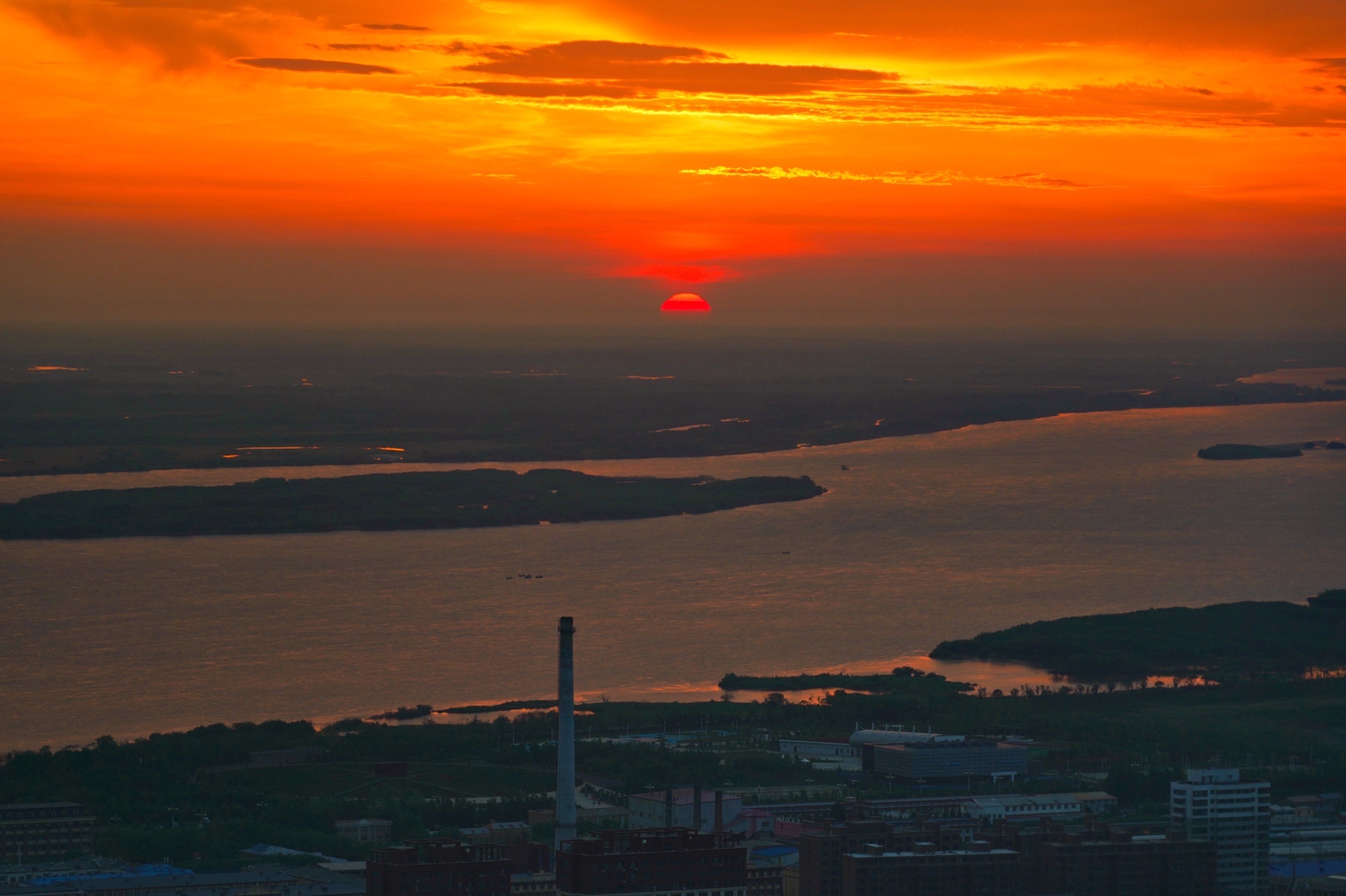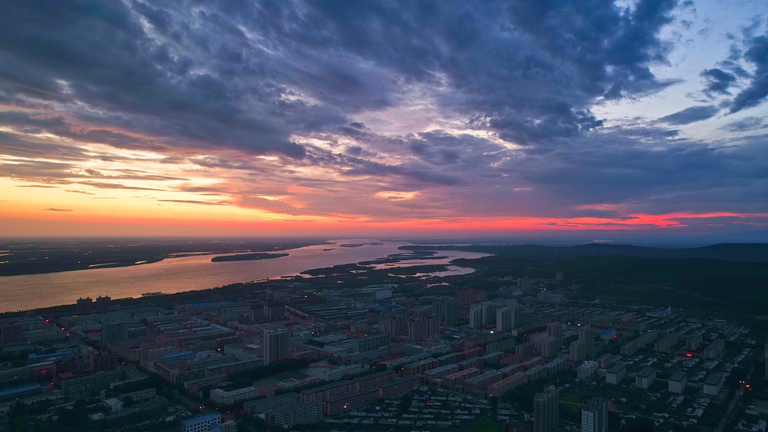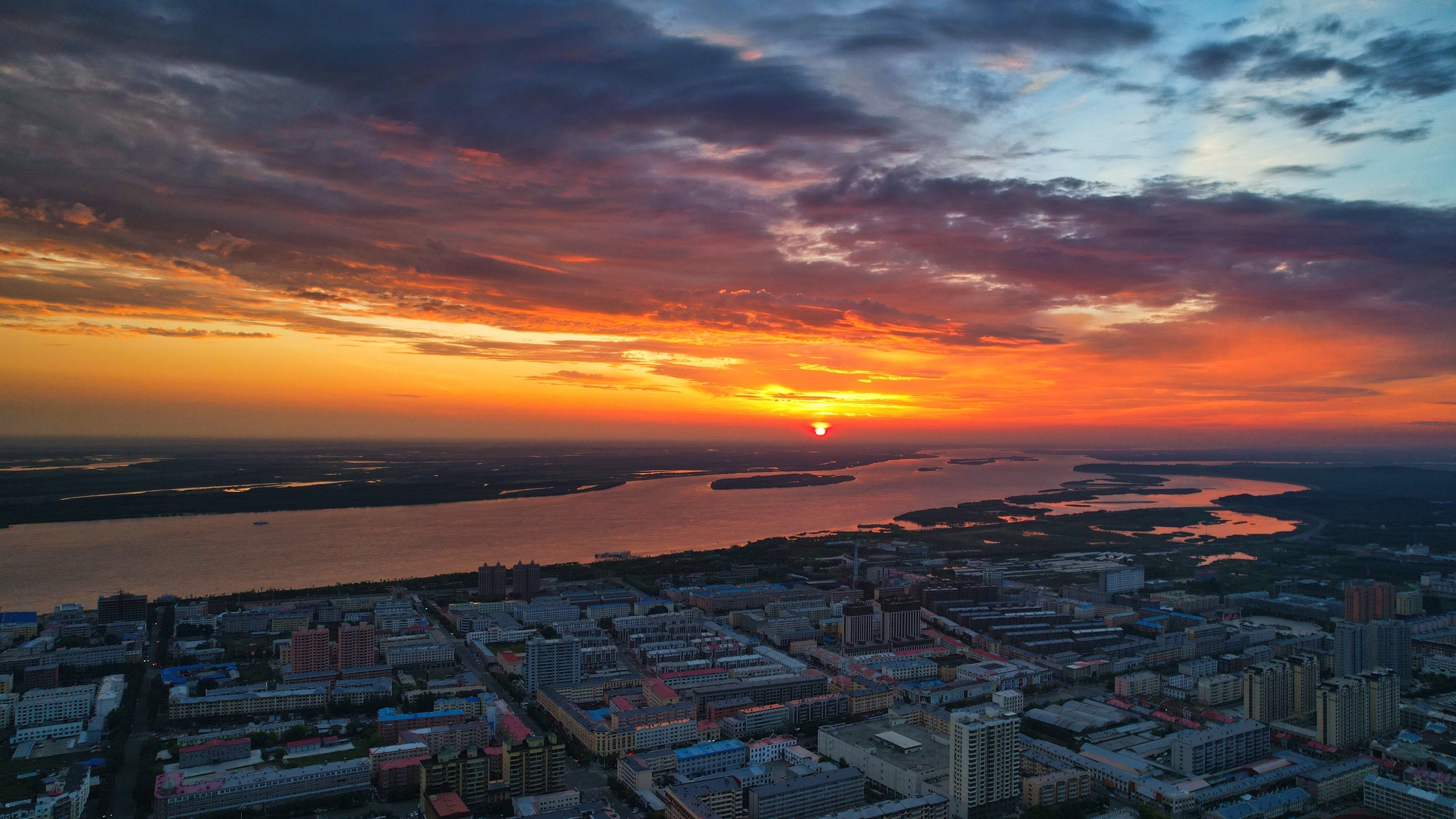 迎着晨曦,旭日从乌苏里江东侧涌出,朝霞染红整个江面,半江瑟瑟,半江绯红。