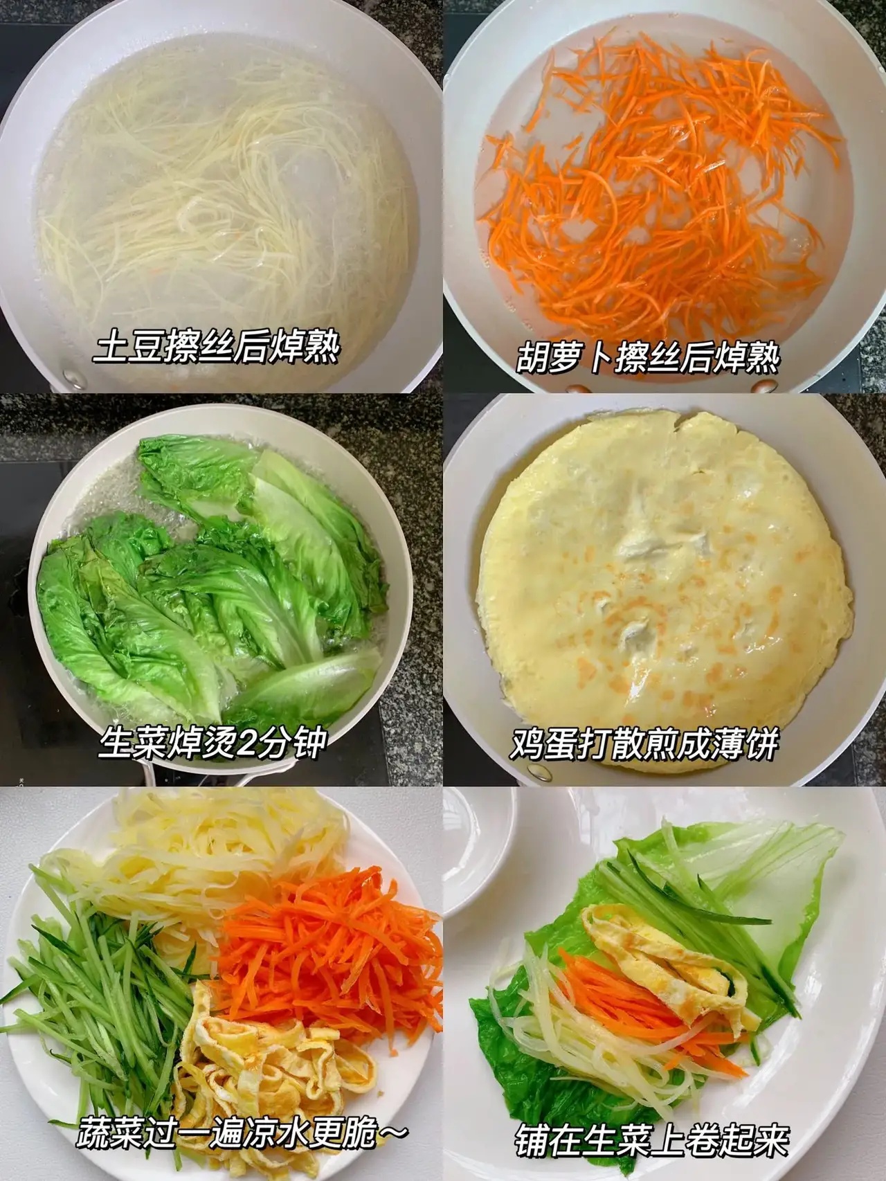 土豆和胡萝卜擦丝后焯熟、生菜焯熟,过一遍凉水。鸡蛋煎成薄饼、黄瓜擦丝。铺在生菜叶上卷起来即可!