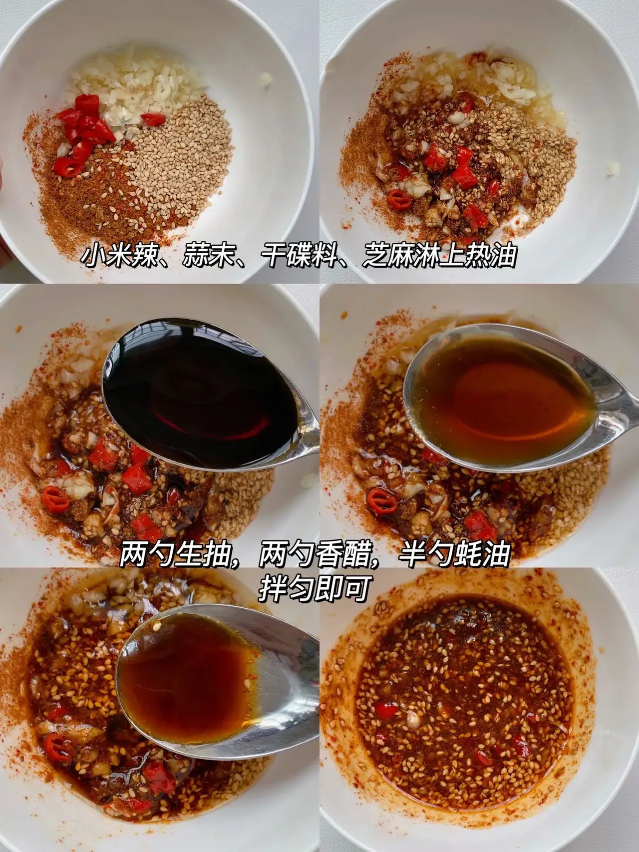 ㊙️料汁:小米辣、蒜末、干碟料、白芝麻淋上橄榄油,再加两勺生抽、两勺香醋、半勺蚝油拌匀