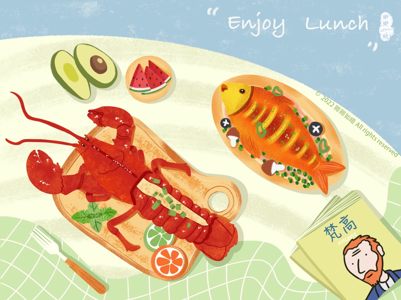 都说早餐要吃好,午餐要吃饱,晚餐要吃少,所以午餐我画了我超爱吃的海鲜——波士顿龙虾和家常红烧鱼!